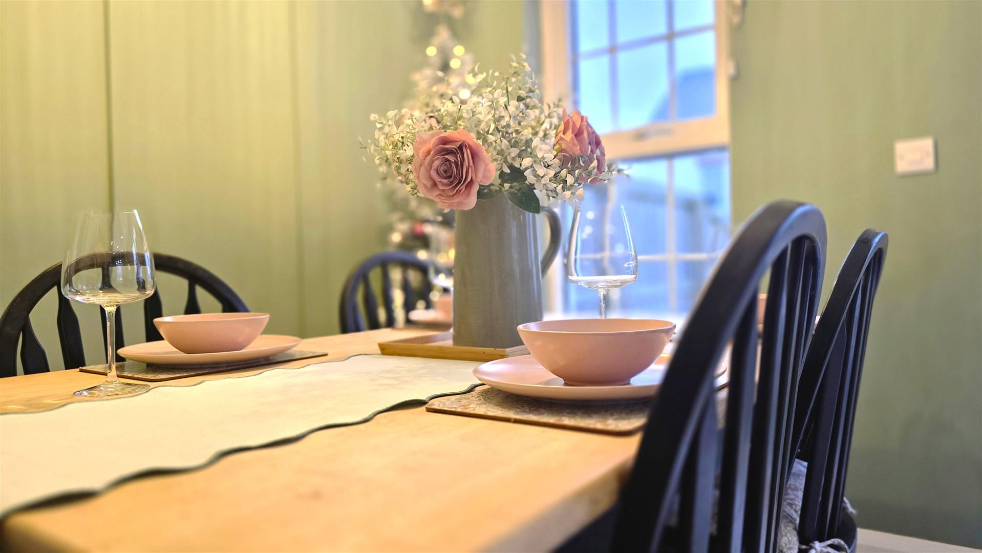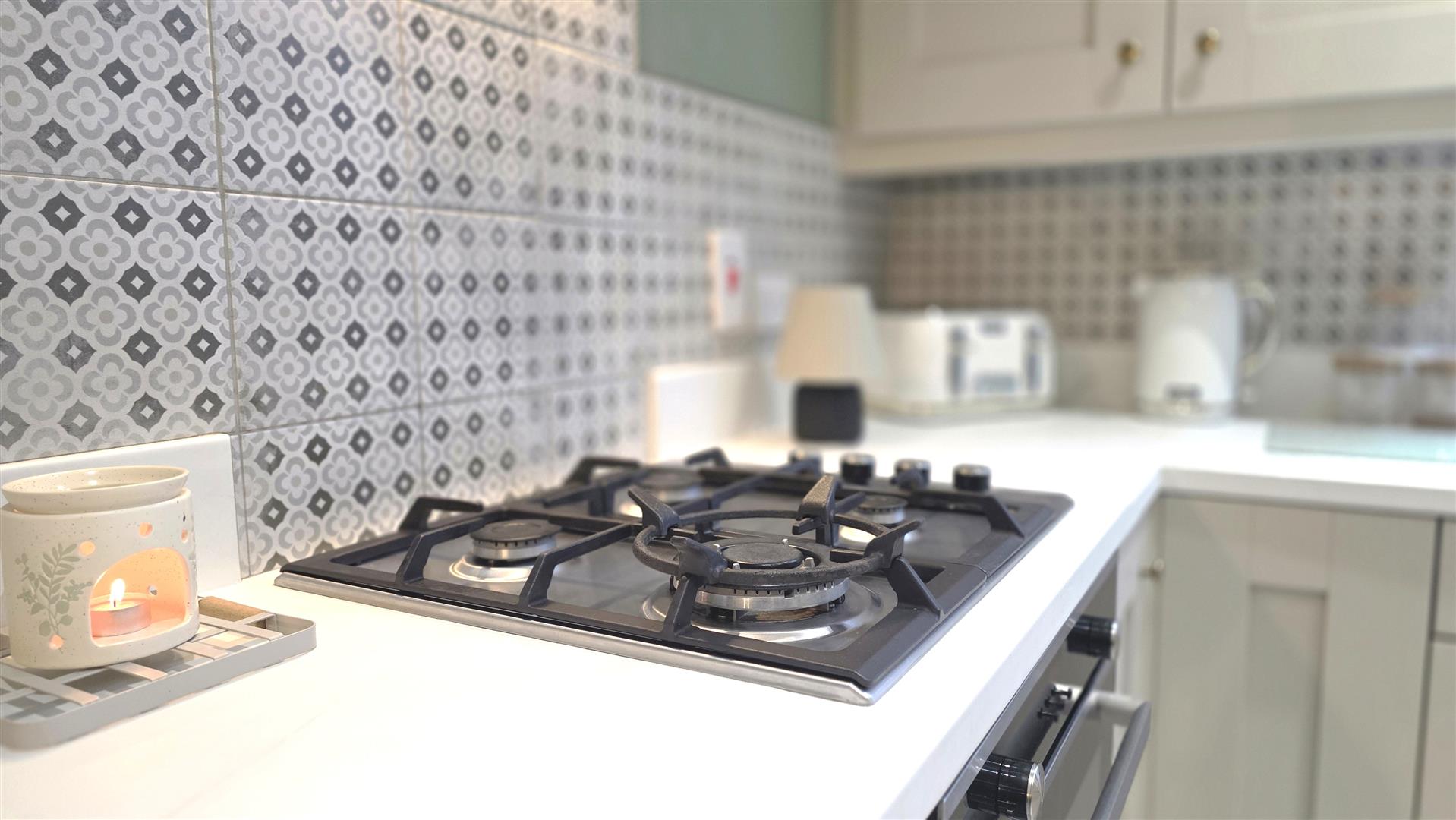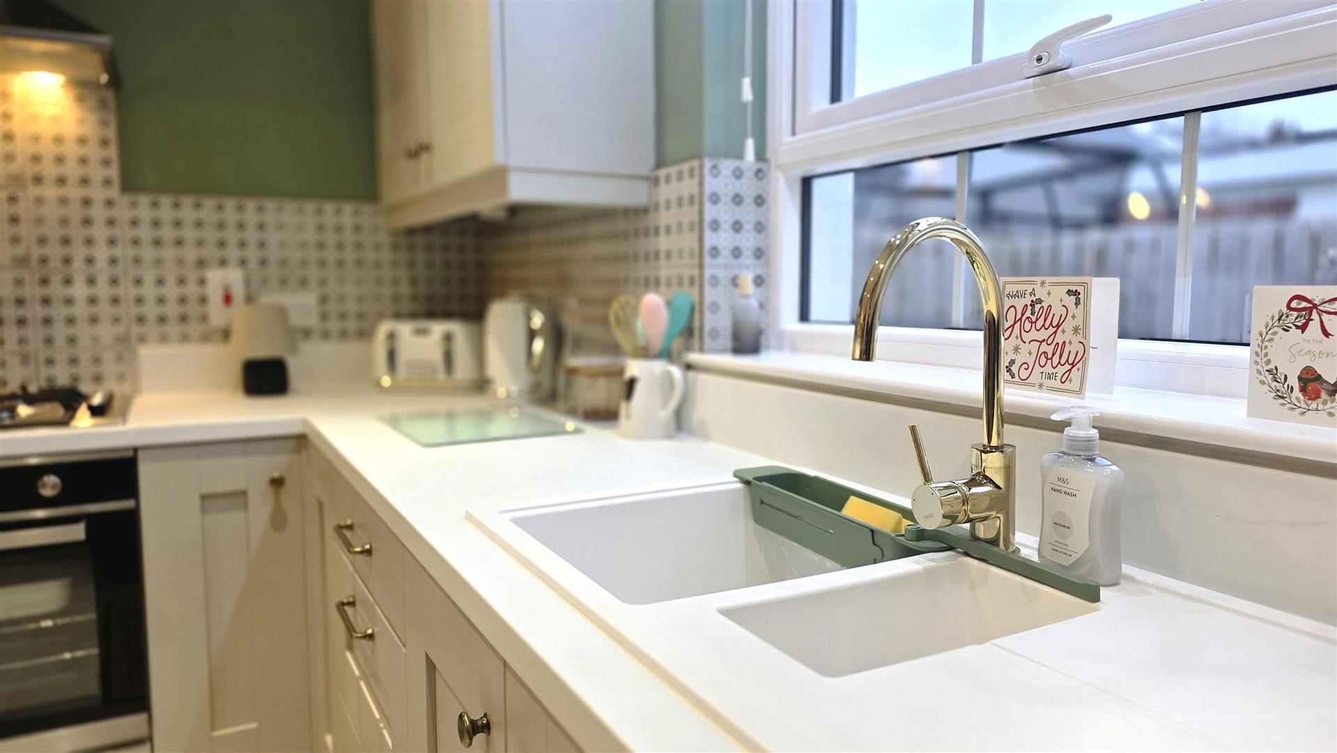The kitchen is a true highlight, showcasing beautiful work surfaces complemented by elegant mid grey 'Shaker' style cupboards. This space is not only functional but also aesthetically pleasing, making it ideal for both cooking and entertaining.