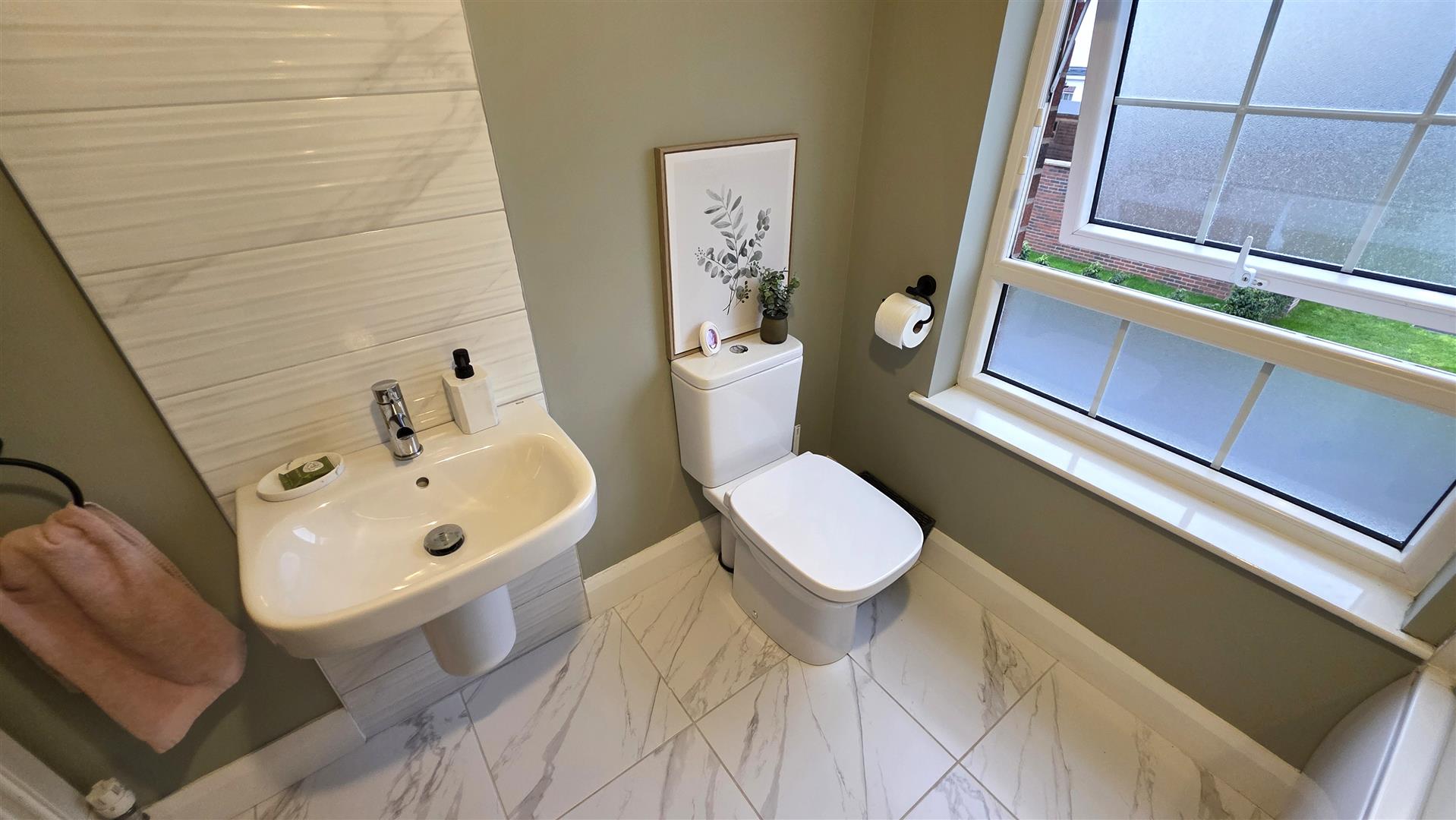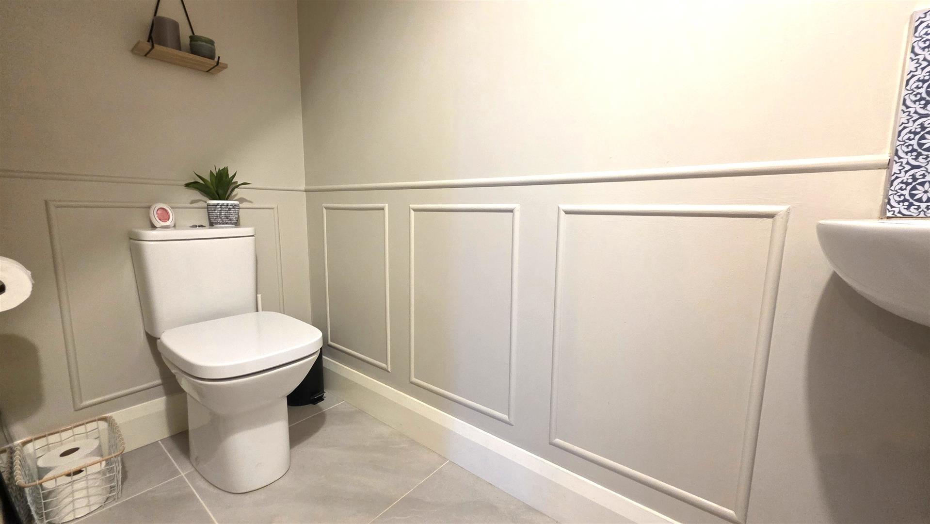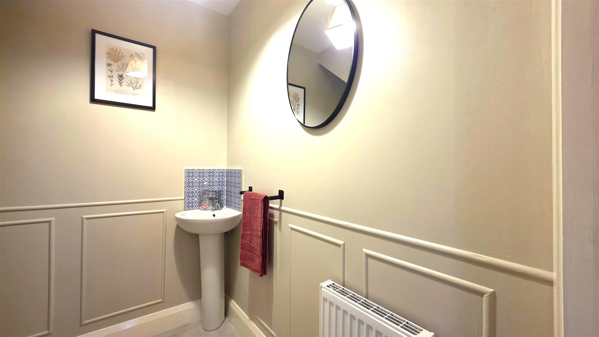 Mode white suite comprising a corner pedestal wash hand basin with 'Monobloc' chrome mixer tap and decorative tiled splashback. Low flush push button WC. Feature wood panelled walls. Understairs storage cupboard. Extractor fan. Fully tiled flooring. Single radiator.