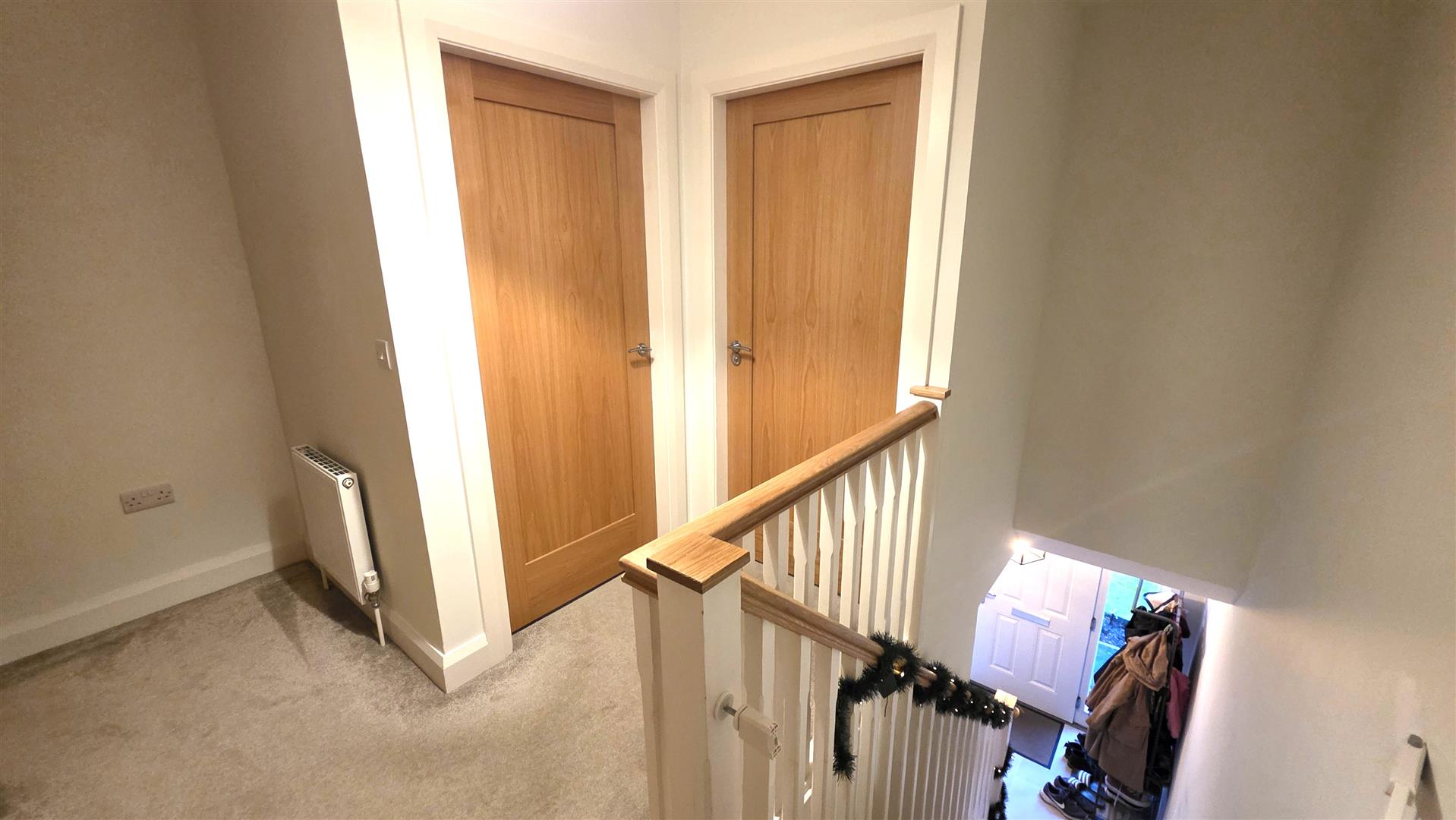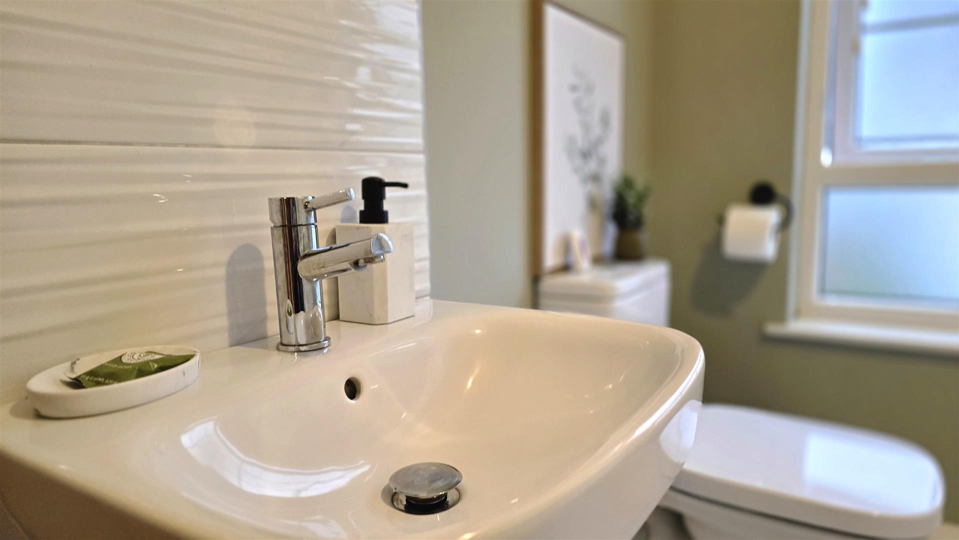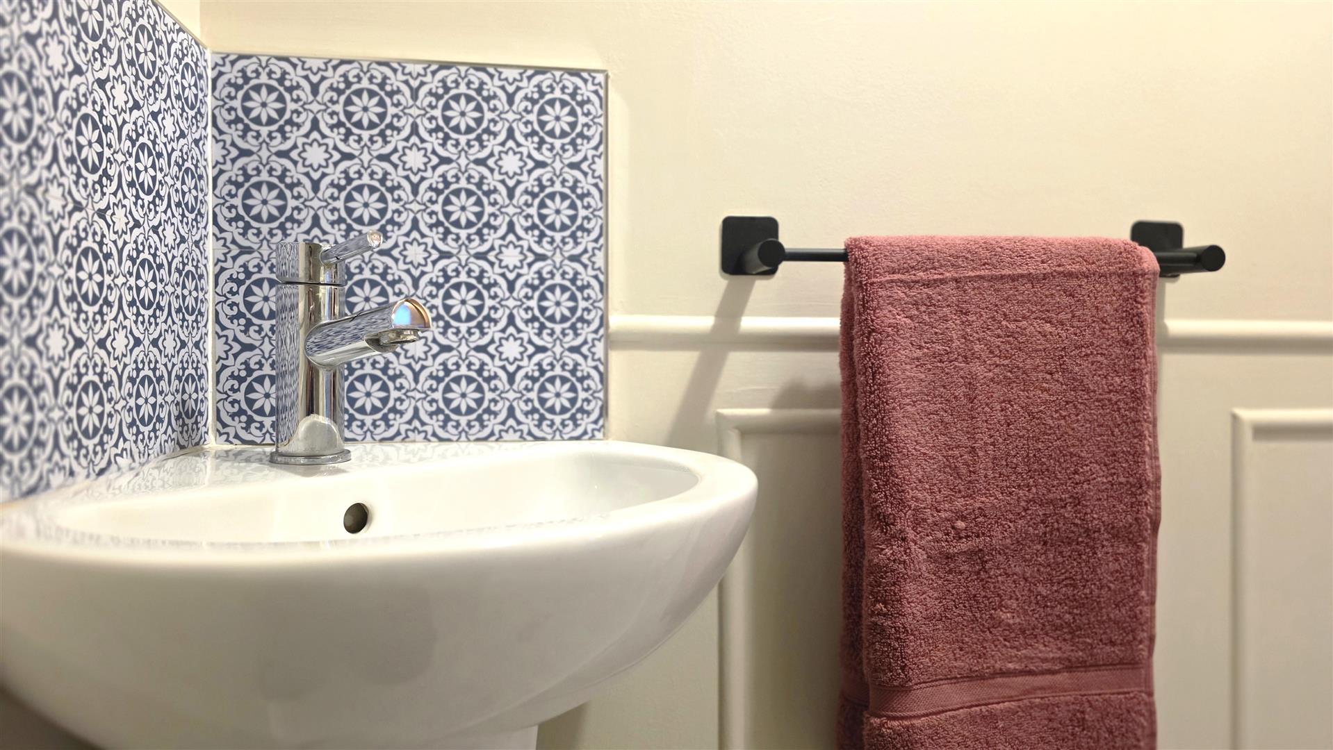 Mode white suite comprising a corner pedestal wash hand basin with 'Monobloc' chrome mixer tap and decorative tiled splashback. Low flush push button WC. Feature wood panelled walls. Understairs storage cupboard. Extractor fan. Fully tiled flooring. Single radiator.
