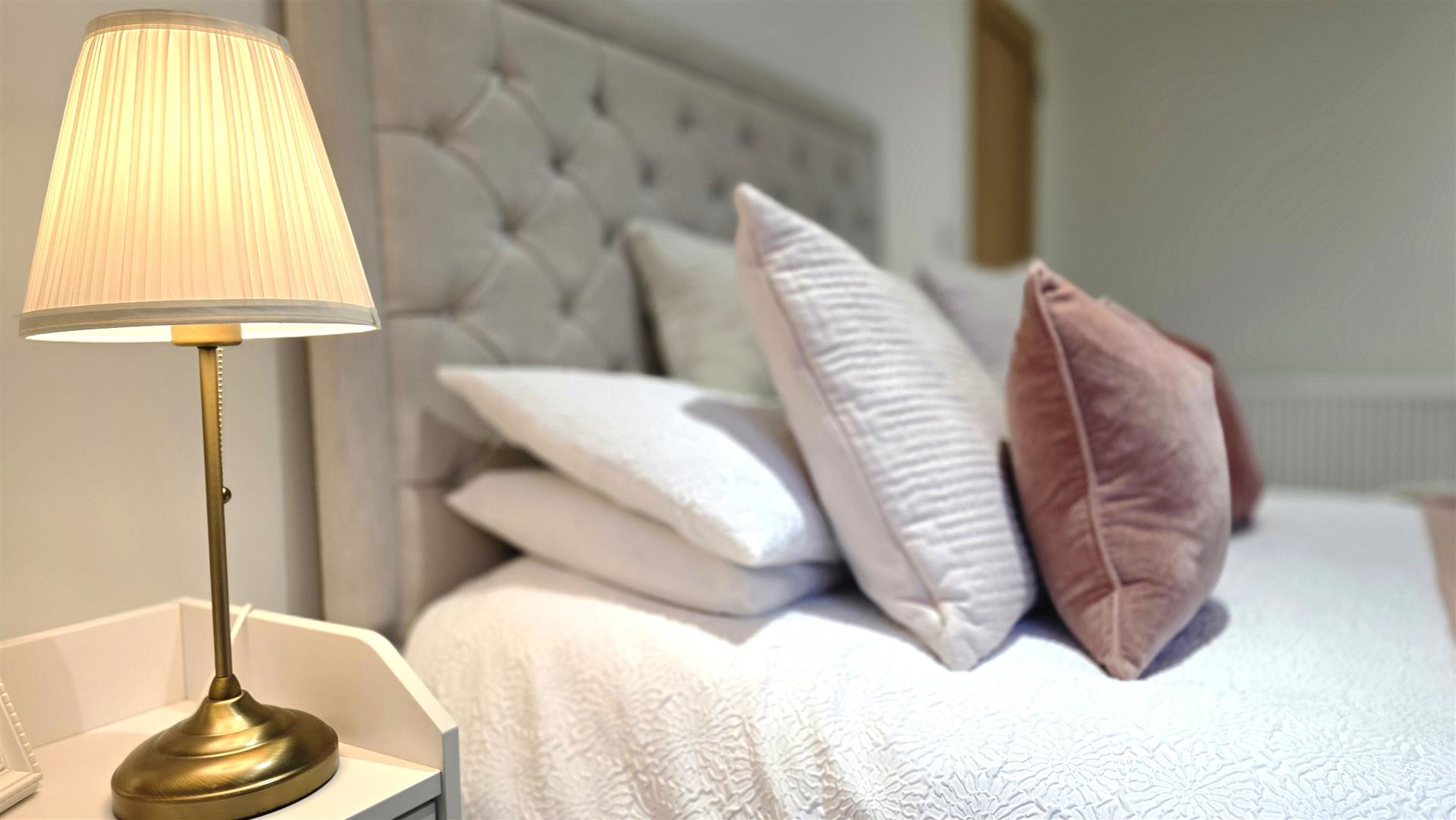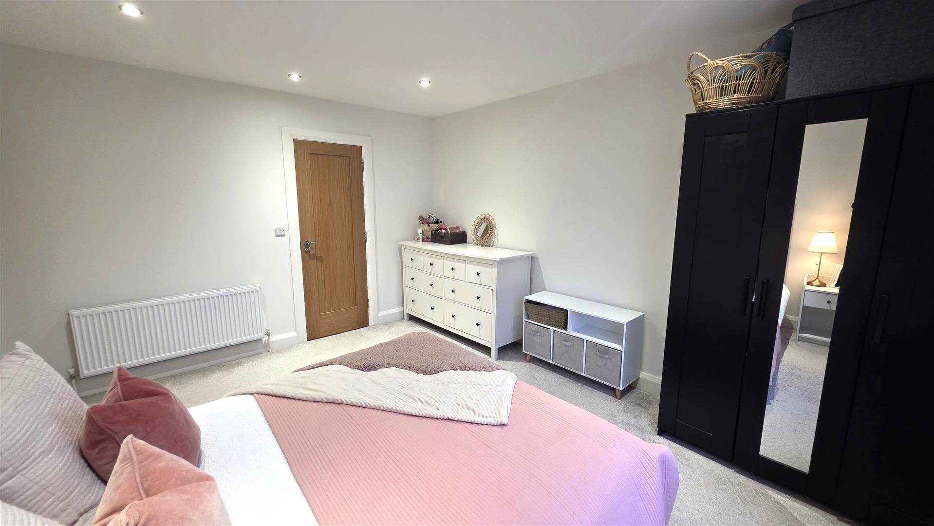 Generous principle bedroom suite with low voltage down lighting and a single radiator.