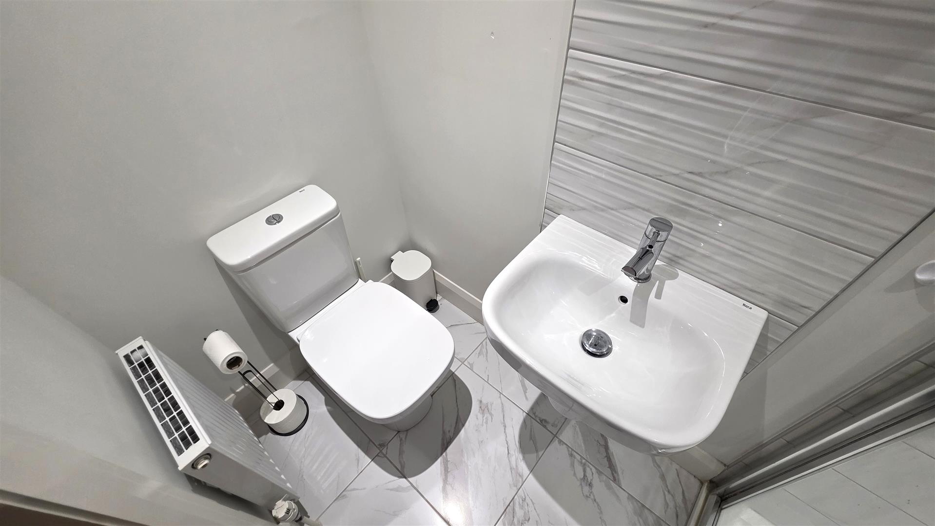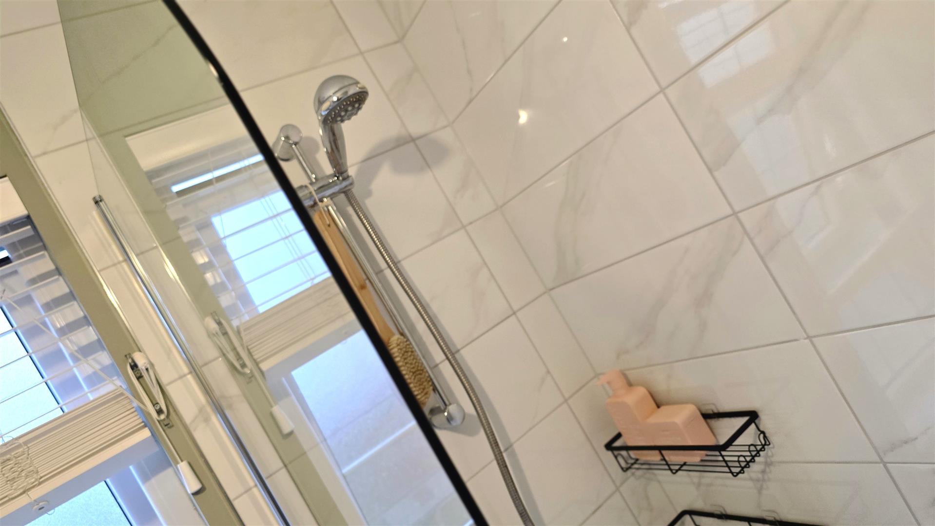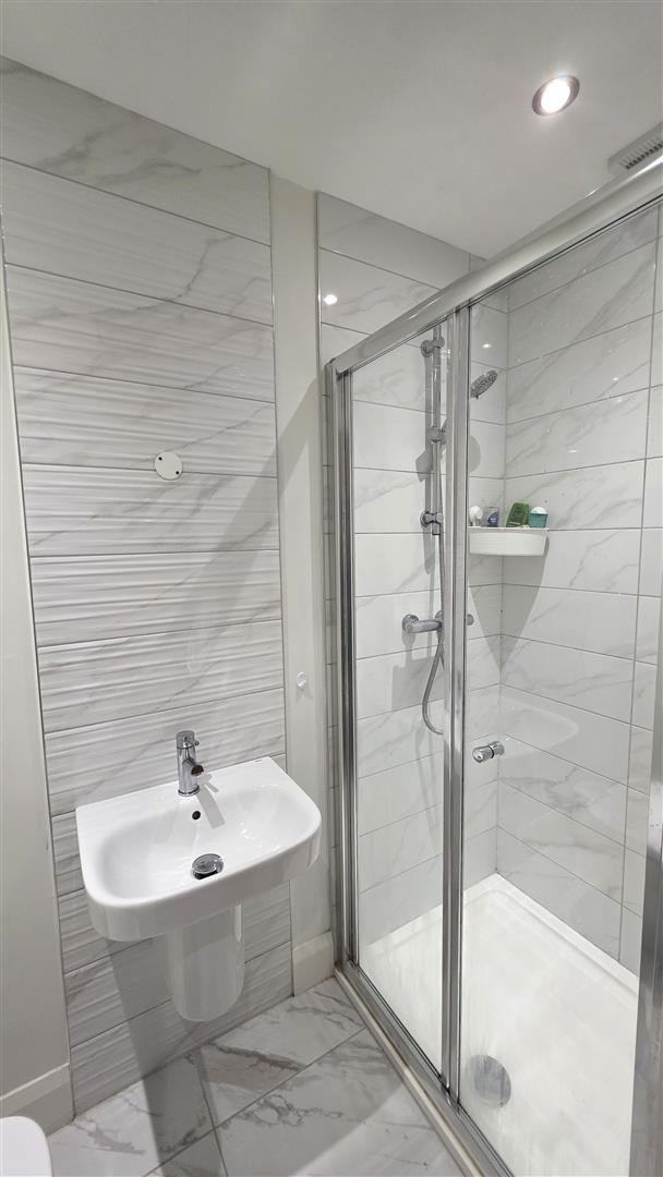 Modern white suite comprising a wall to wall shower with fully tiled splashback and glazed folding doors. A wall mounted wash hand basin with 'monobloc' chrome mixer tap and floor to ceiling tiled splashback. Low flush push button WC. Extractor fan. Low voltage down lighting. Single radiator.