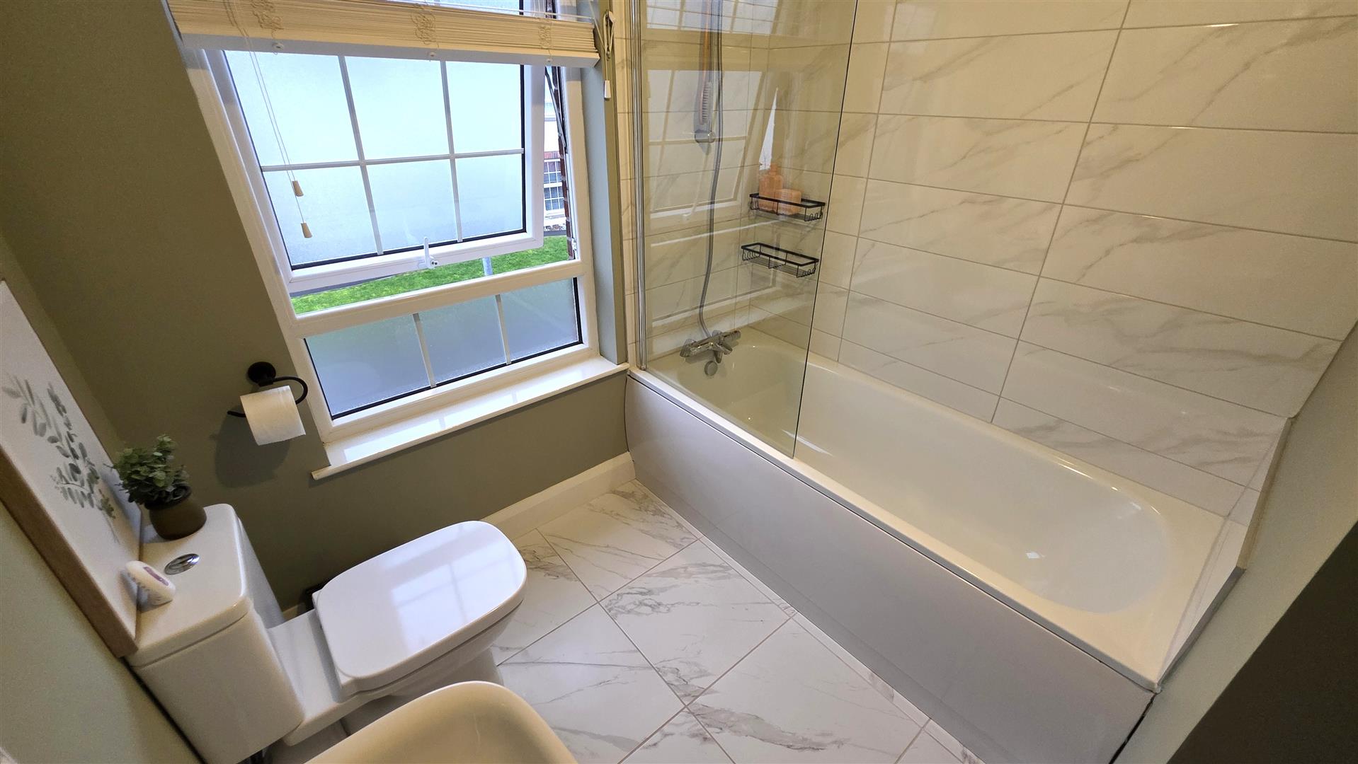 Modern white suite comprising a panel bath with mains shower over, fully tiled splashback and glazed screen. A wall mounted wash hand basin with floor to ceiling tiled splashback and 'monobloc' chrome mixer tap. Low flush push button WC. Extractor fan. Fully tiled floor. Single radiator.