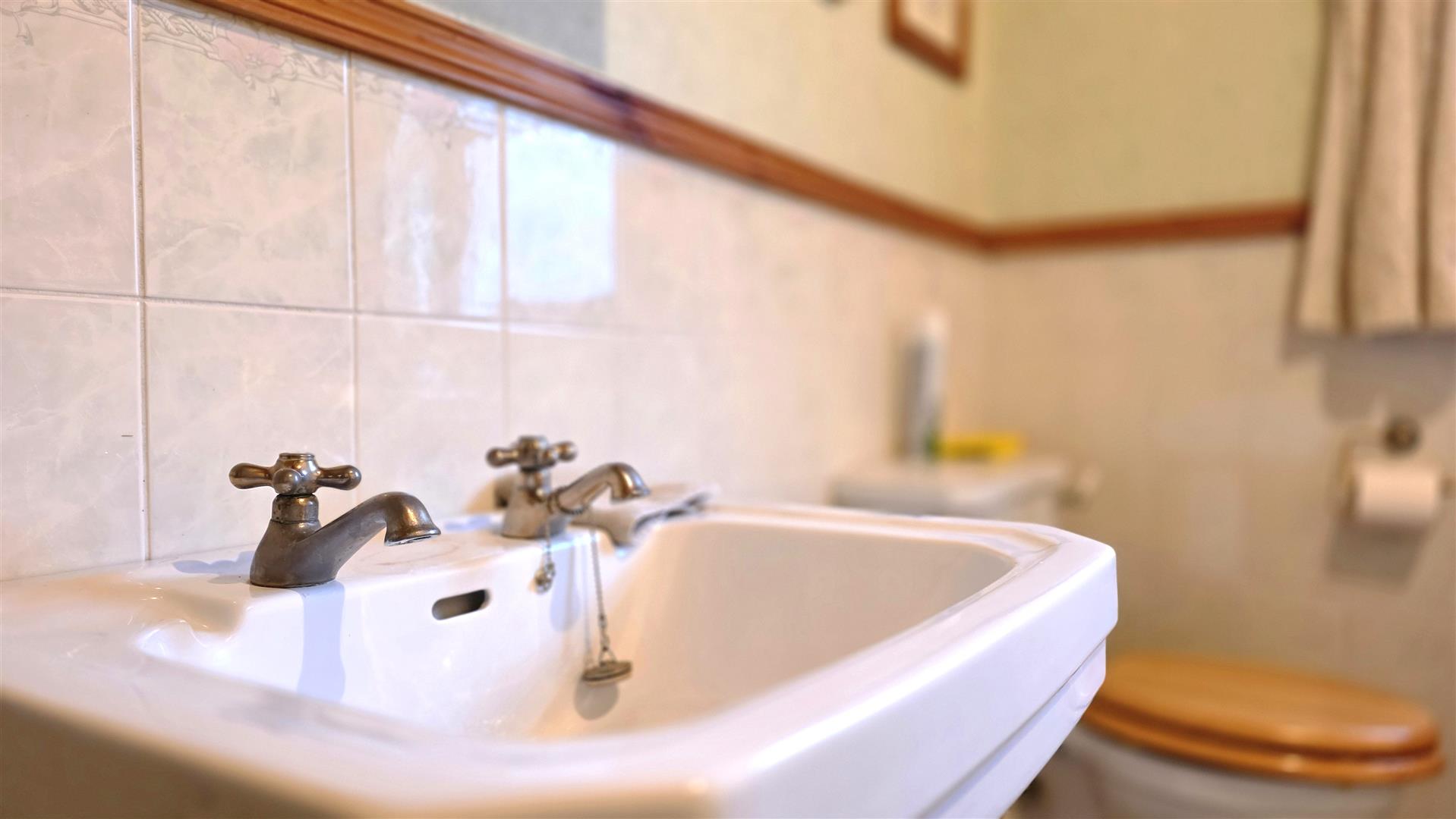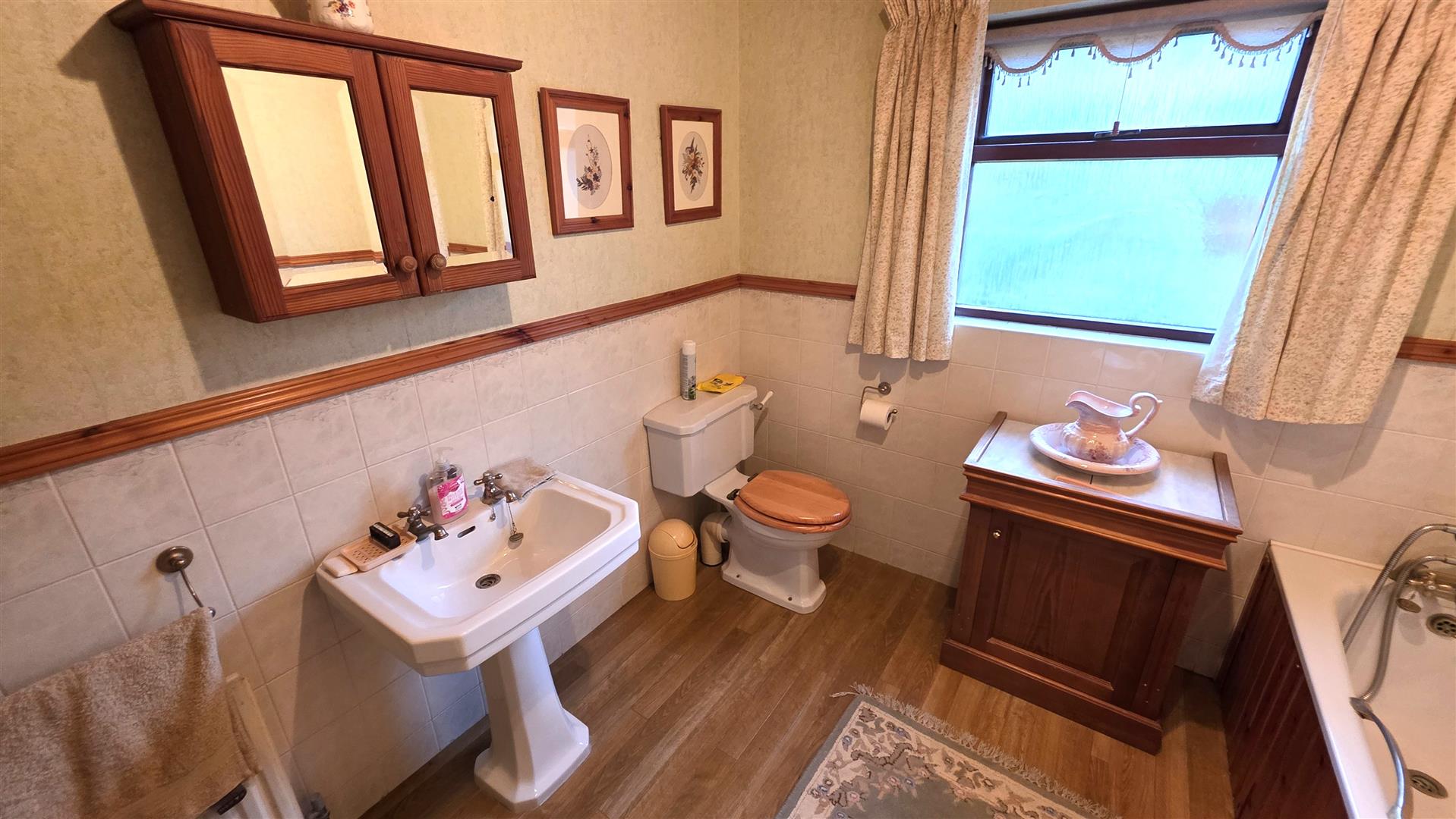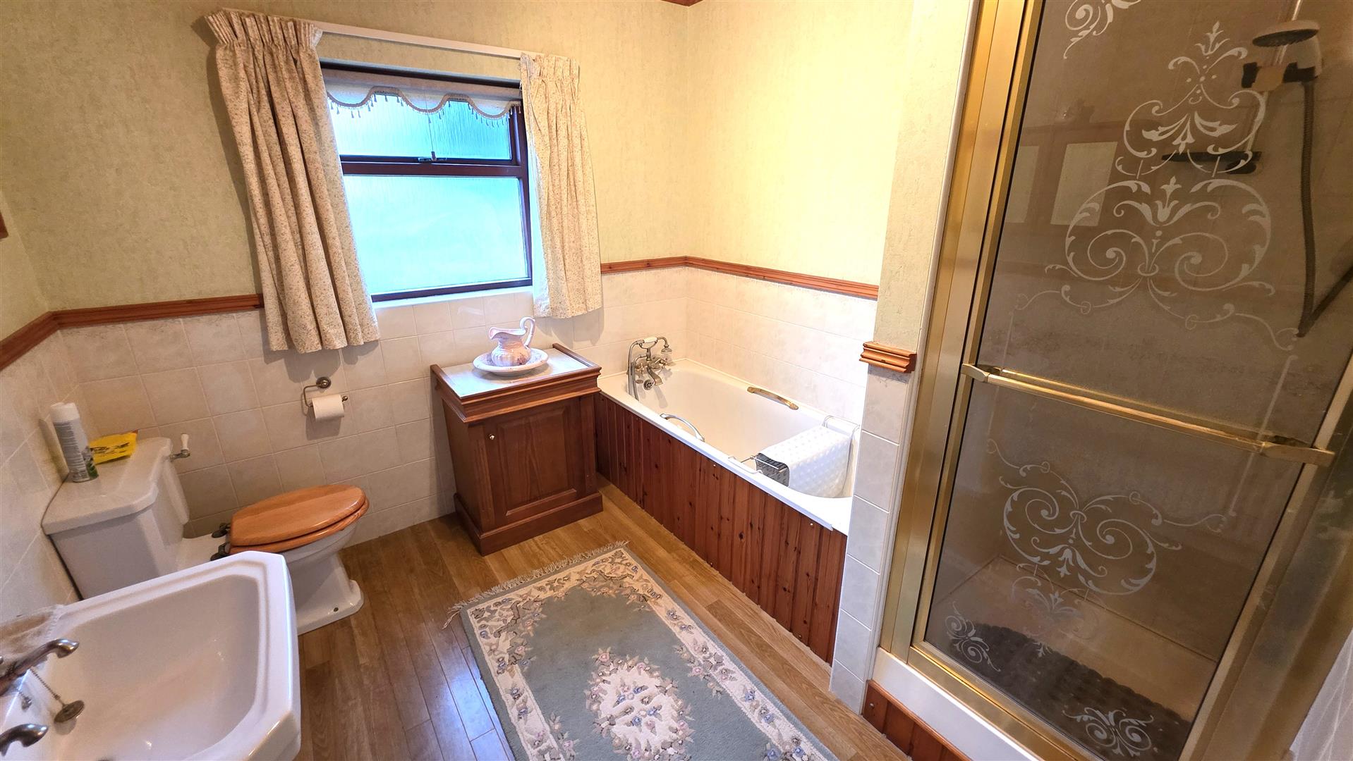 Four piece suite comprising a wood panel bath with brass 'Victorian' style mixer with shower attachment. and an enclosed shower with 'Redring' electric shower, fully tiled splashback and partially glazed door. Pedestal wash hand basin with stainless steel taps. Low flush WC. Partially tiled walls. 'Amtica' flooring. Single radiator.