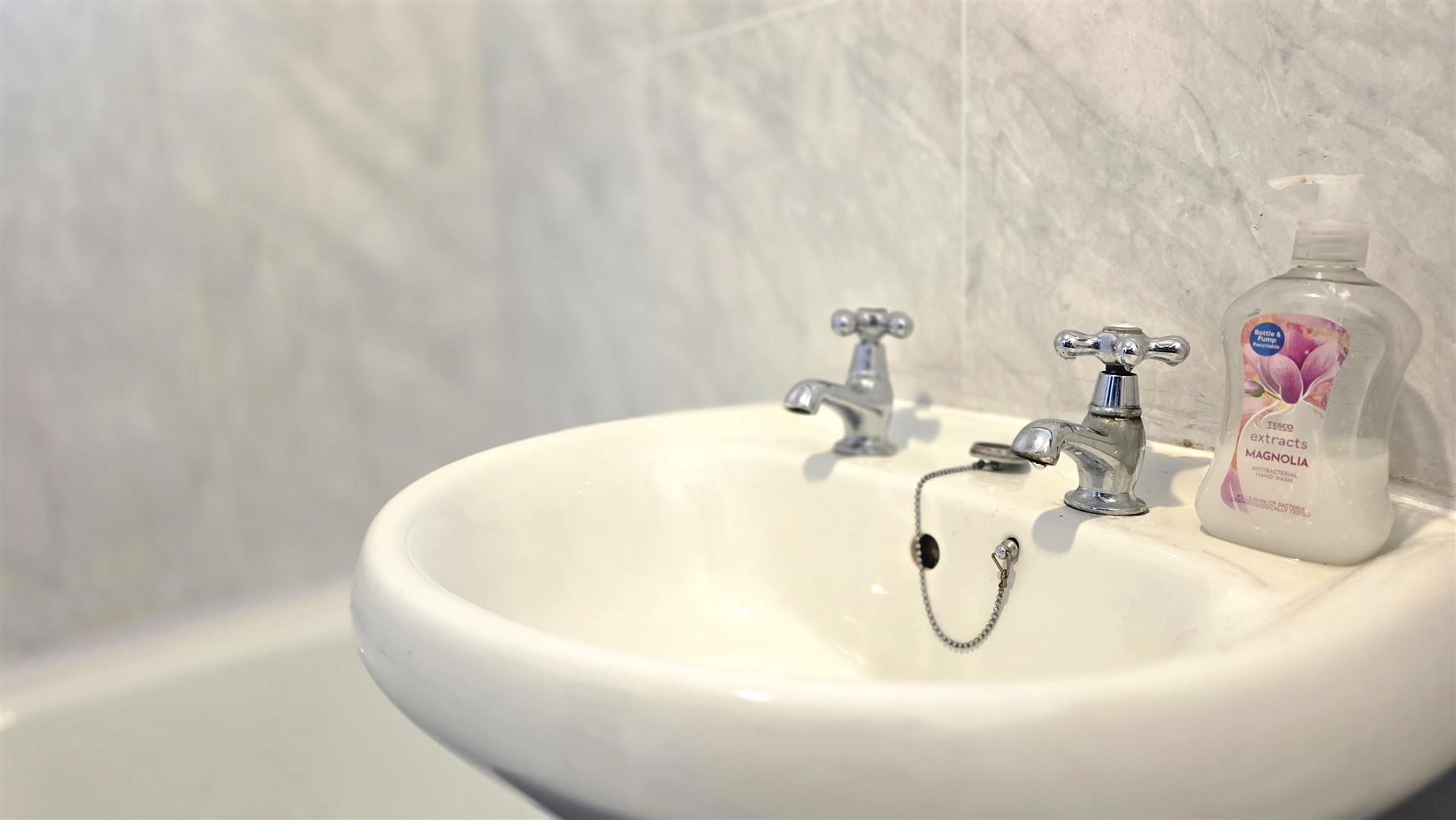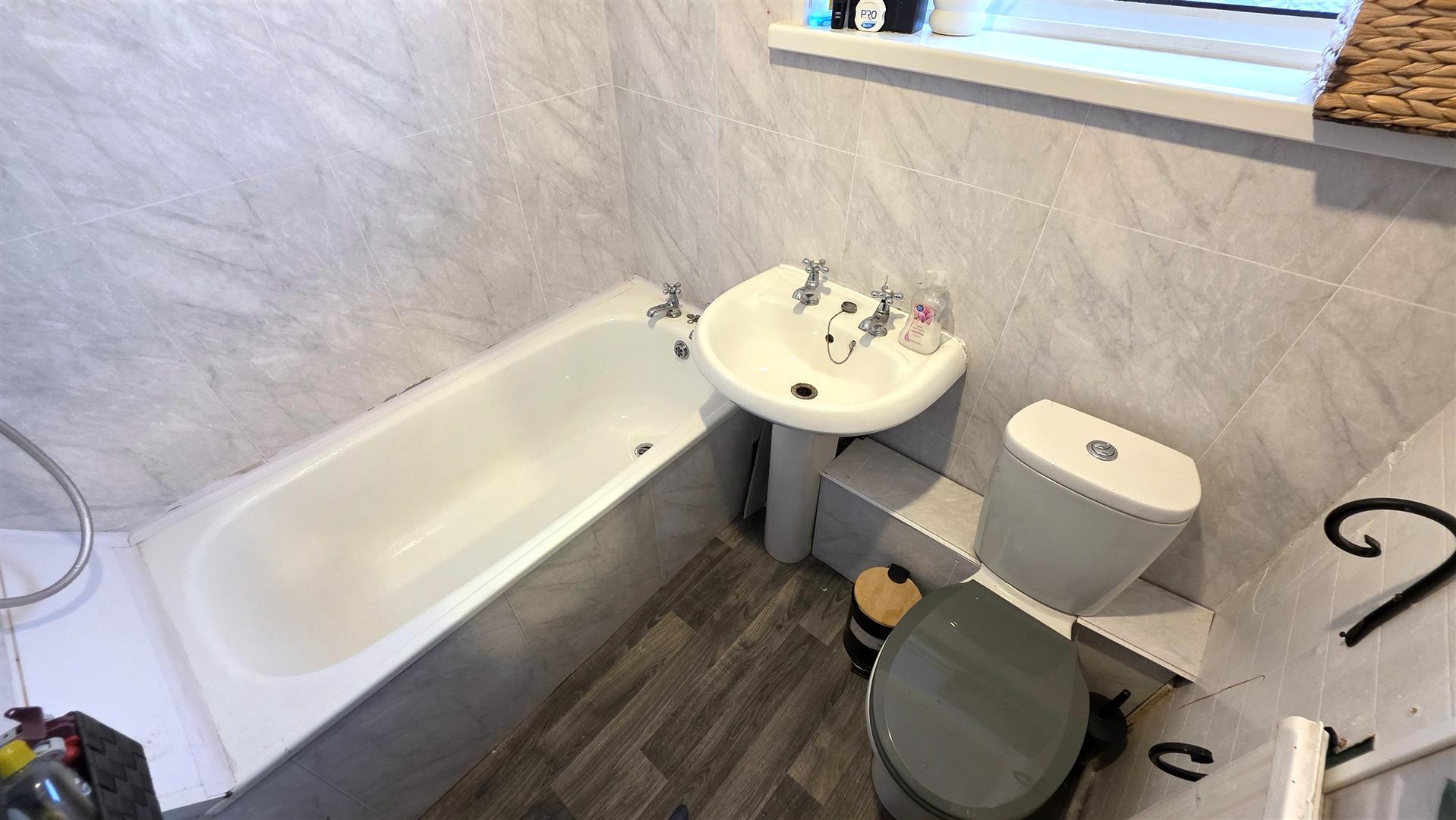 White suite comprising panelled bath with thermostatic shower over. Low flush W/C and pedestal wash hand basin. Tiled effect PVC wall panelling to bath area. Single radiator.