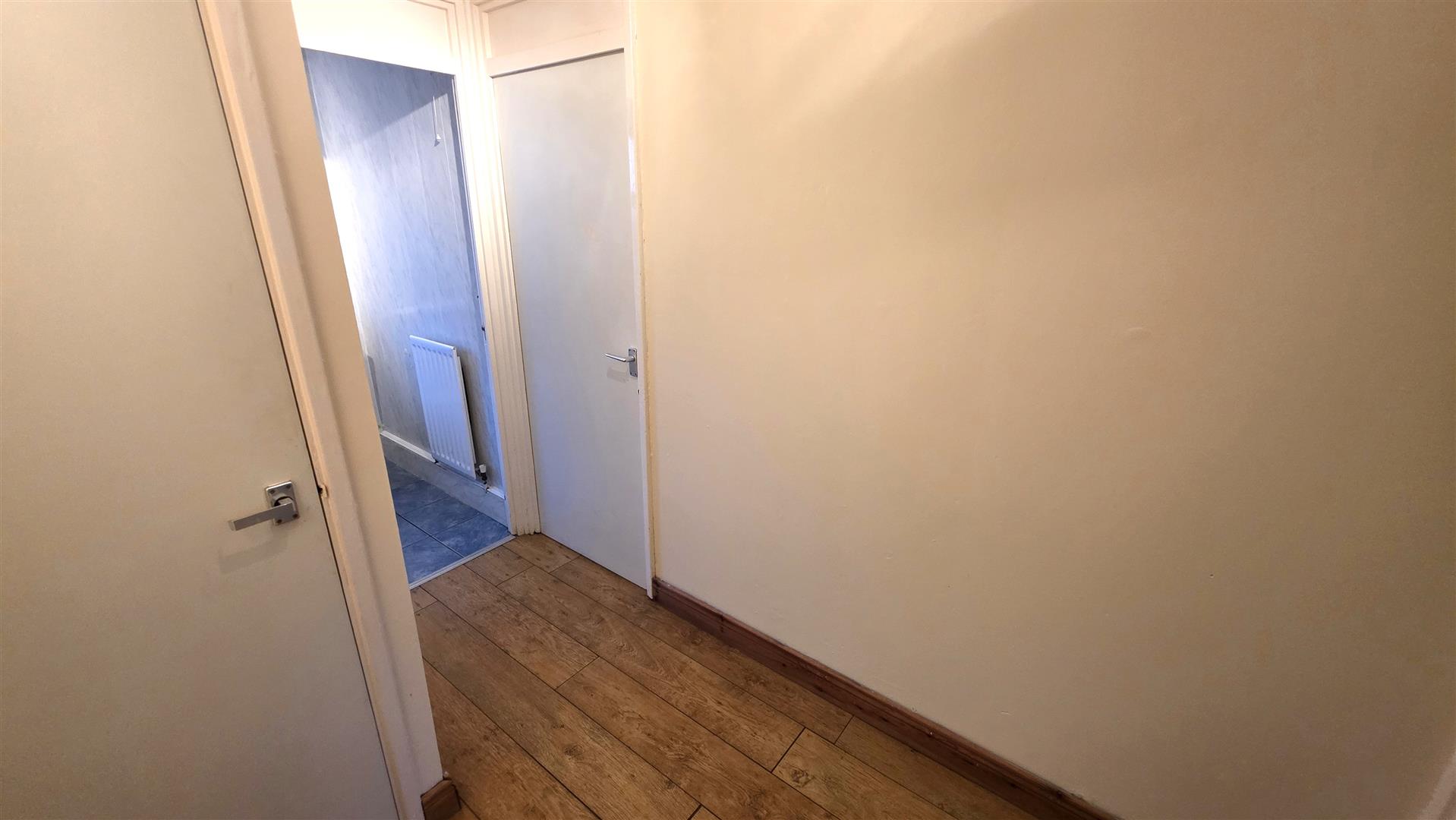 Inner hall with wood laminate floor and storage cupboard.