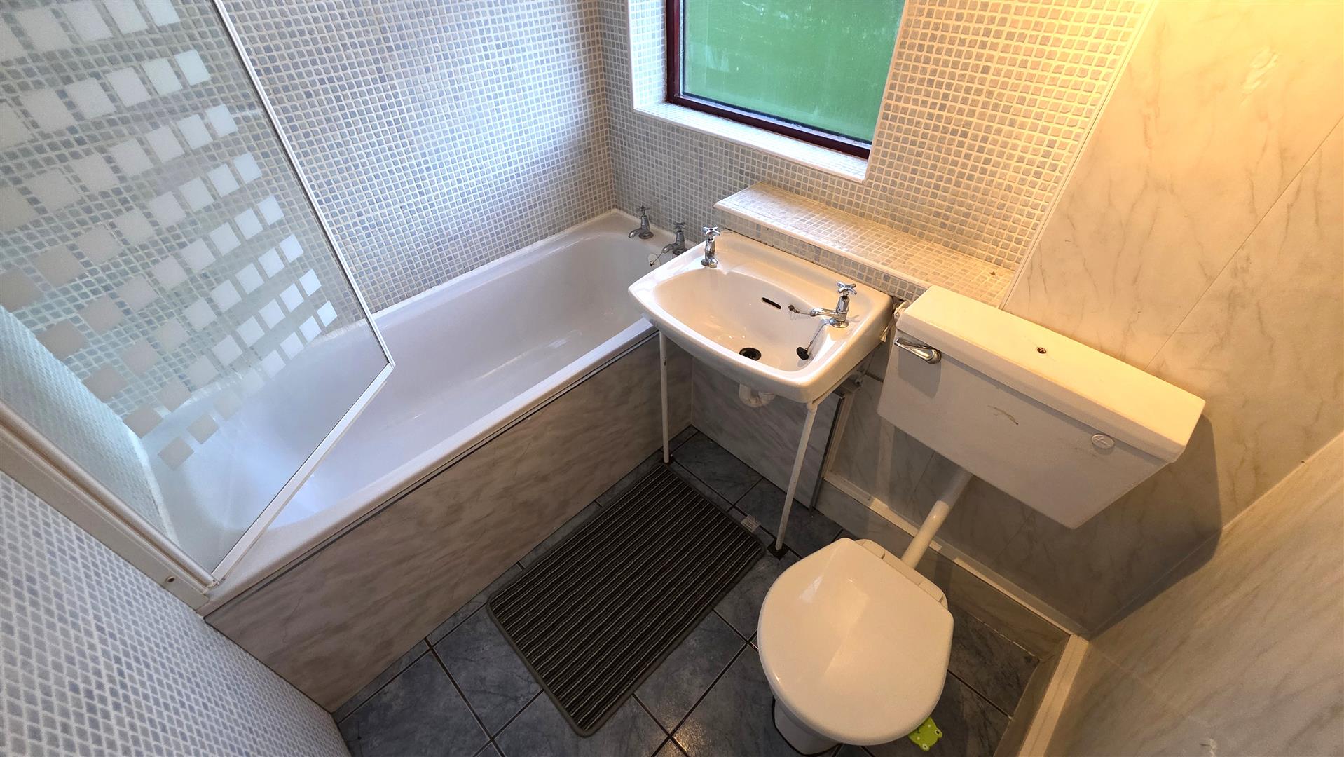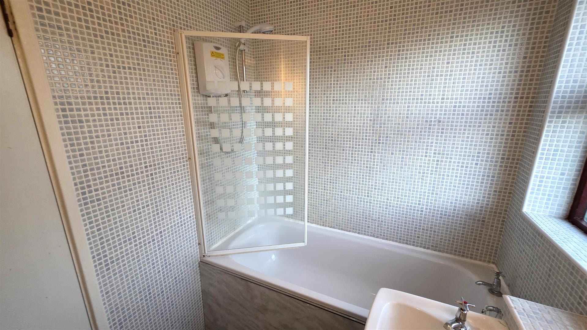 White suite comprising panel bath with 'Aqualisa' electric shower over and partially glazed screen. Low flush W/C and wash hand basin. Partially tiled and partially PVC clad walls. PVC clad ceiling. Fully tiled floor. Single radiator.