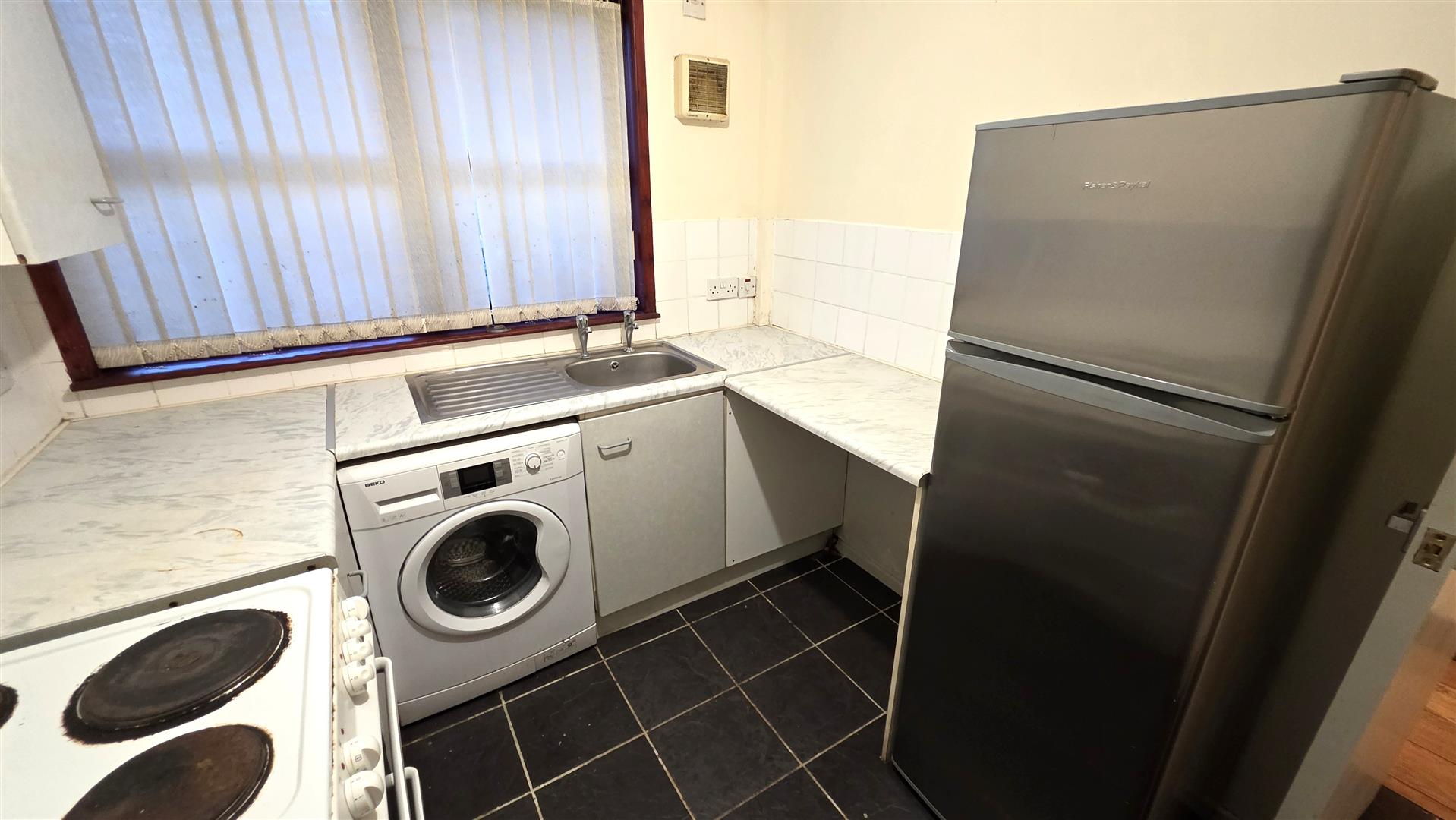 Full range of high and low level units with complimentary work surfaces. Single drainer stainless steel sink unit. Space for cooker and fridge freezer. Plumbed for washing machine. Partially tiled walls to work surfaces. Fully tiled floor. Extractor fan. Single radiator.
