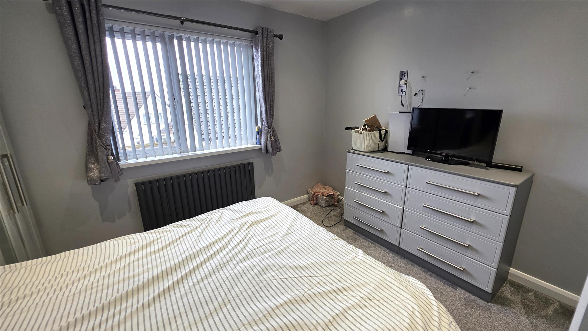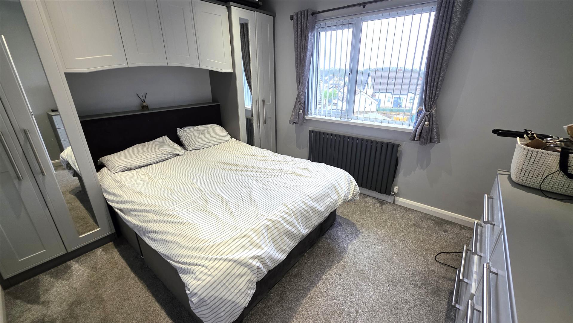 Full range of grey coloured wood grain effect built in bedroom furniture comprising 1 double wardrobes with part mirrored doors , over head lockers and matching bed head. Complimentary drawer set. Low voltage down lights. Contemporary style radiator.
