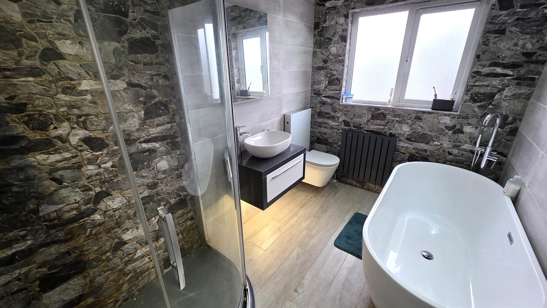 Recently installed modern white four piece bathroom suite to include free-standing bath and off-set quadrant shower cubicle with feature "Z-stone" wall tiling