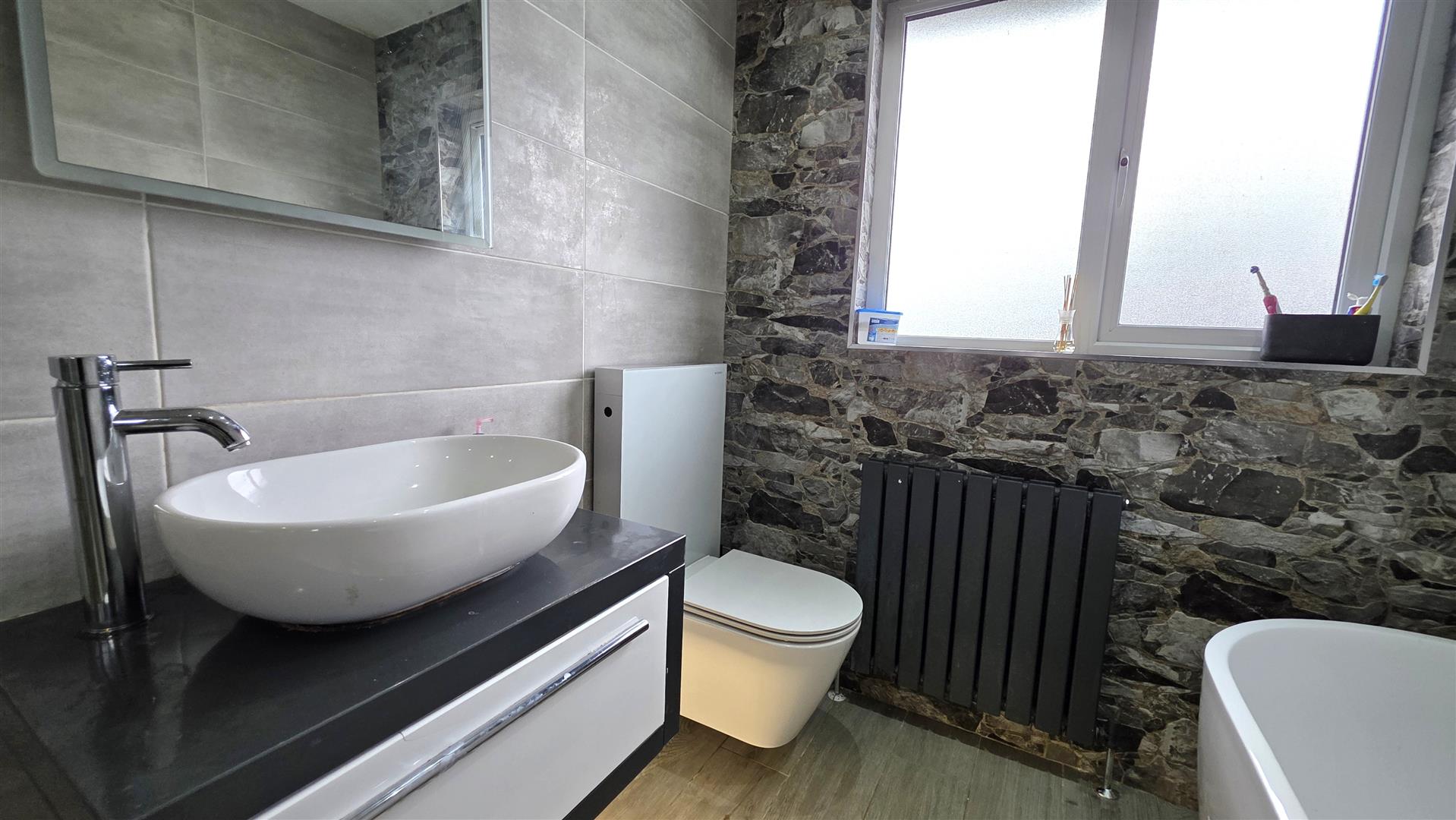 Modern white suite comprising free standing double ended bath with feature polished chrome water pipes and pencil hand shower attachment. "Geberit" feature wall mounted low flush W/C and contemporary style bowl wash hand basin with free standing mixer taps resting on a wall mounted storage cabinet with pull-out drawer below. Low threshold offset quadrant shower cubicle with thermostatic shower unit to include drench shower head and hand held shower. Feature "Z-stone" stone walling and sliding cubicle doors. Fully tiled walls with "Z-stone" feature wall and grey wood grain effect floor tiling. Low voltage down lights. Extractor fan. Contemporary style radiator.