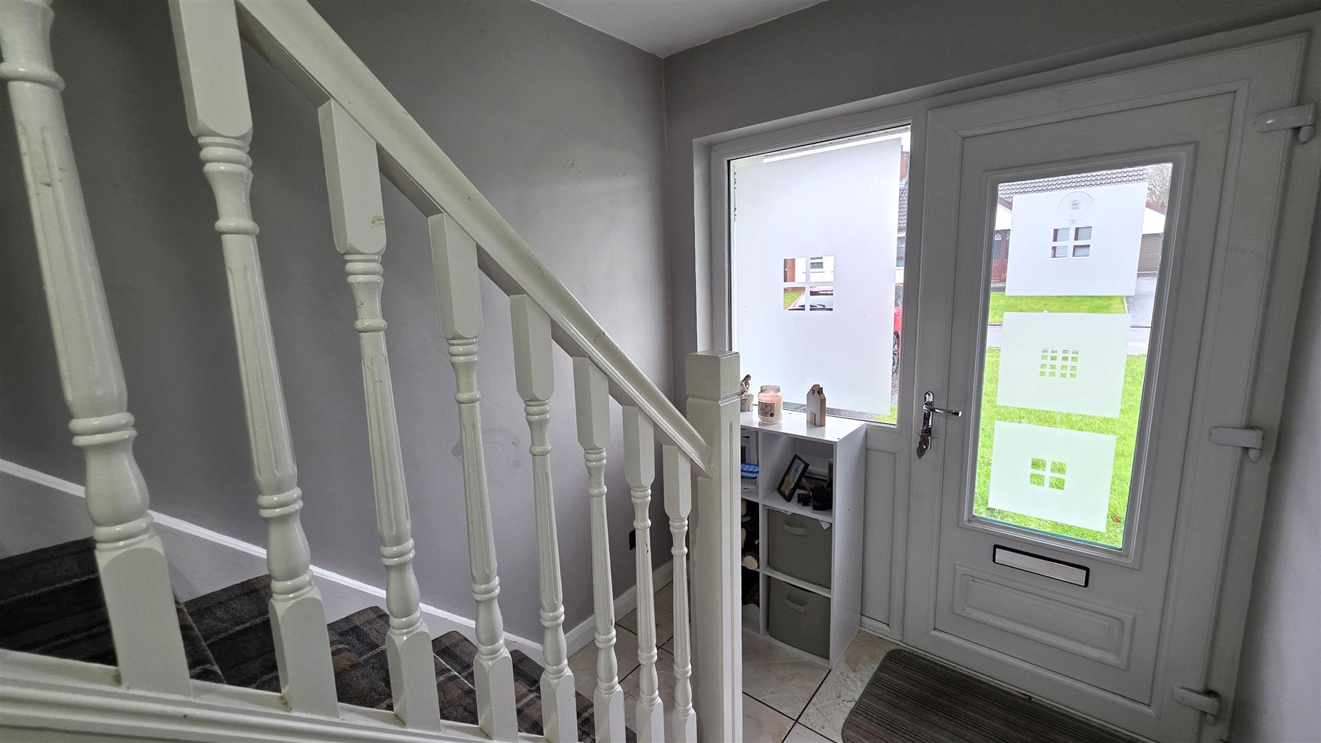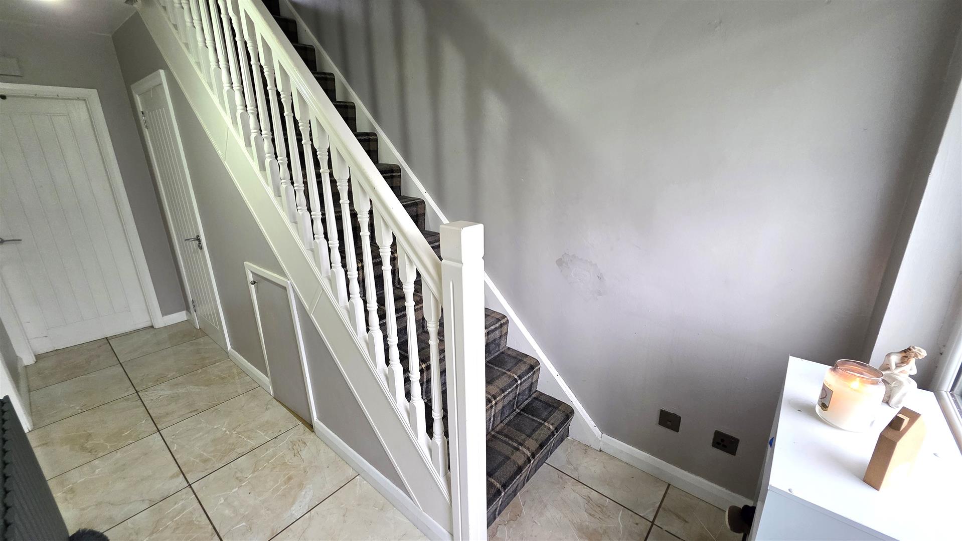 Fully tiled floor. Contemporary style radiator. Stair case to first floor with moulded hand rail and turned balustrade. Small under stair storage area.