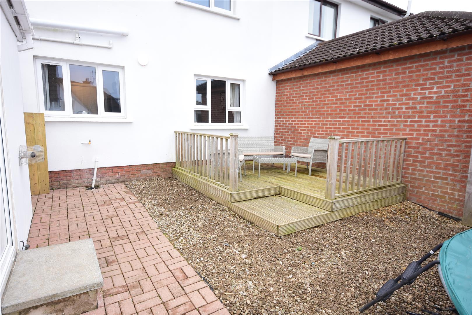 Fully enclosed to rear in pavier brick pathway, raised timber decking and stoned display. PVC oil tank. 6Ft timber fencing. Outside tap.