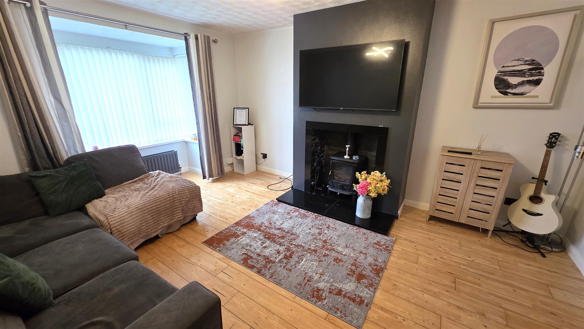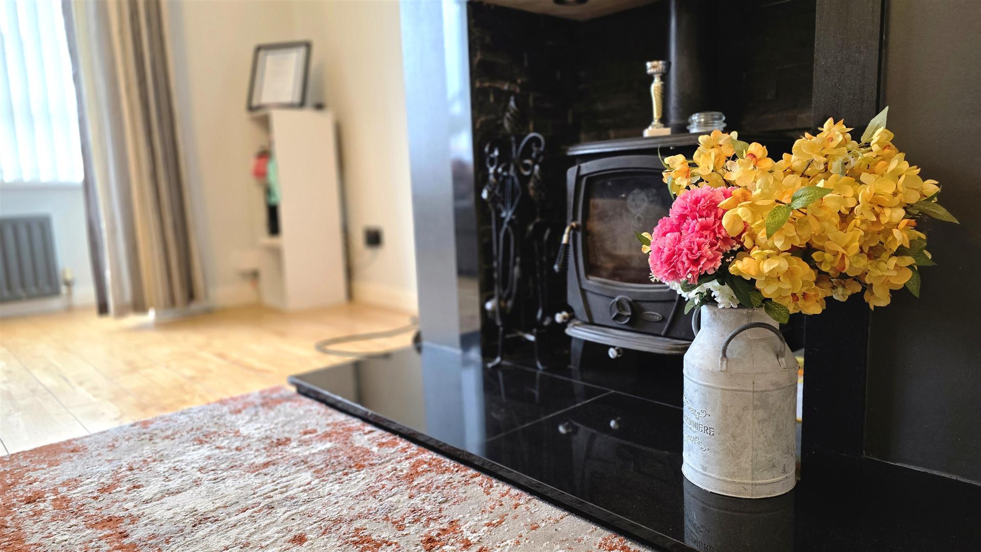 The property also benefits from contemporary style black high gloss kitchen units with integrated oven and hob together with a hole-in -the-wall fireplace with inset multi solid fuel cast iron stove, ground floor W/C and contemporary style radiators.