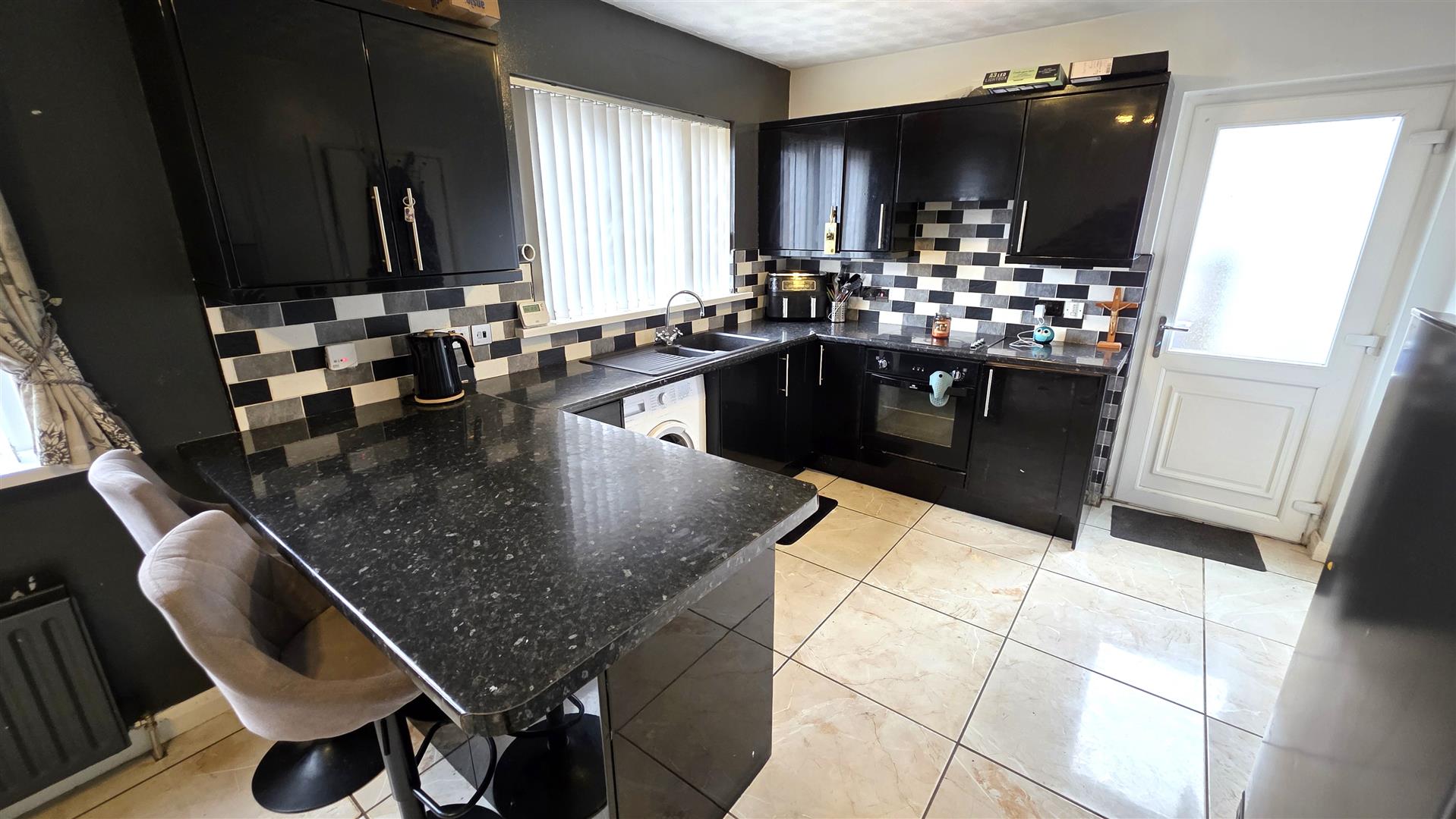 Full range of modern black high gloss high and low level units with short chrome handles and contrasting work surfaces. One and a quarter bowl single drainer stainless steel sink unit with mixer taps. Integrated four ring halogen hob with pull-out over head extractor fan and low level combination oven and grill. Plumbed for washing machine. Space for fridge freezer. Part tiled walls to work surfaces. Fully tiled floor. Double radiator. PVC double glazed door to side.