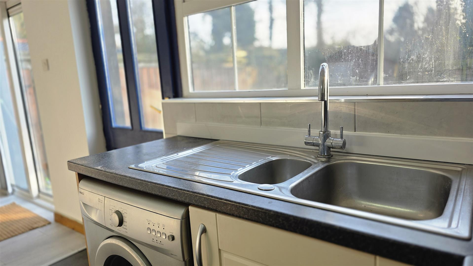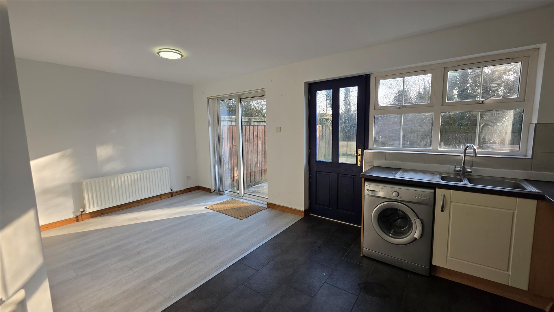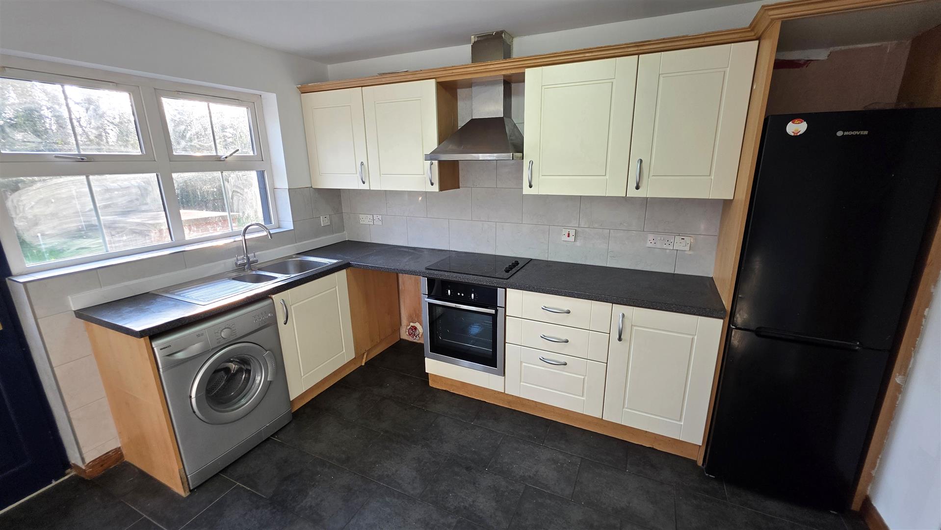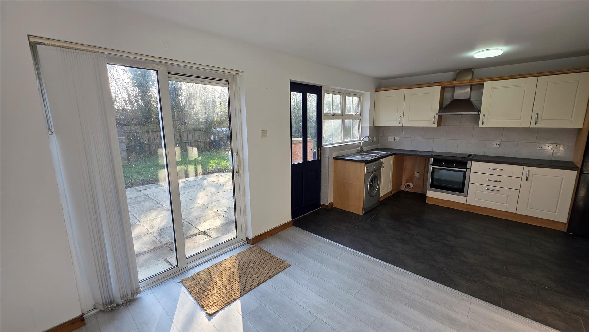 (max) Full range of cream high and low level units with decorative handles, contrasting work surfaces and recently installed tiled splashback. 1 1/2 bowl single drainer stainless steel sink unit . Integrated 4 ring halogen hob with stainless steel pyramid style over head extractor fan. Low level combination oven and grill . Space for fridge freezer, washing machine and dryer. Fully tiled floor to kitchen area. Wood laminate floor to dining area. Single radiator. Double glazed sliding patio doors to rear. Hardwood part double glazed door to rear.