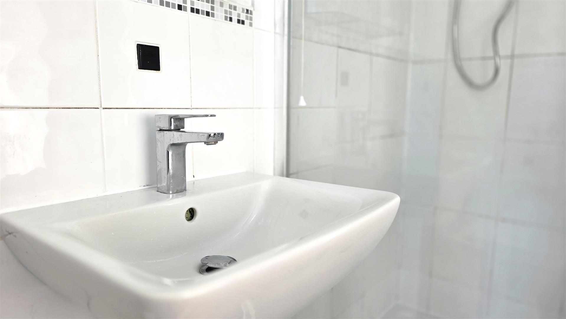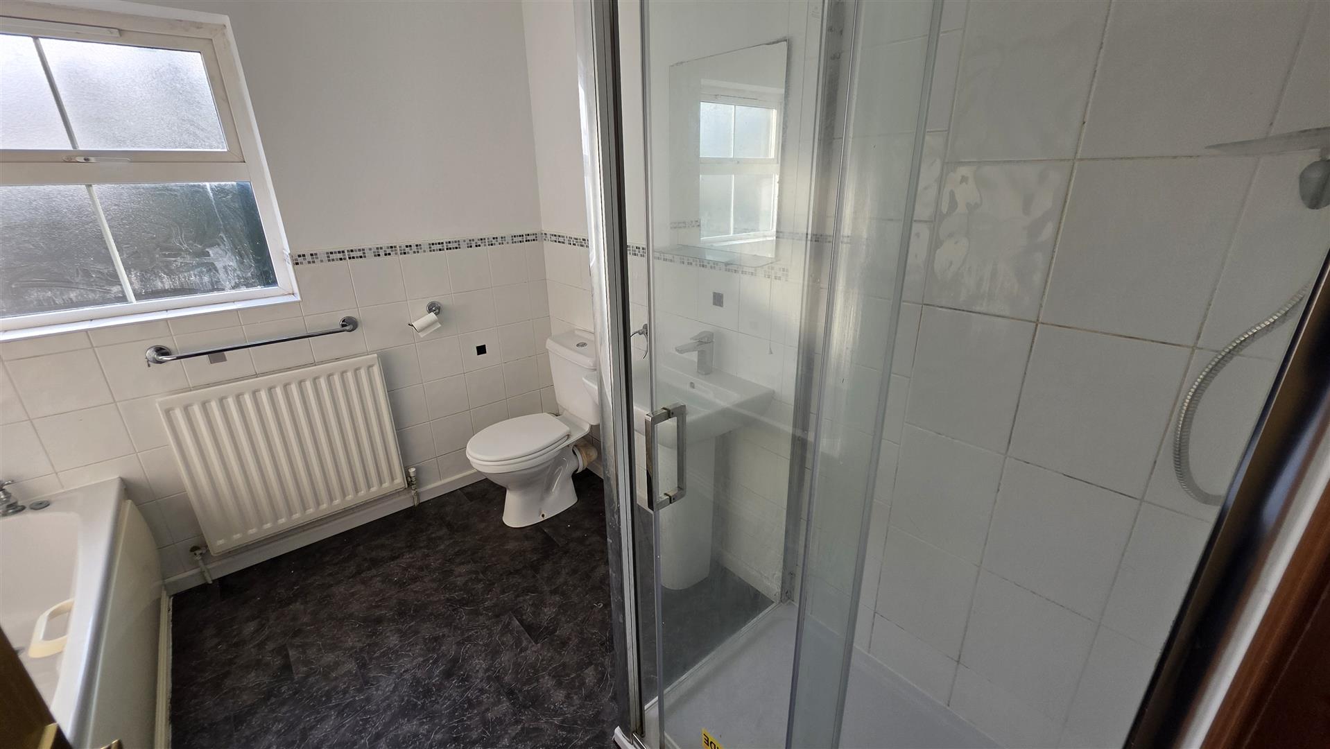 Bathroom with modern white suite to include fully tiled corner shower cubicle