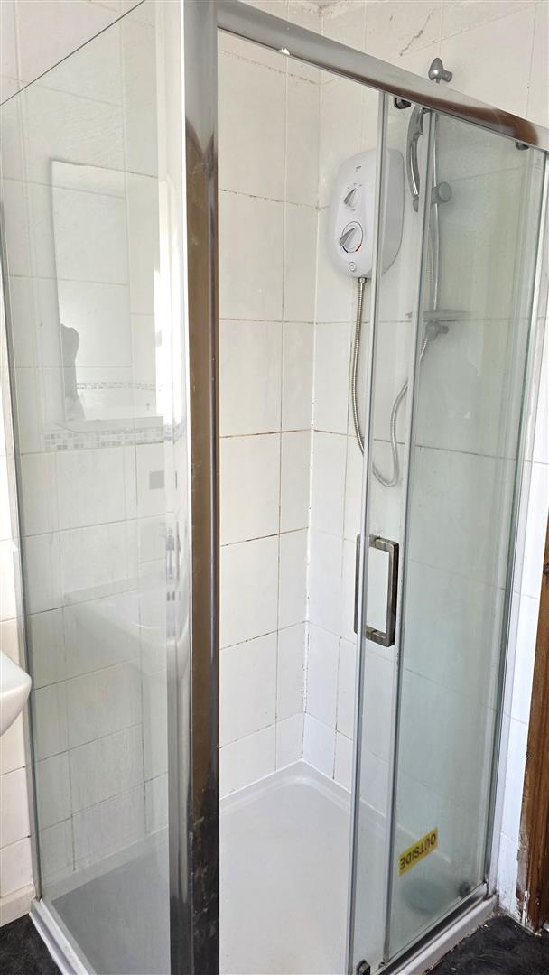 Modern white suite comprising panel bath, low flush W/C and pedestal wash hand basin. Fully tiled corner quadrant shower cubicle with 'Essentials ' electric shower unit. Sliding cubicle doors. Extractor fan . Half tiled walls with decorative borders. Hot press with insulated copper cylinder and Willis type immersion heater Shelving above.