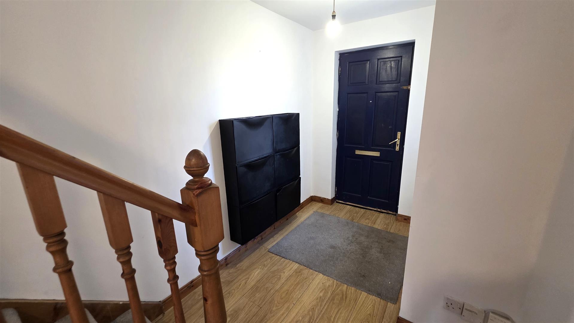 Staircase to first floor with moulded handrail and turned balustrading . Wood laminate flooring. Under stair storage. Single radiator.