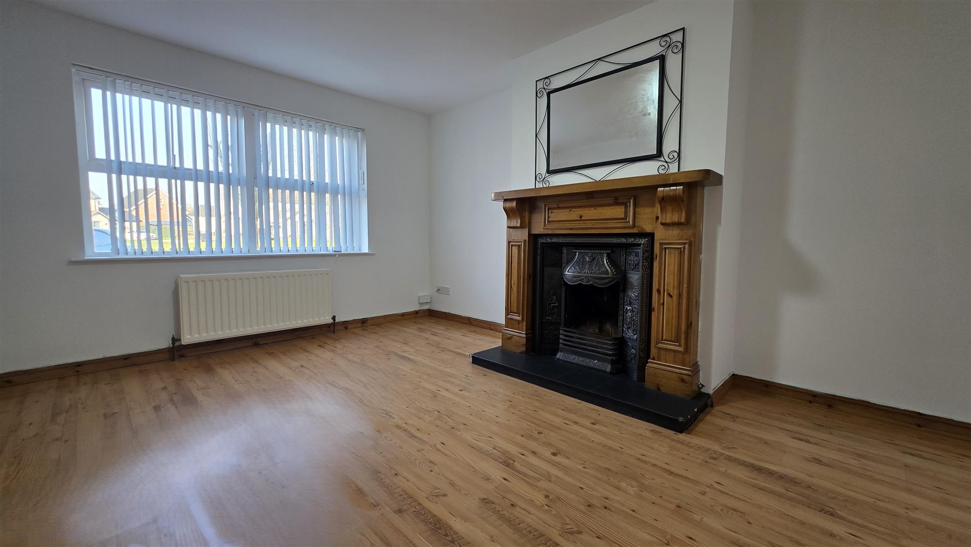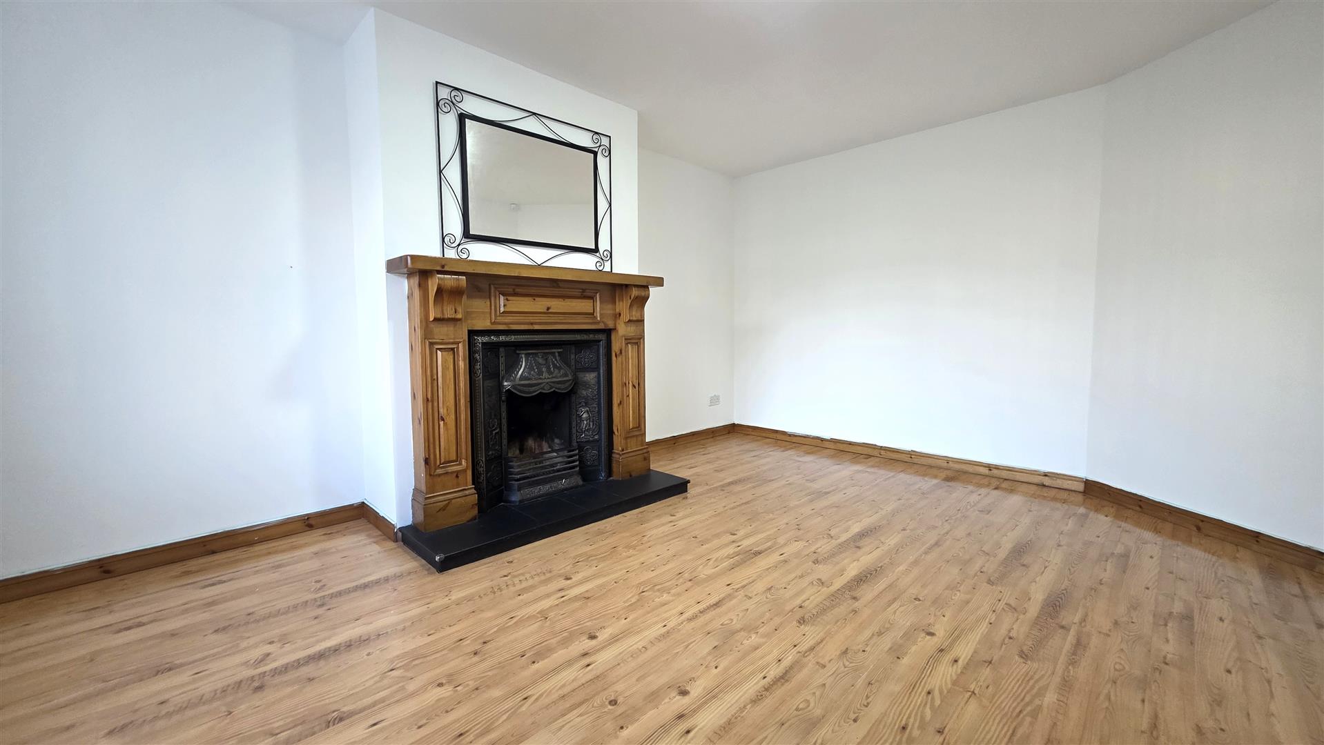 Open fire with decorative wooden surround and ornate part polished cast iron inset. Slate tiled hearth . Wood laminate floor. Double radiator.