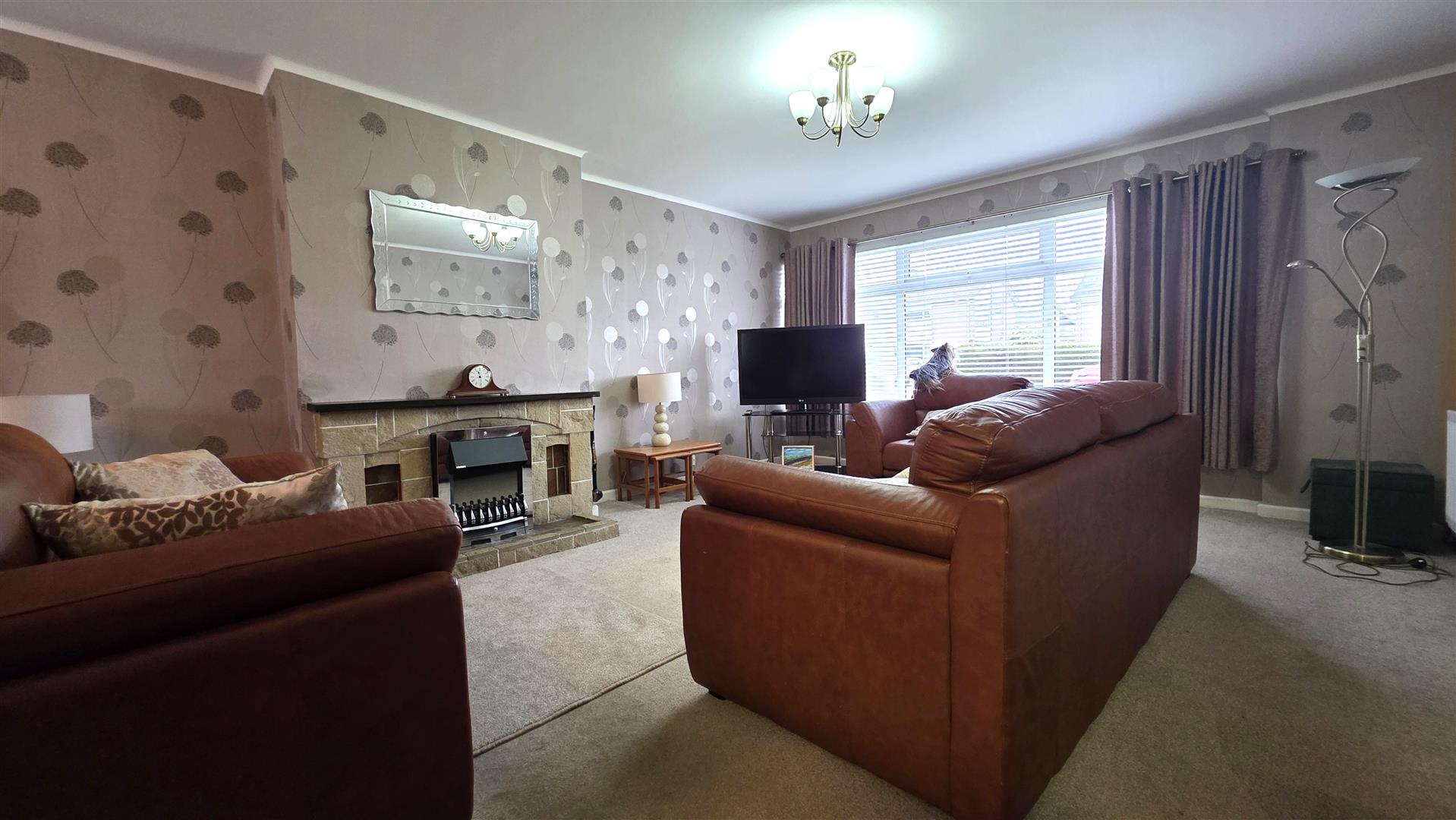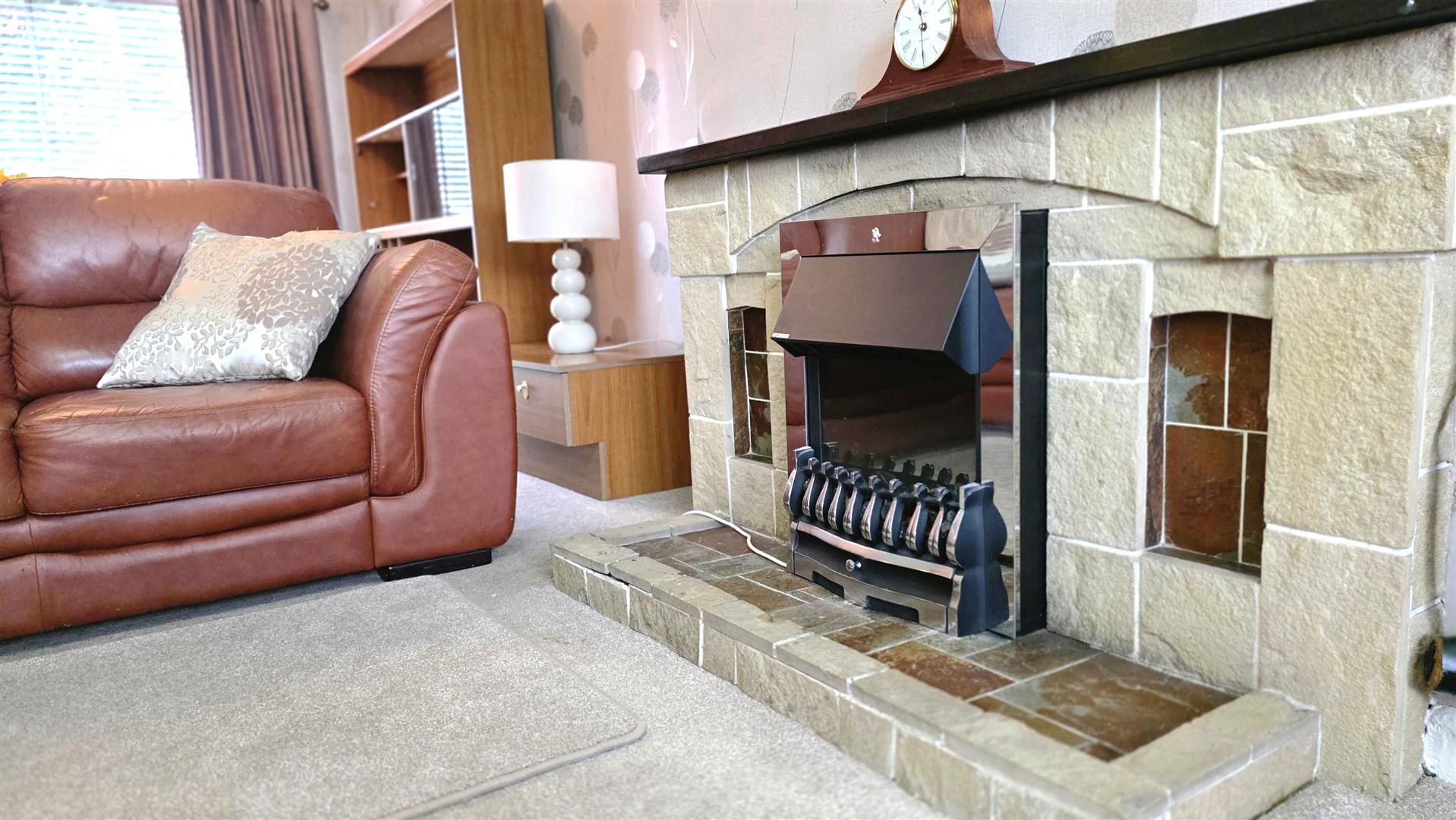 Feature electric fireplace with with brick surround. Double radiator. Open to