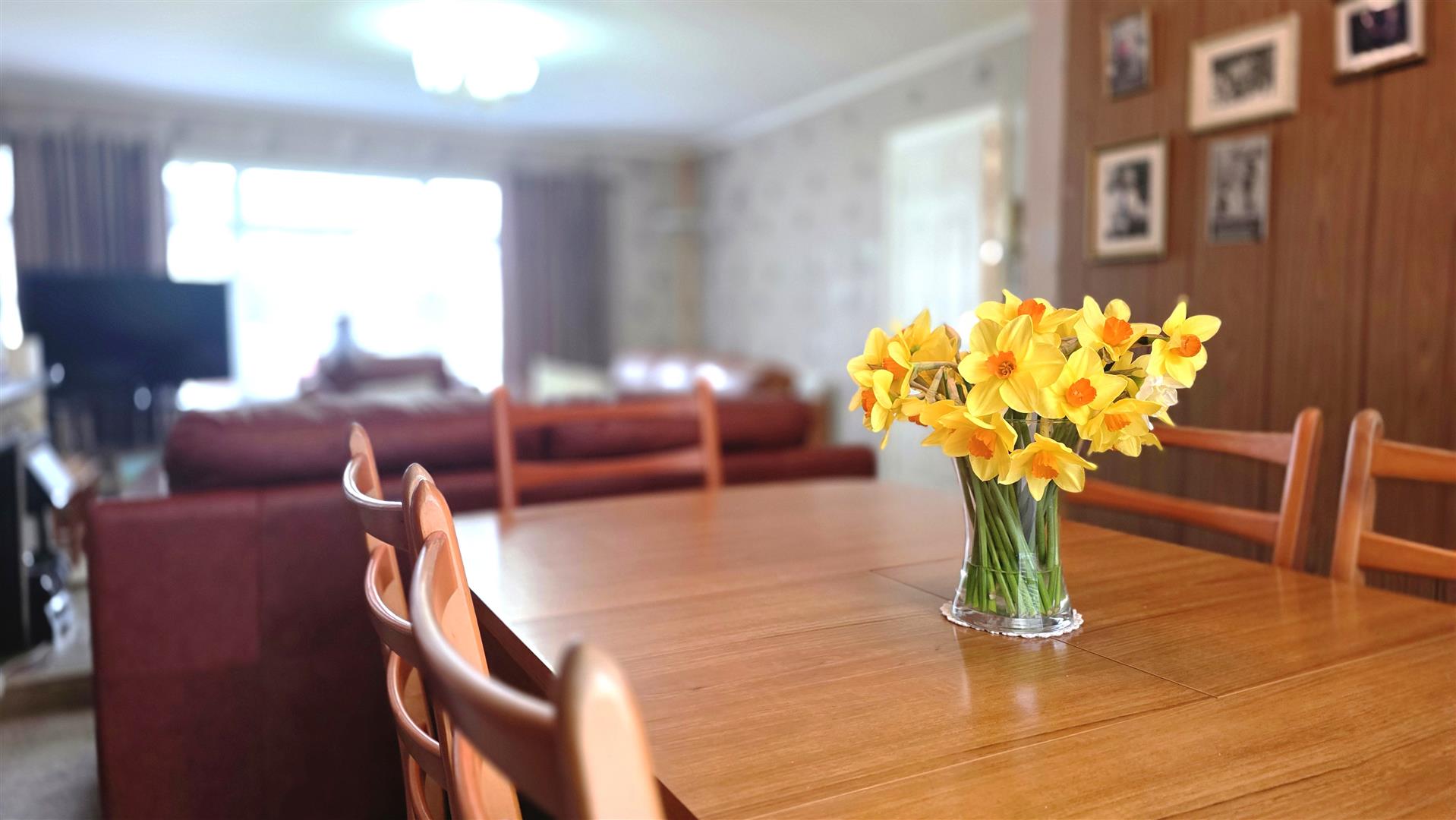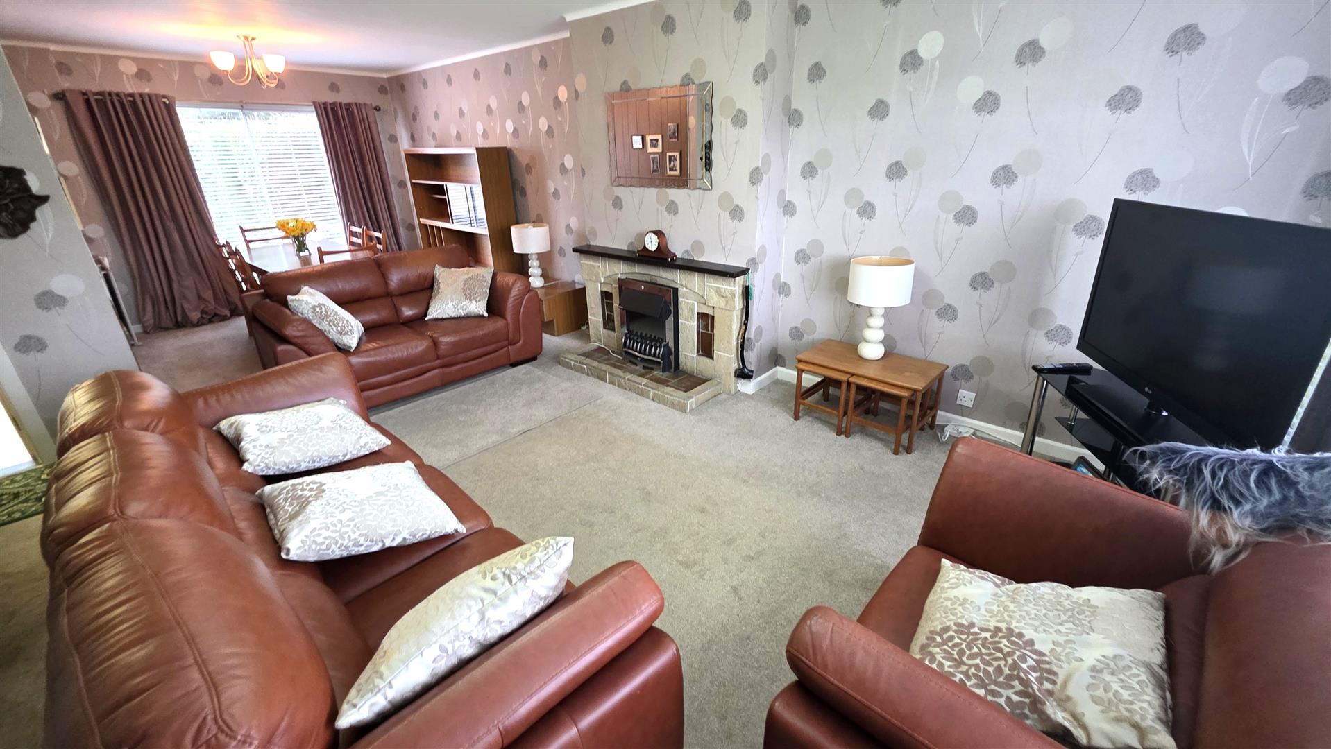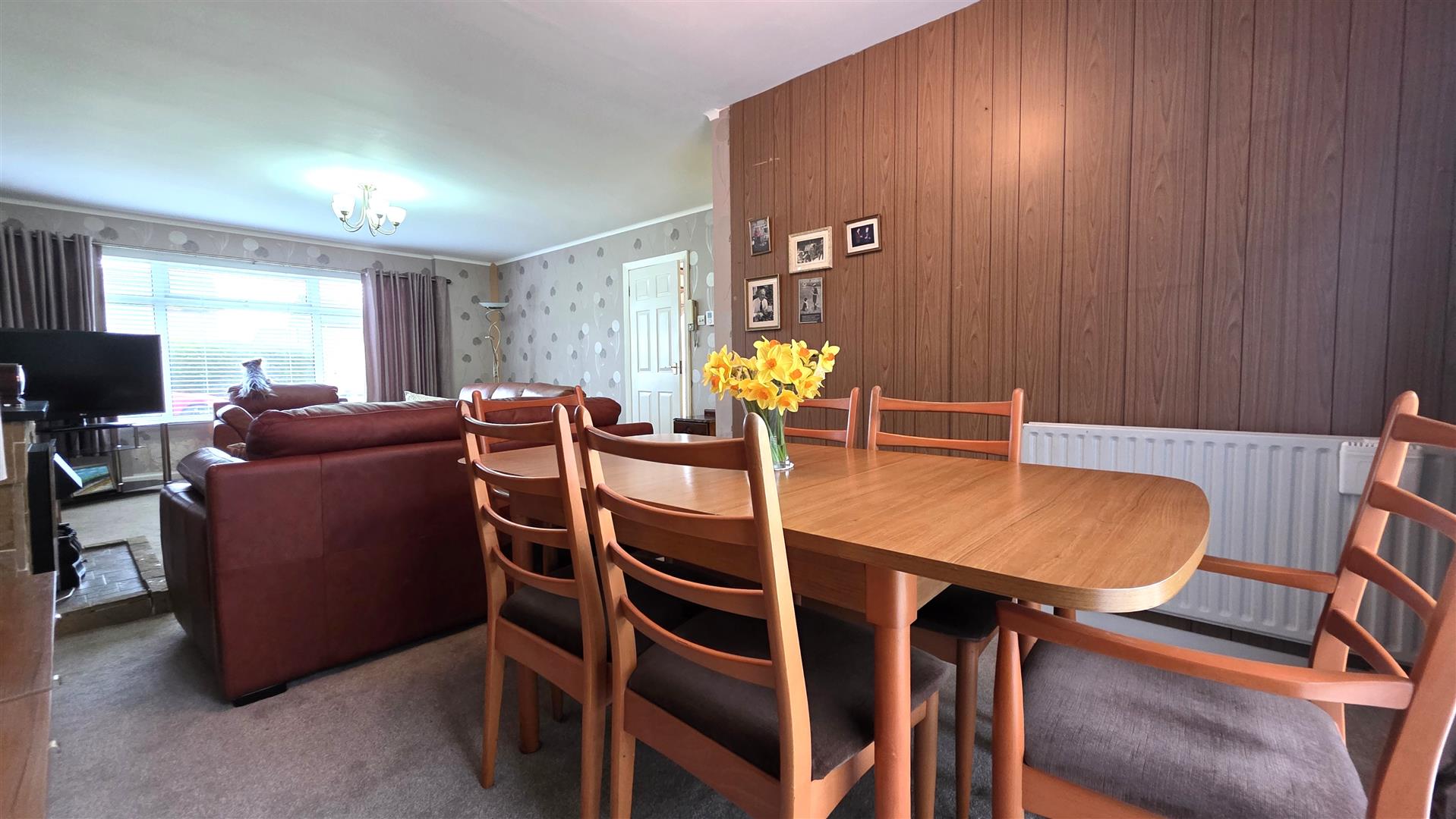 Living room with feature fire open to informal dining with sliding double glazed door to rear garden