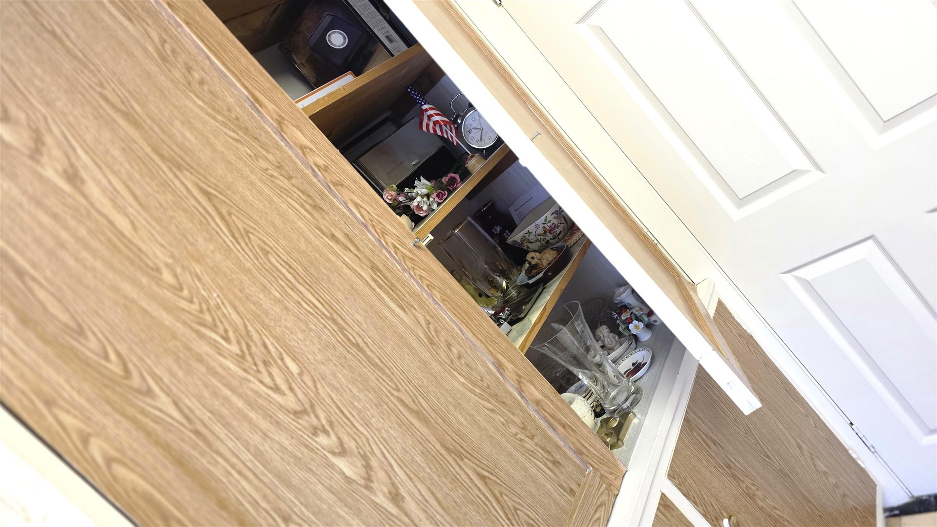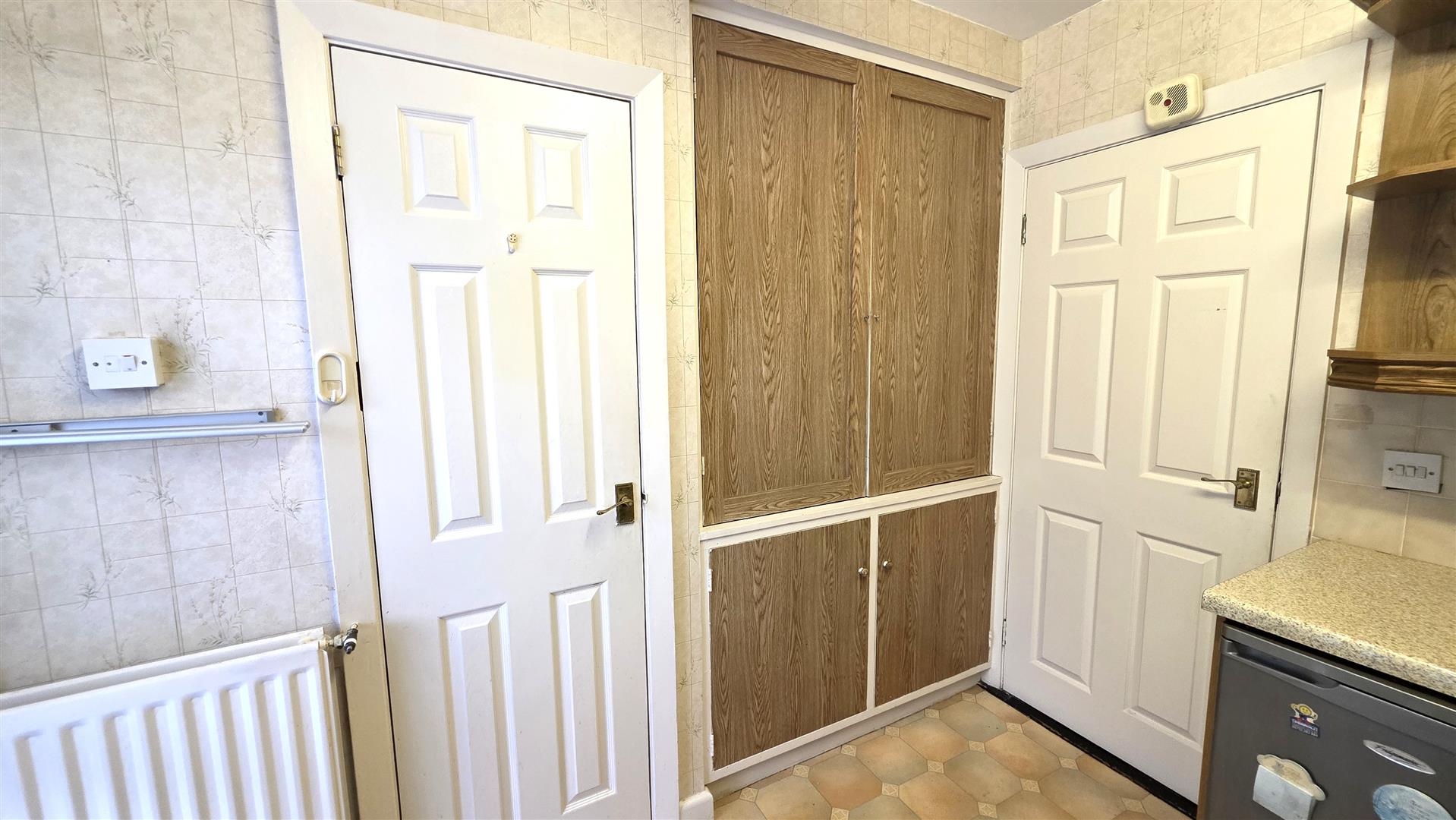 Access to loft with drop down ladder. Linen cupboard with insulated copper cylinder and shelving.