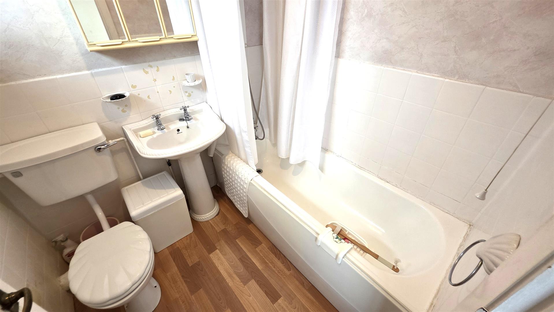 Bathroom with white suite to include panel bath and shower over