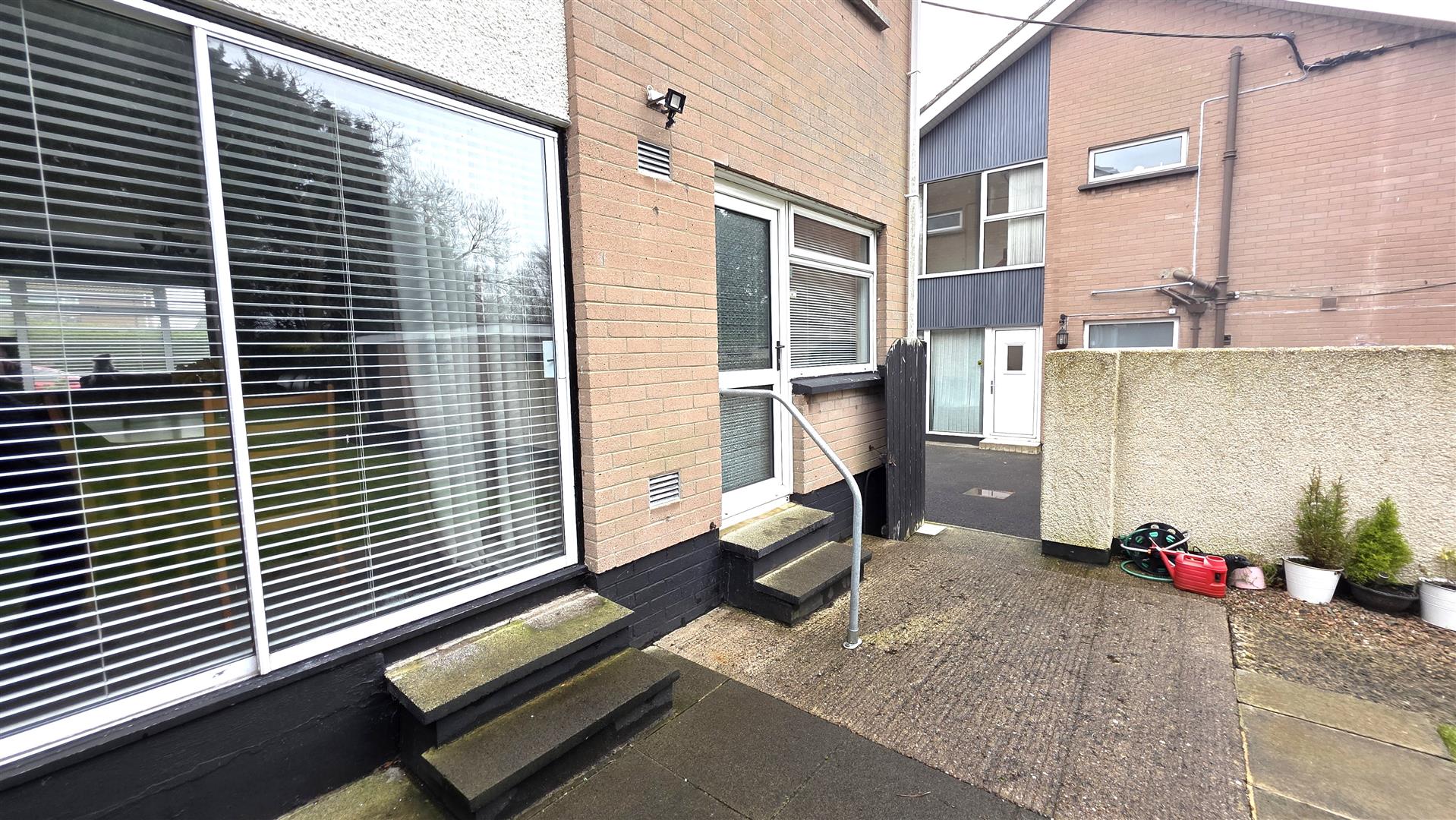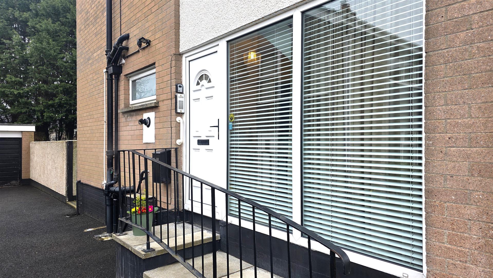 Substantial side drive with space for four cars. Neat lawn with mixed stone bedding. Steps with cast iron railing to;