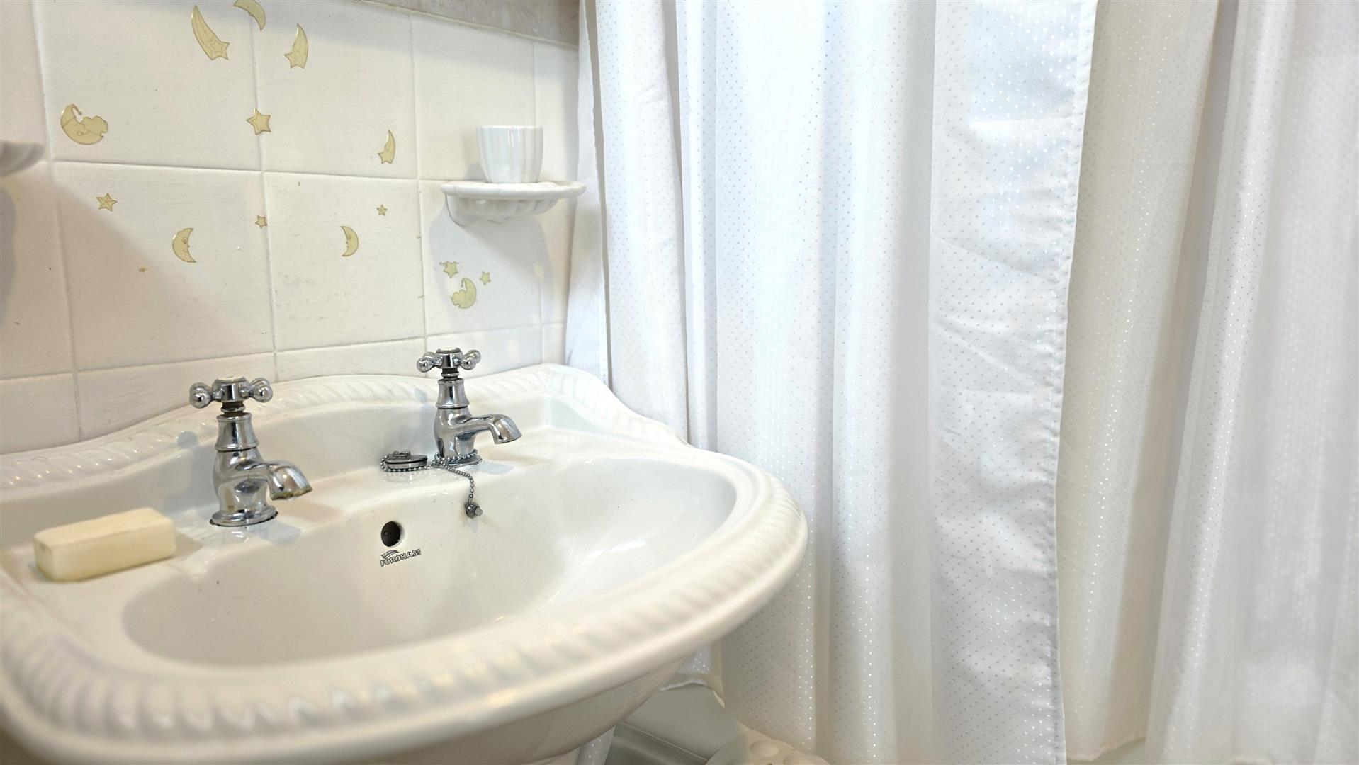 White suite comprising a panel with with mounted shower over and stainless steel hot and cold taps. Pedestal wash hand basin with stainless steel 'Victorian' style hot and cold taps. Low flush WC. Partially tiled walls. Single radiator.