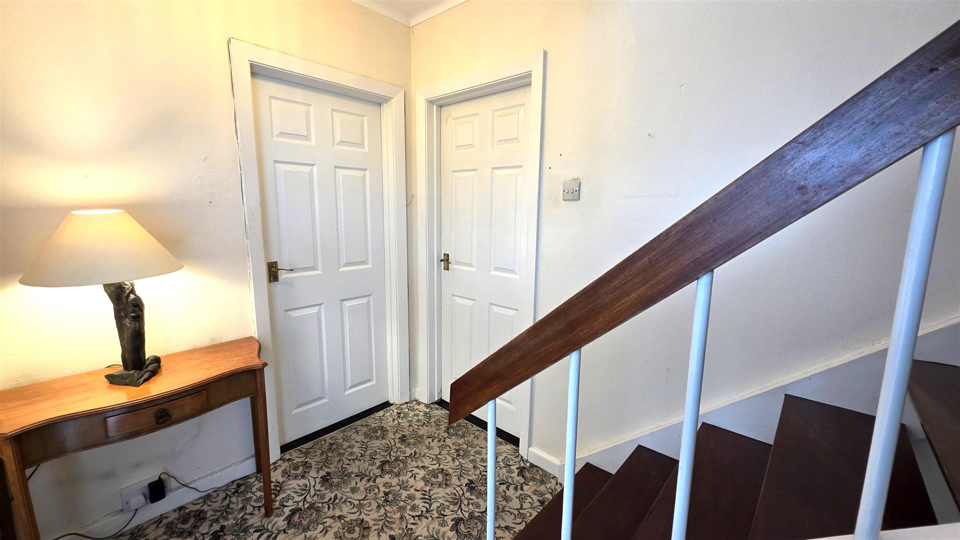 PVC double glazed door with sidelight to entrance hall. Staircase to first floor with handrail. Single radiator.