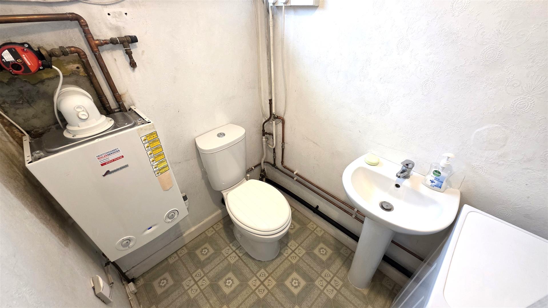 White suite comprising a pedestal wash hand basin with 'Monobloc' chrome mixer tap. A low flush push button WC. 'Worcester' Gas boiler. Plumbed for washing machine.