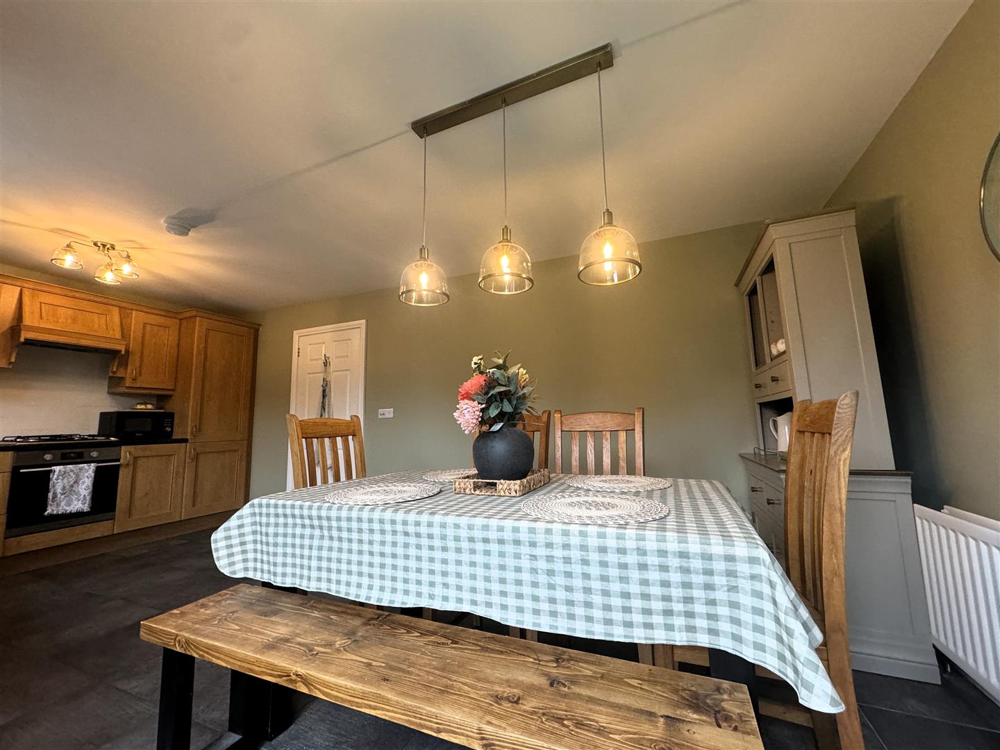 Equipped with a range of high and low level solid wood units with contrasting work surfaces and splash back wall tiling. Integrated fridge/freezer, electric oven and 4 ring gas hob with concealed overhead extractor fan. Inlaid double drainer sink unit with swan neck directional mixer tap. Space for freestanding washing machine and tumble drier. Tiled floor. PVC double glazed patio doors to rear garden.