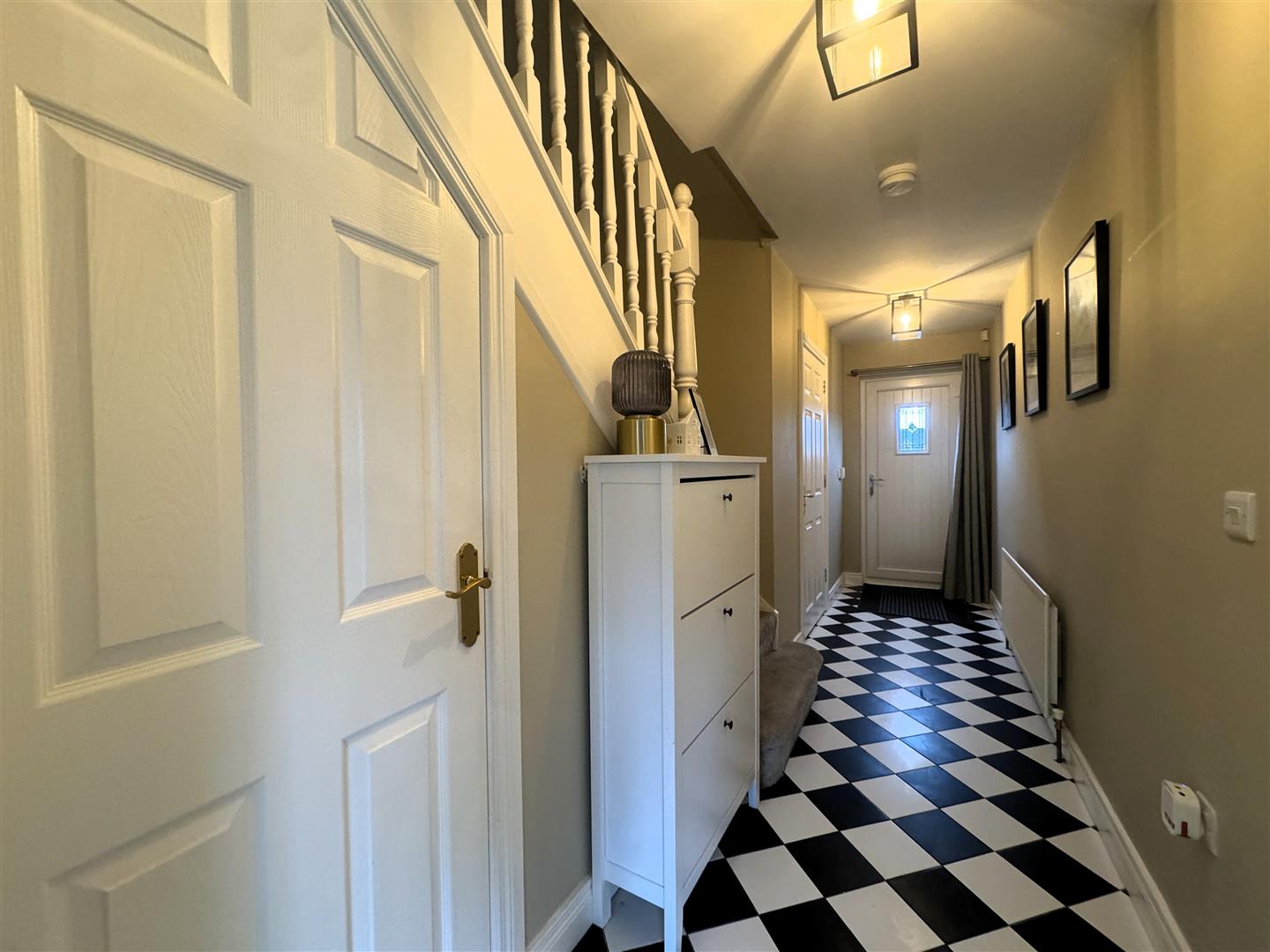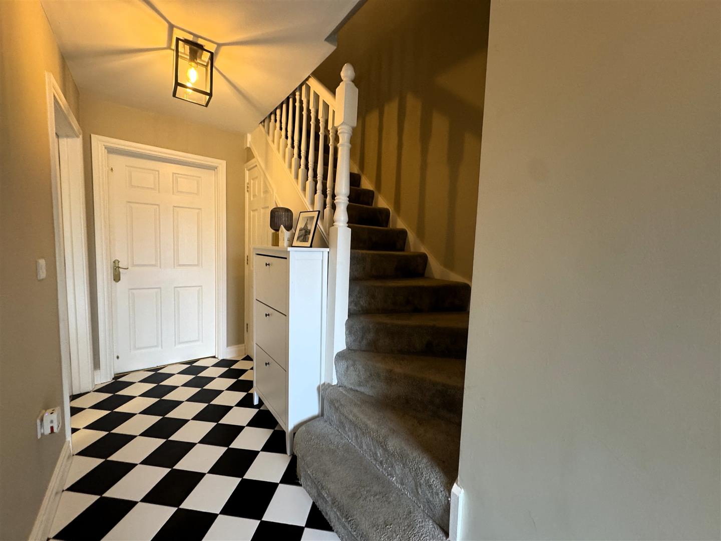White balustrade staircase to first floor. Under stair storage cupboard. Tiled flooring. Door into:-