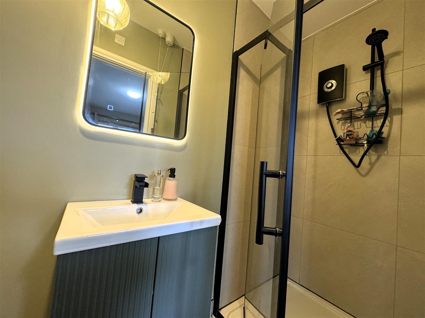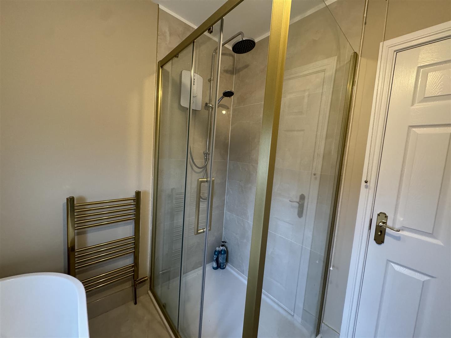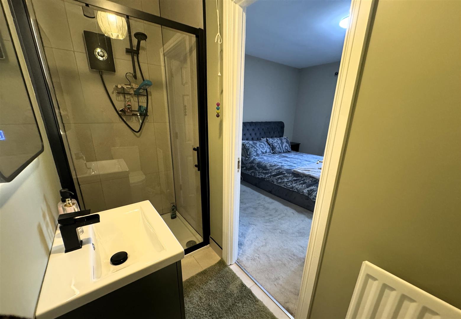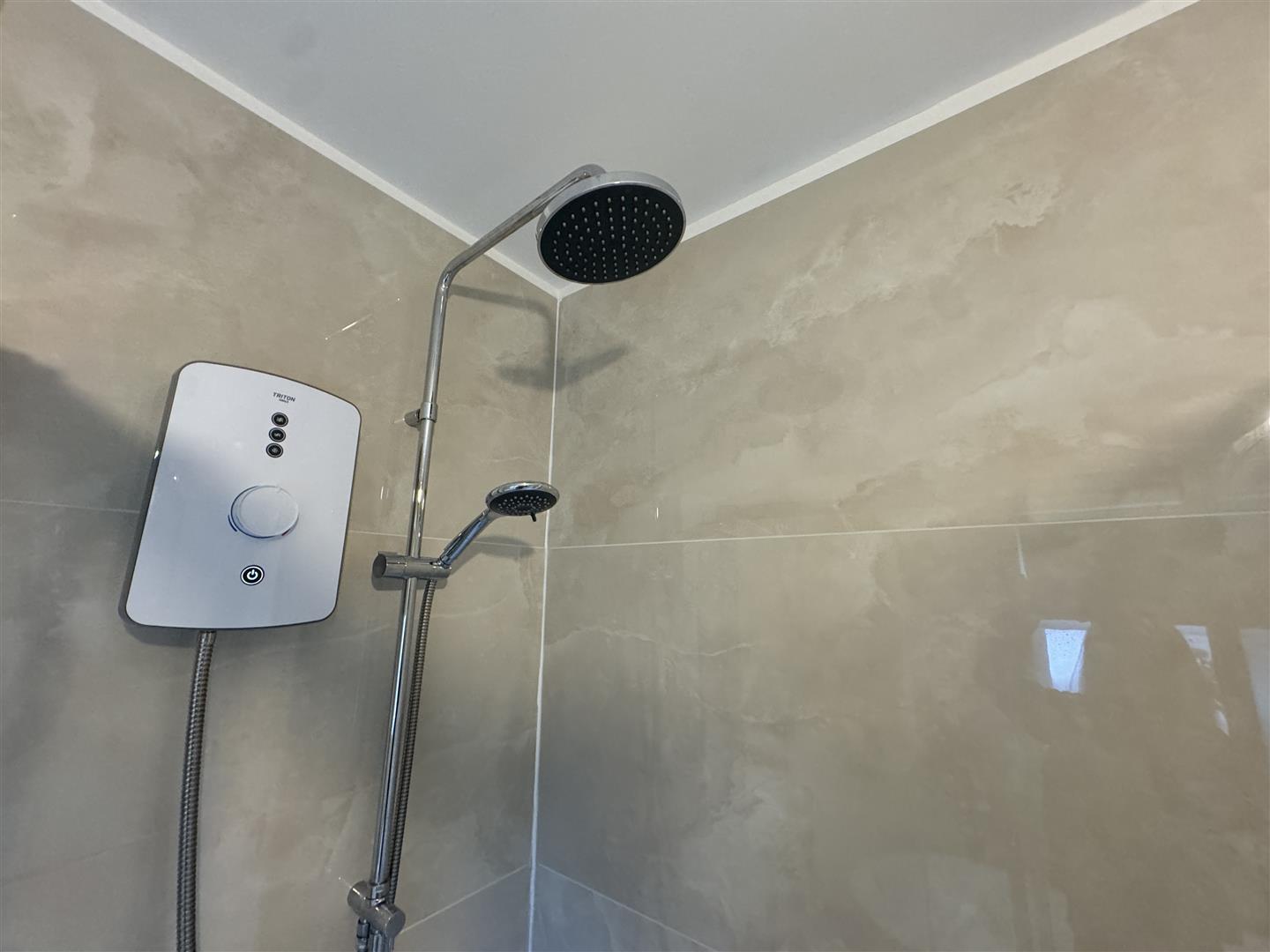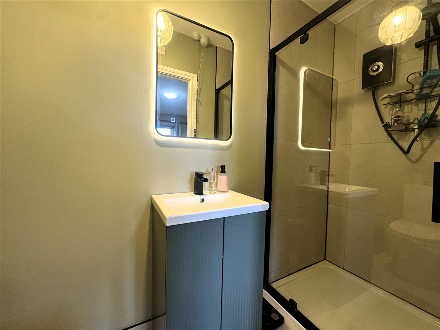 Recently installed ensuite comprising push button w.c, fitted vanity unit with mixer tap and light up mirror above, spacious fully tiled shower enclosure with electric shower overhead. Tiled floor. Single radiator.