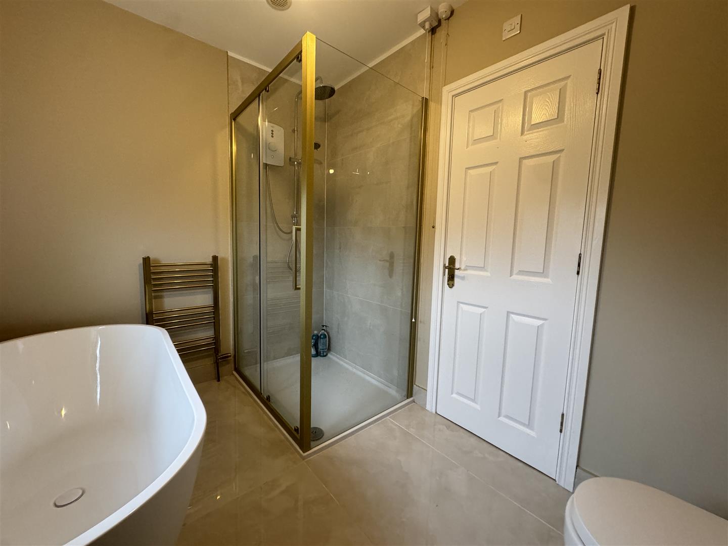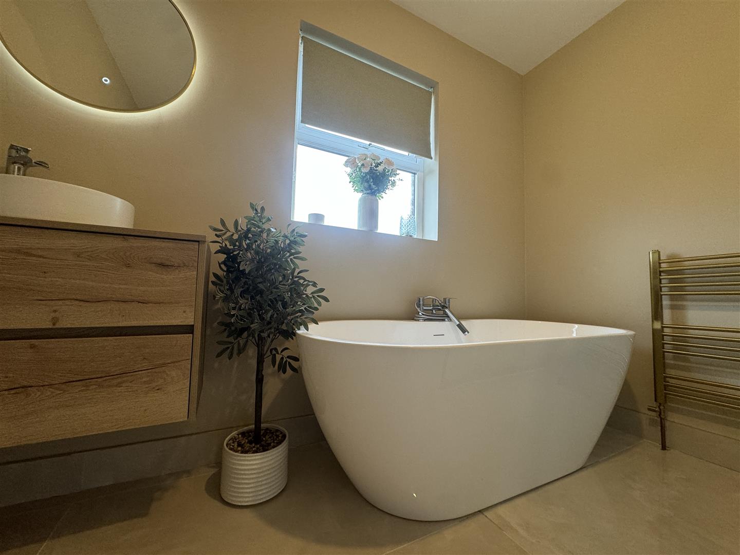 Comprising push button flush w.c, circular white ceramic sink resting on floating walnut vanity unit with light up mirror above, luxury freestanding bath with mixer taps and hand shower attacement, spacious fully tiled shower enclosure with sliding door and electric rainfall shower overhead. Gold towel rail. Porcelain tiled floor.