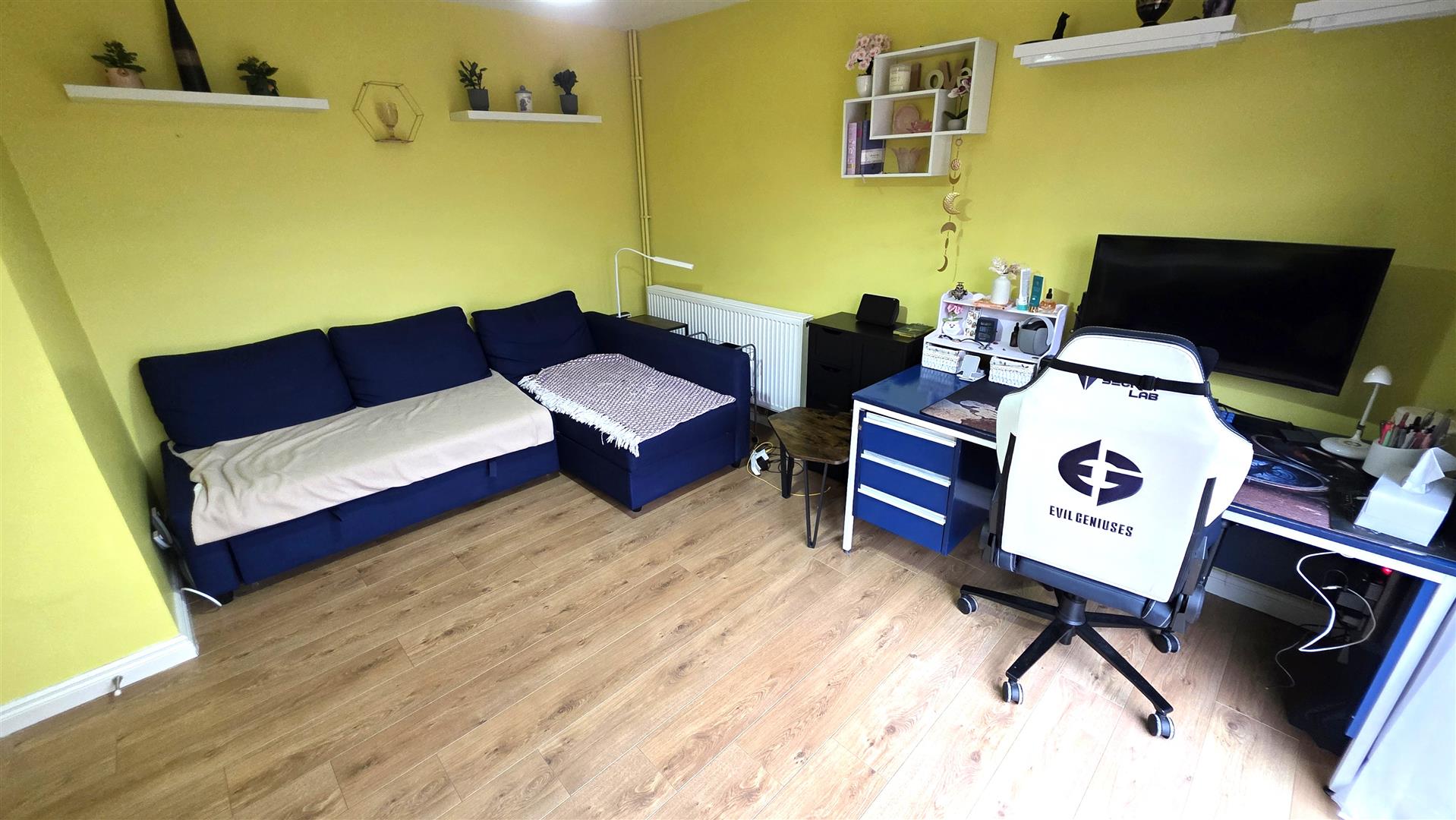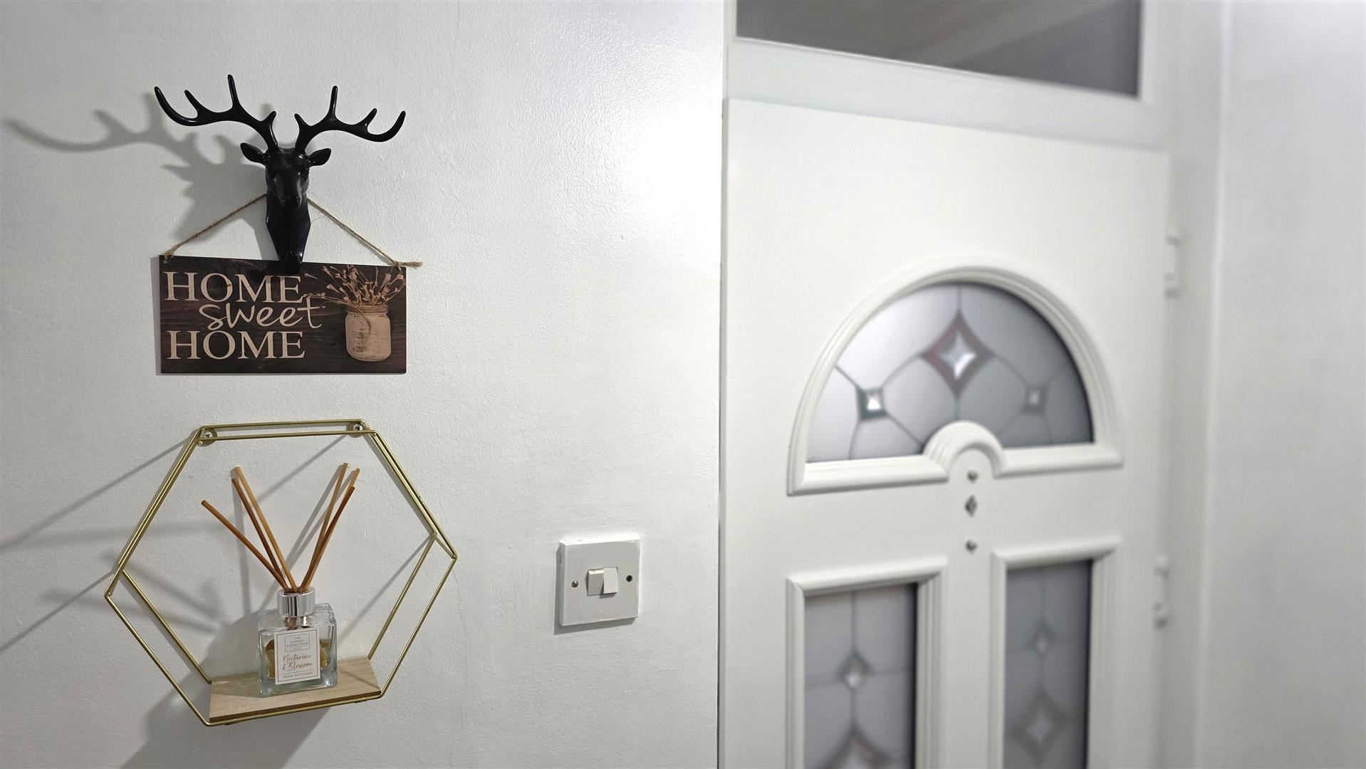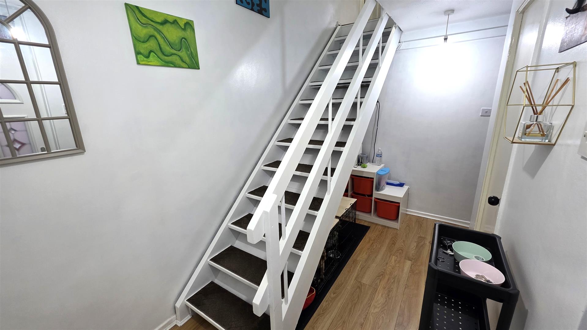 Composite double glazed door to entrance. Stair case to first floor with hand rail. Large storage cupboard. Wood laminate floor. Double radiator. Second storage cupboard.