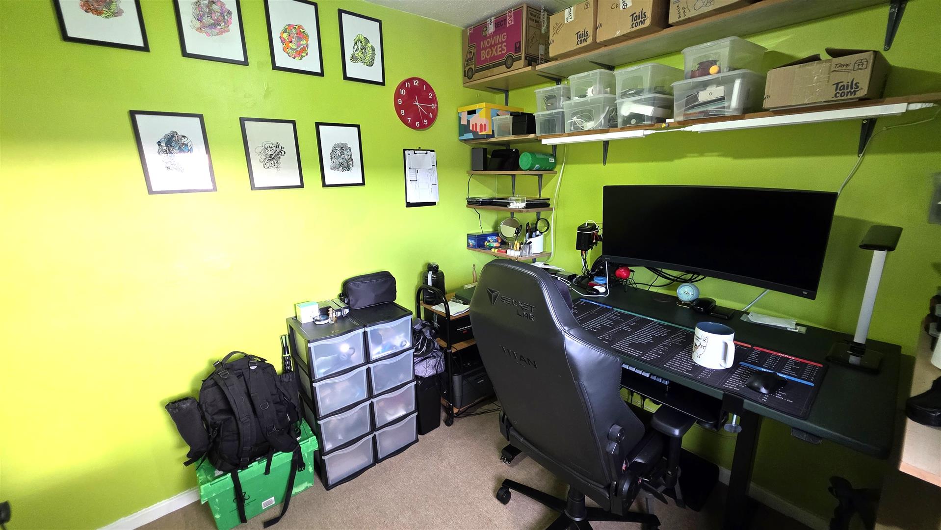 Storage cupboard. Wood laminate flooring. Access to floored loft with shelving, drop down ladder and lighting.