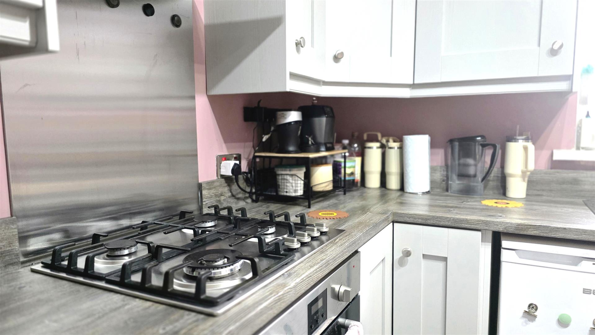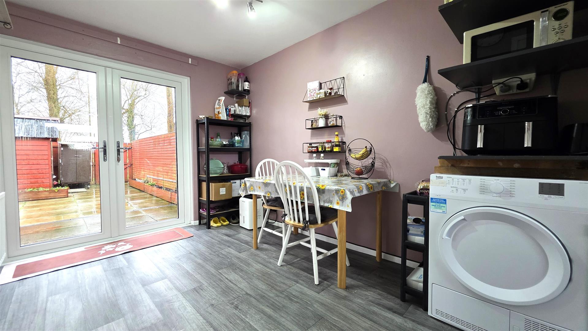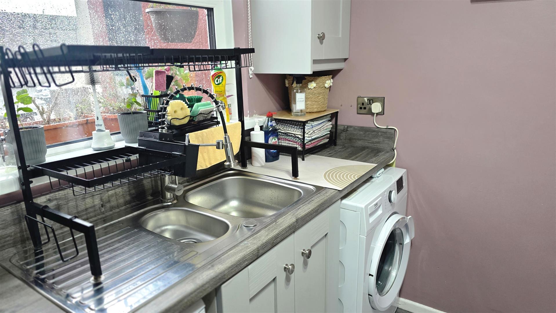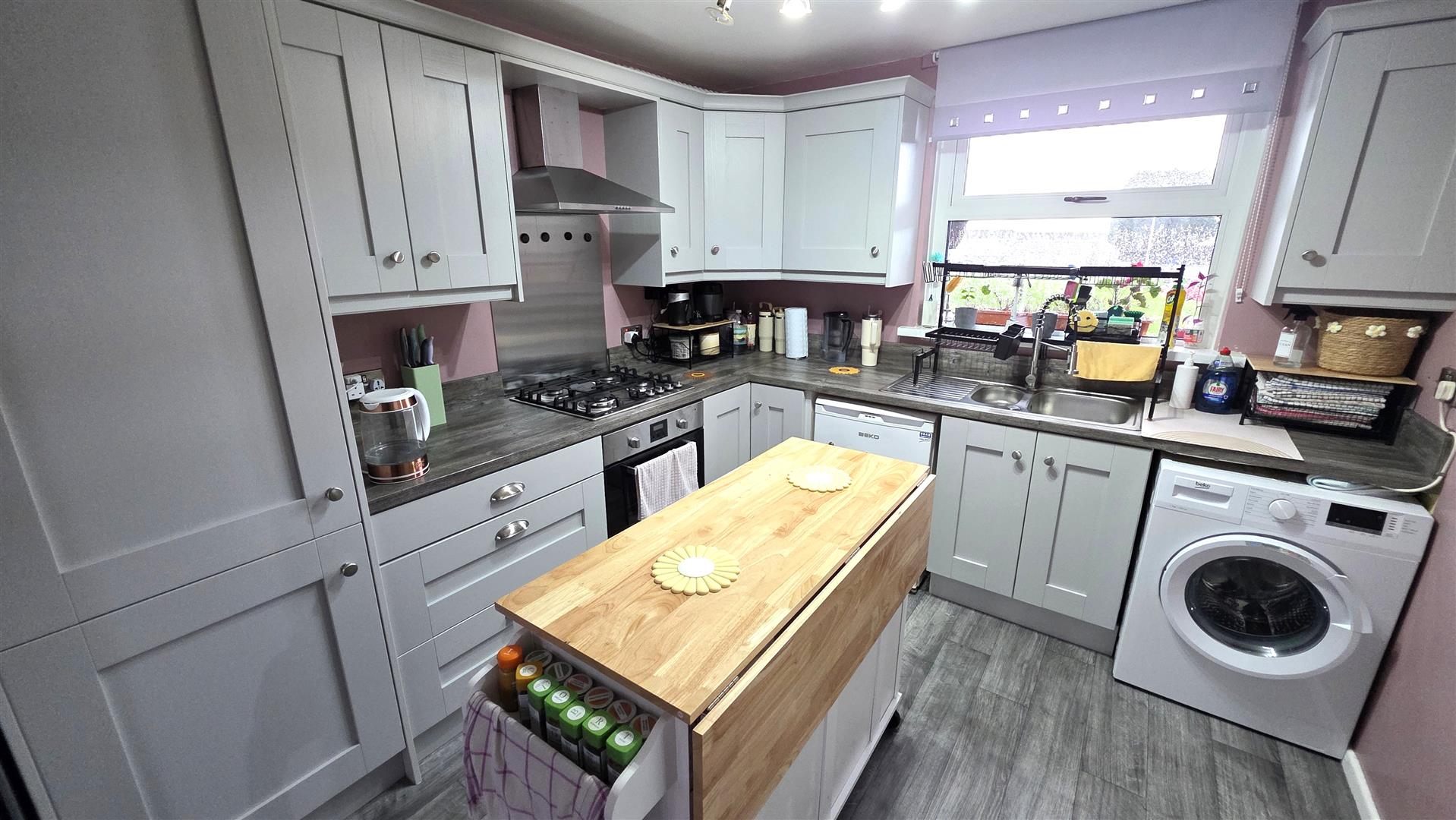 Recently installed mid grey "Shaker" style high and low level units with contrasting work tops. One and a quarter bowl stainless steel sink unit with chrome mixer tap. Integrated four ring gas hob with stainless steel pyramid style over head extractor fan. Low level combination oven and grill. Integrated fridge freezer. Space for tumble dryer and washing machine. Pantry storage cupboard. Double radiator. "French" PVC triple glazed doors to rear.
