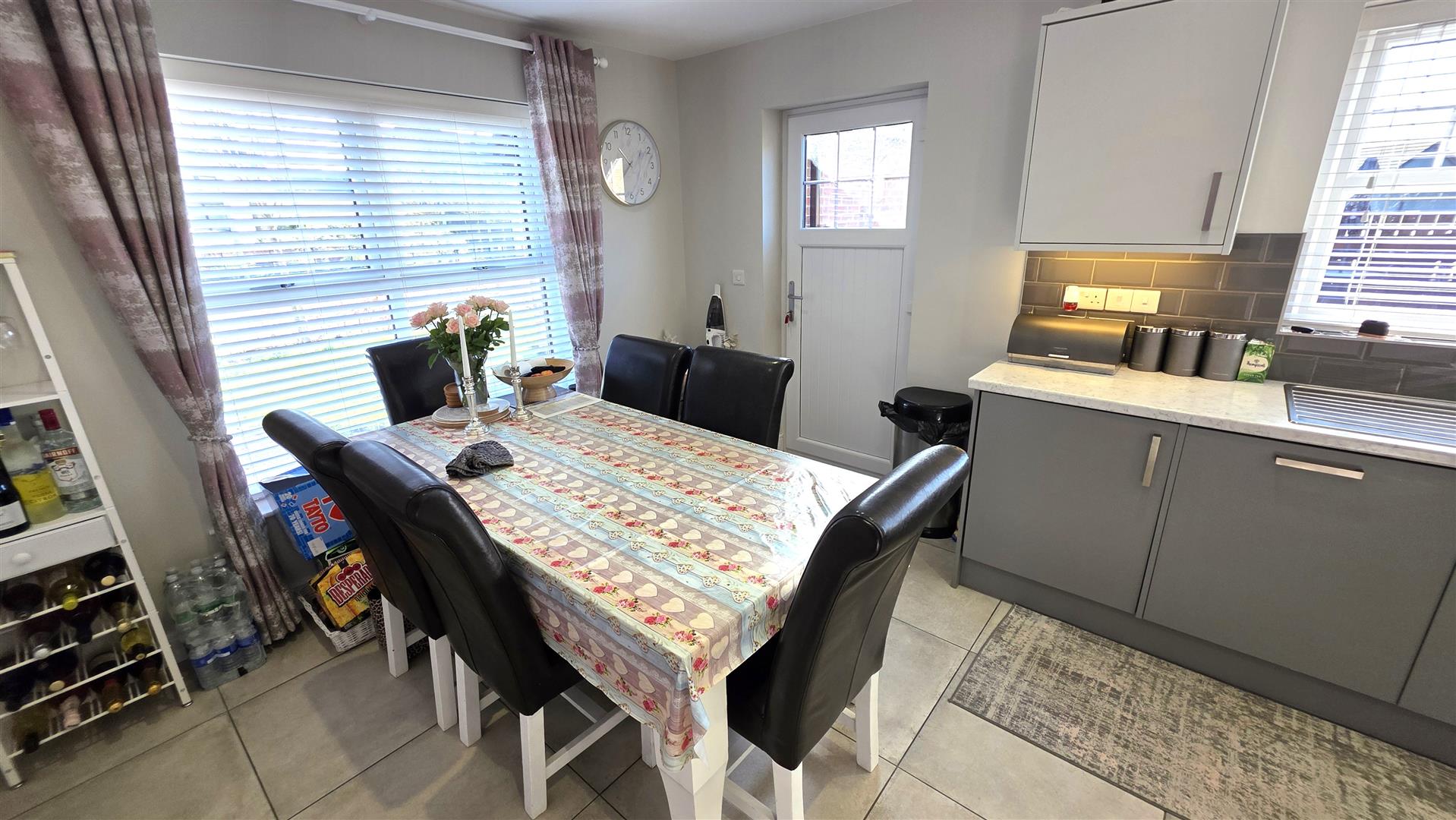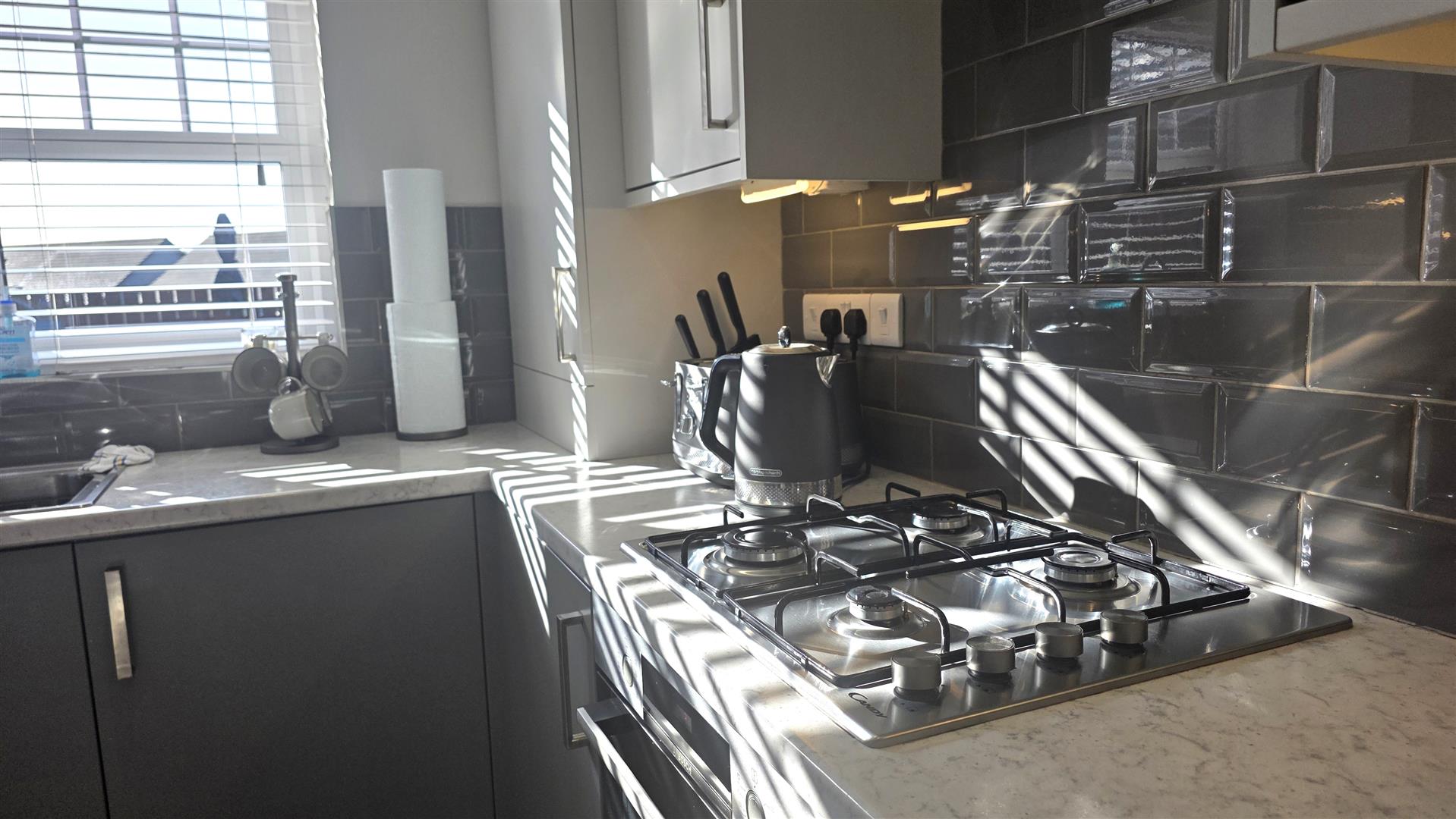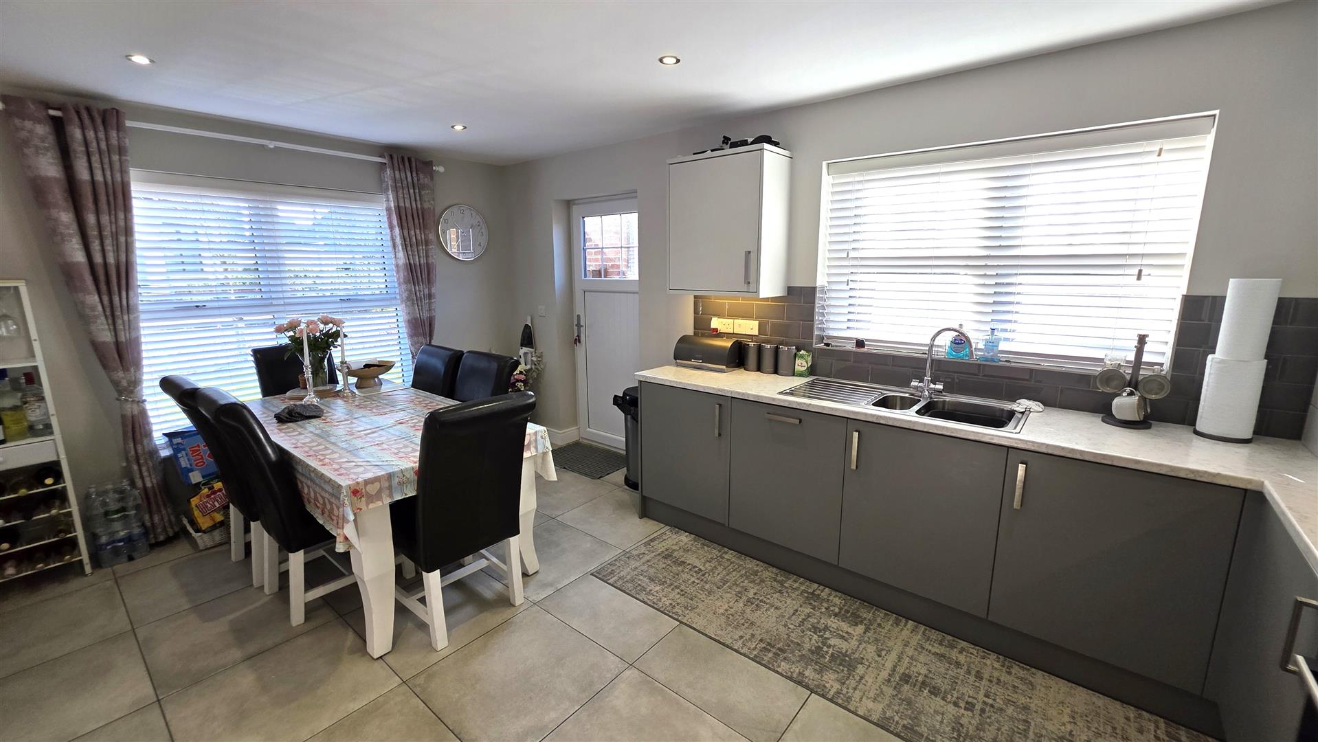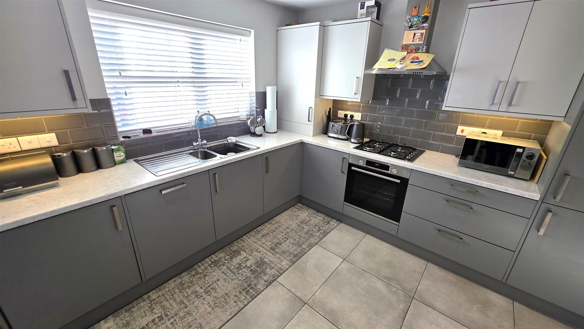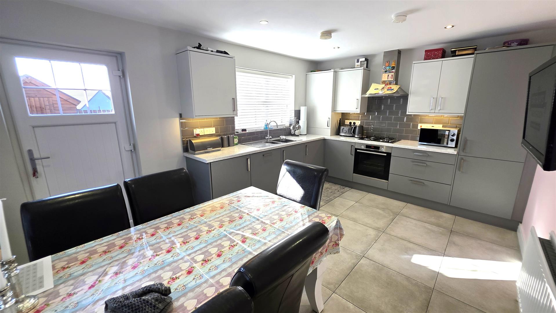 Work surfaces and bevelled subway style splashback tiling. Over counter lighting. 11 quarter bowl stainless steel sink unit with chrome mixer tap. Integrated appliances to include a four ring gas hub with stainless steel pyramid style, overhead extractor fan. A low level combination oven and grill. Fridge freezer, dishwasher and washing machine. Fully tiled the flooring. Low voltage down lighting. Dual aspect windows. Double radiator. PVC dougle glazed door to the rear.
