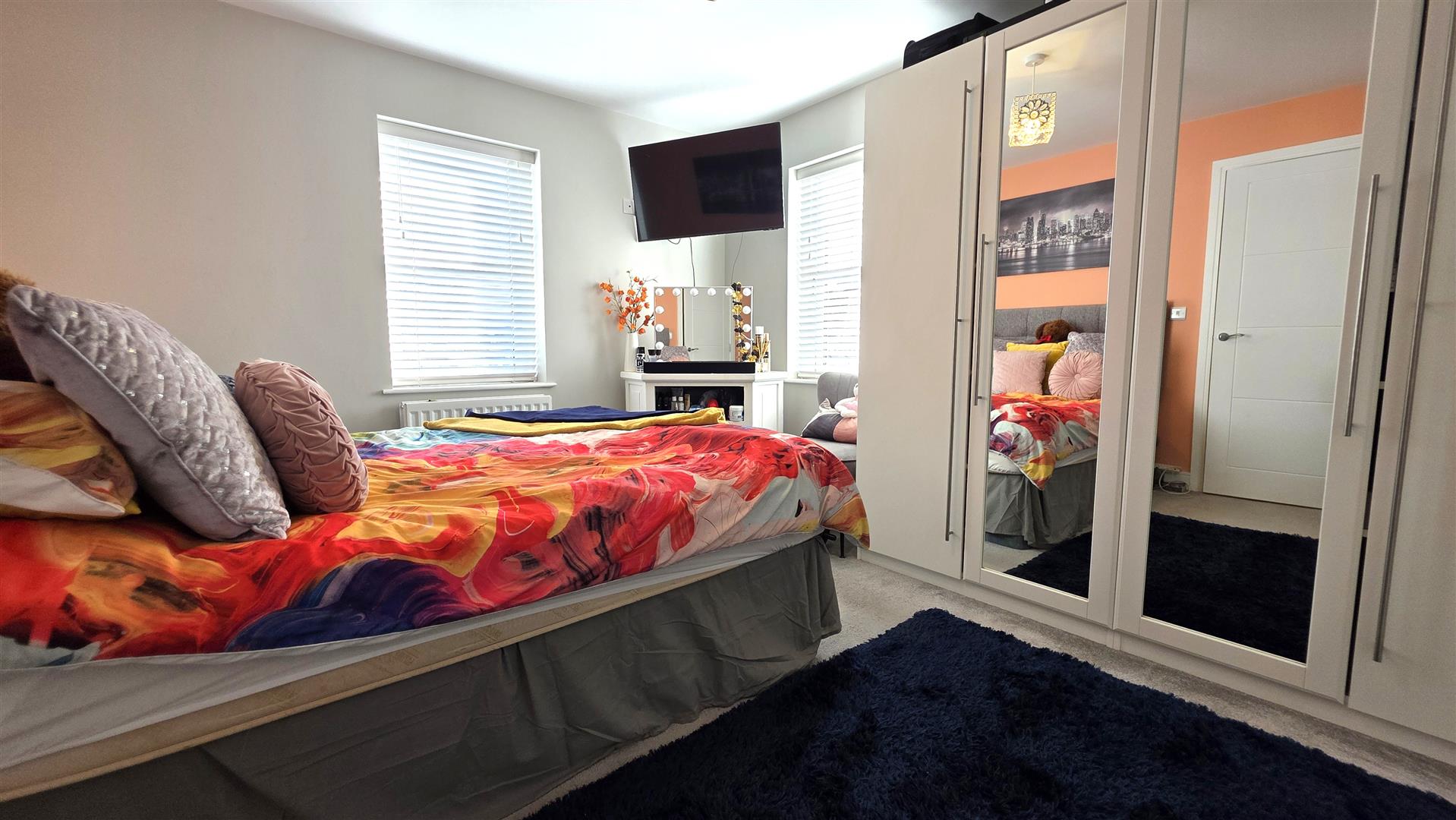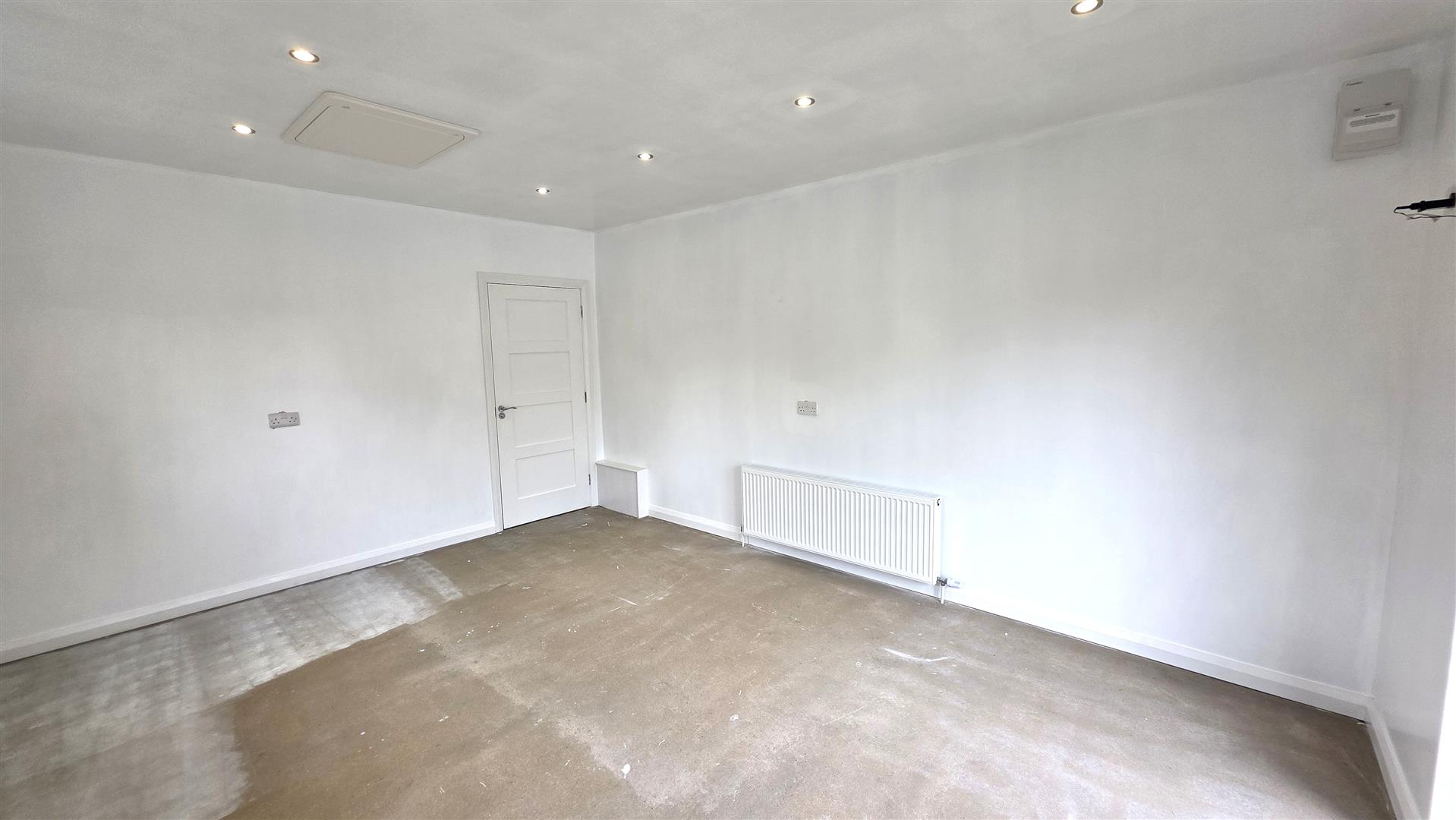 Feature wall mounted contemporary style imitation wood burning fire. Thermostat. Dual aspect. Low voltage down lighting. Double radiator.