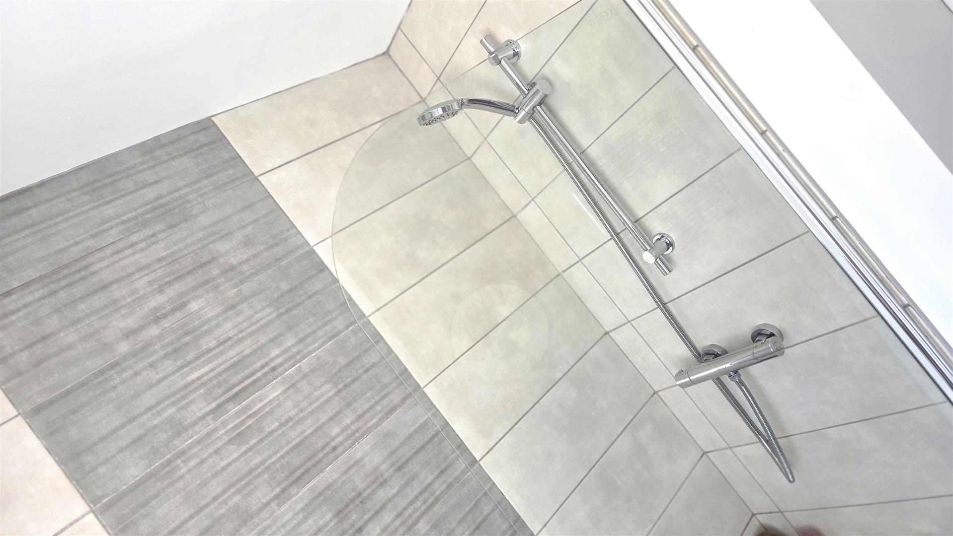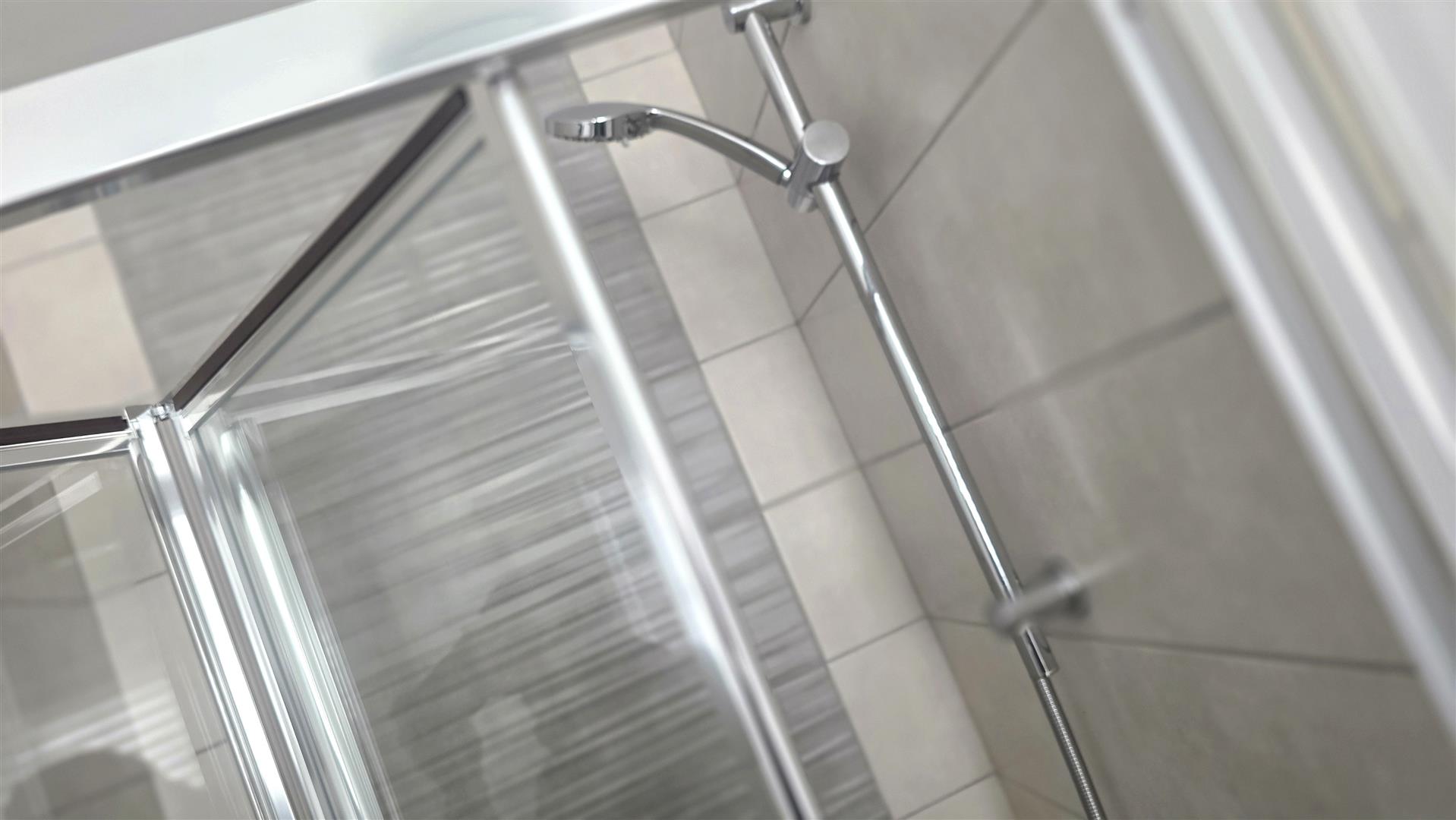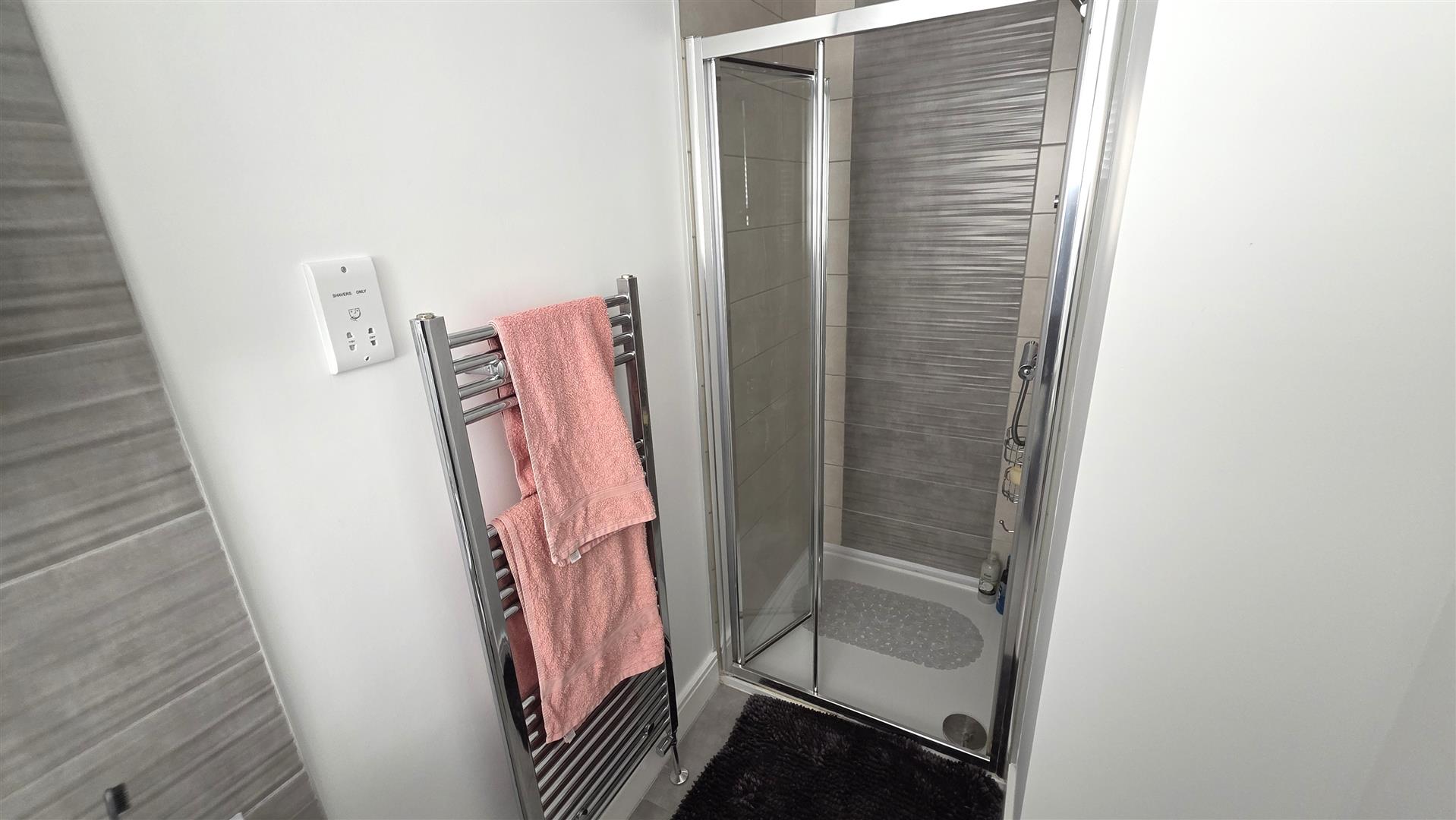 Modern white suite comprising a wall wall in closed shower with fully tiled splashback, and partially glazed folding door. Patastile wash hand basin with monoblock, chrome mixer, tap and floor to ceiling tiled splashback. Low flush push button w c. European shaver sockets. Fully tiled flooring. Extractor fan. Chrome towel radiator.
