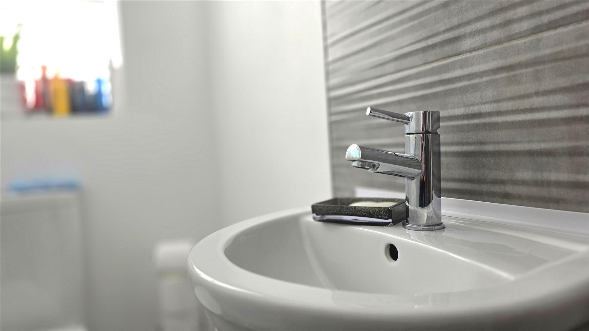 Modern white, sweet, comprising a panel bath with mains, shower over fully tiled.Splashback and partially glazed screen. A patastile wash on basin with mono block chrome mixer tap and florida's ceiling tiled splashback. Low flush push button w c. Fully tiled flooring. Extractor fan. Chrome towel radiator.