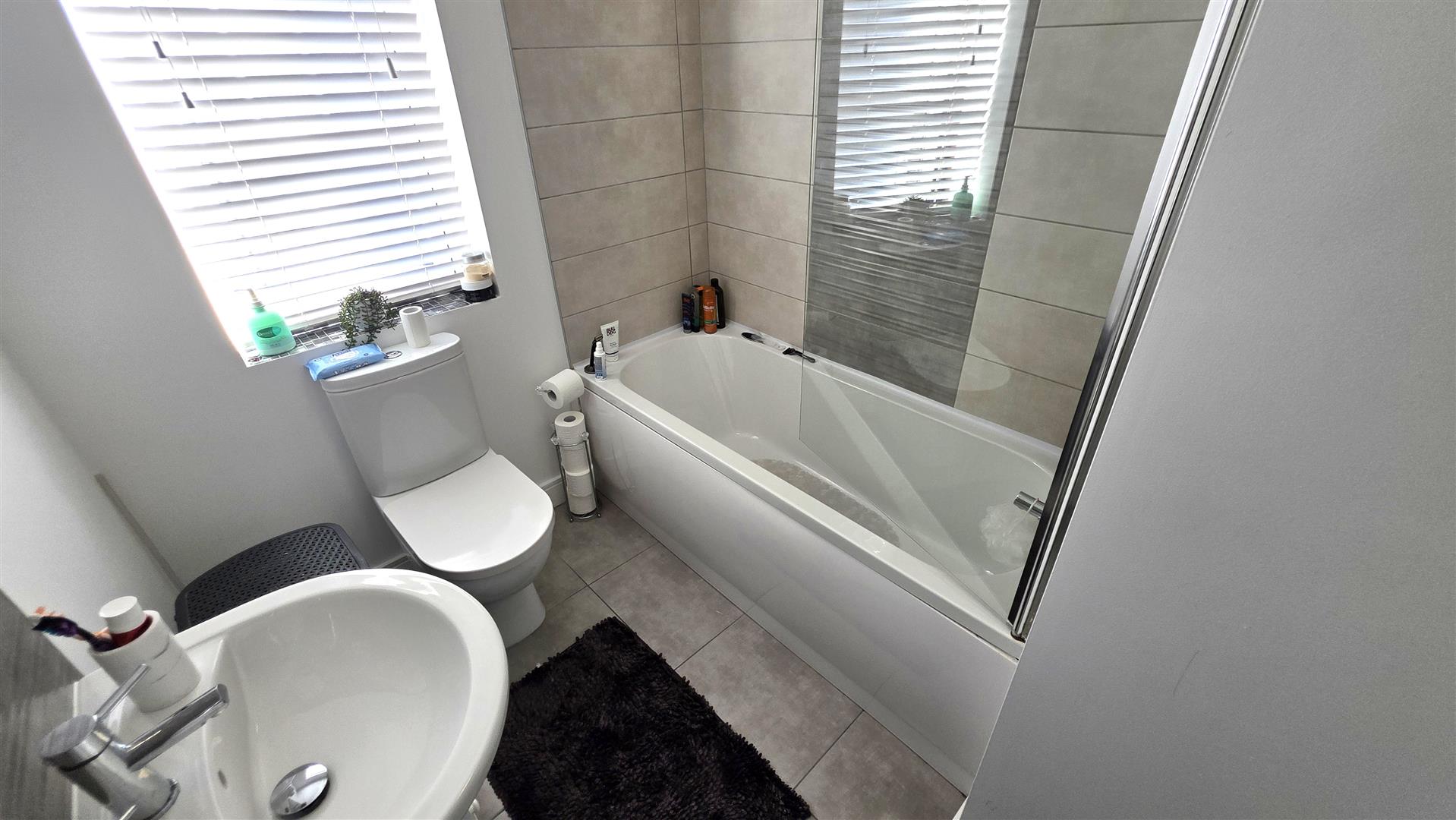 Bathroom with modern white suite to include panel bath and separate fully tiled shower cubicle