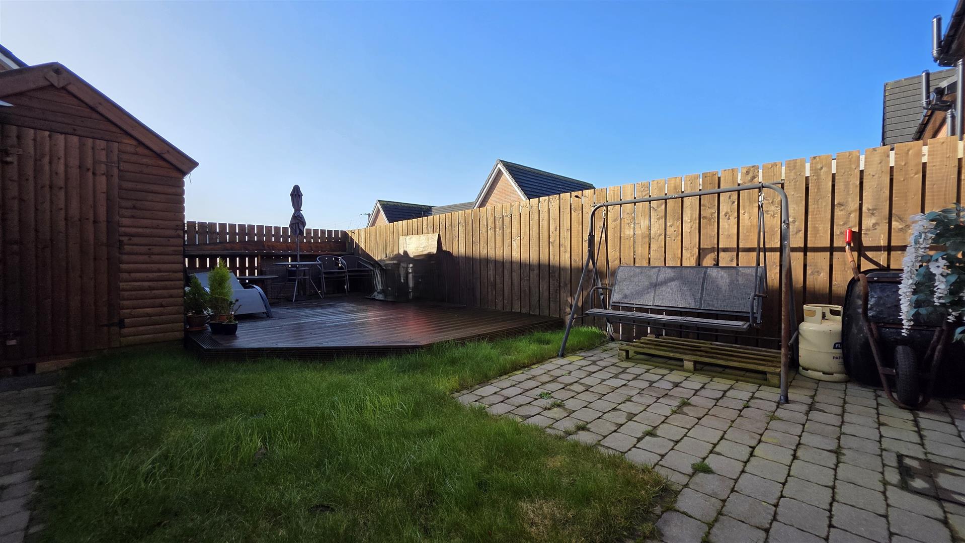A fully enclosed rear garden, with six foot timber fencing and pedestrian gate to front. Neat lawn and raised timber decking. Paved patio. Outside tap and outside lighting. Superb sun orientation and privacy.