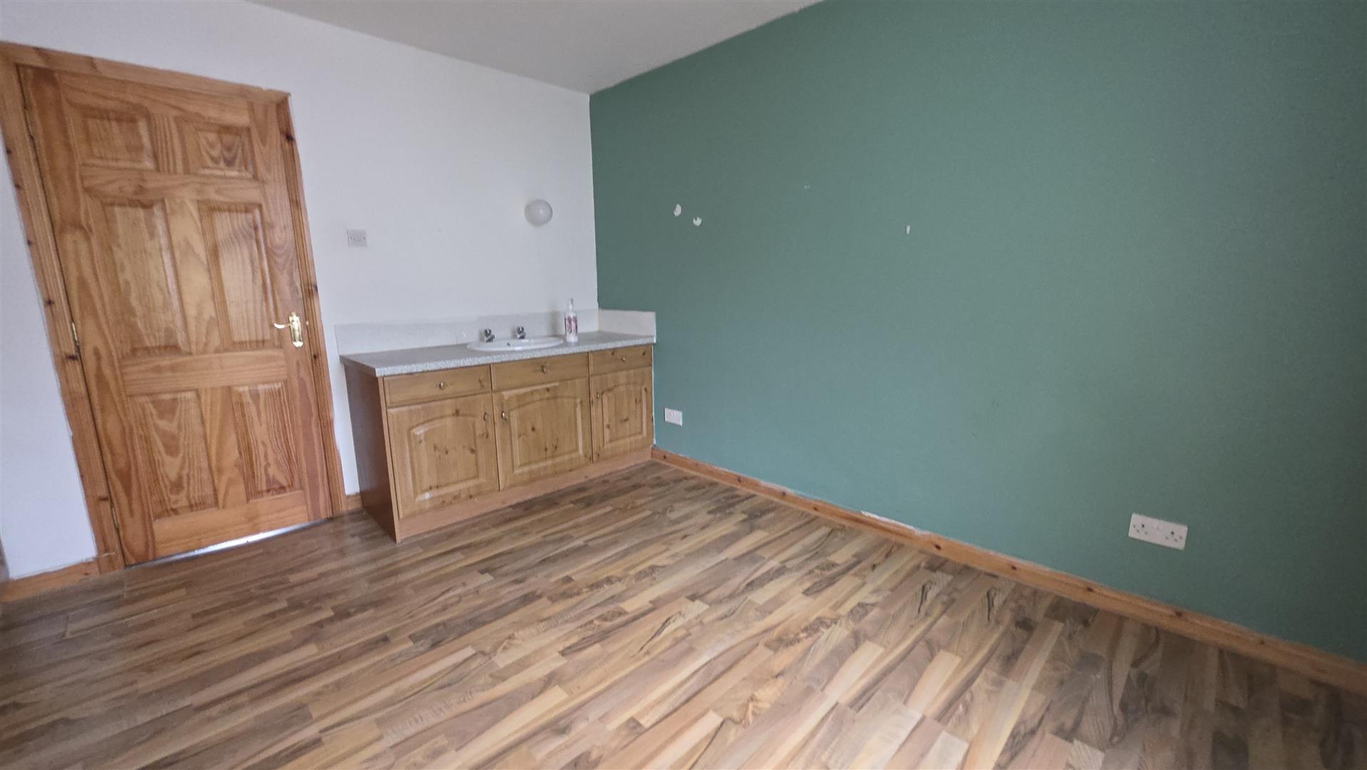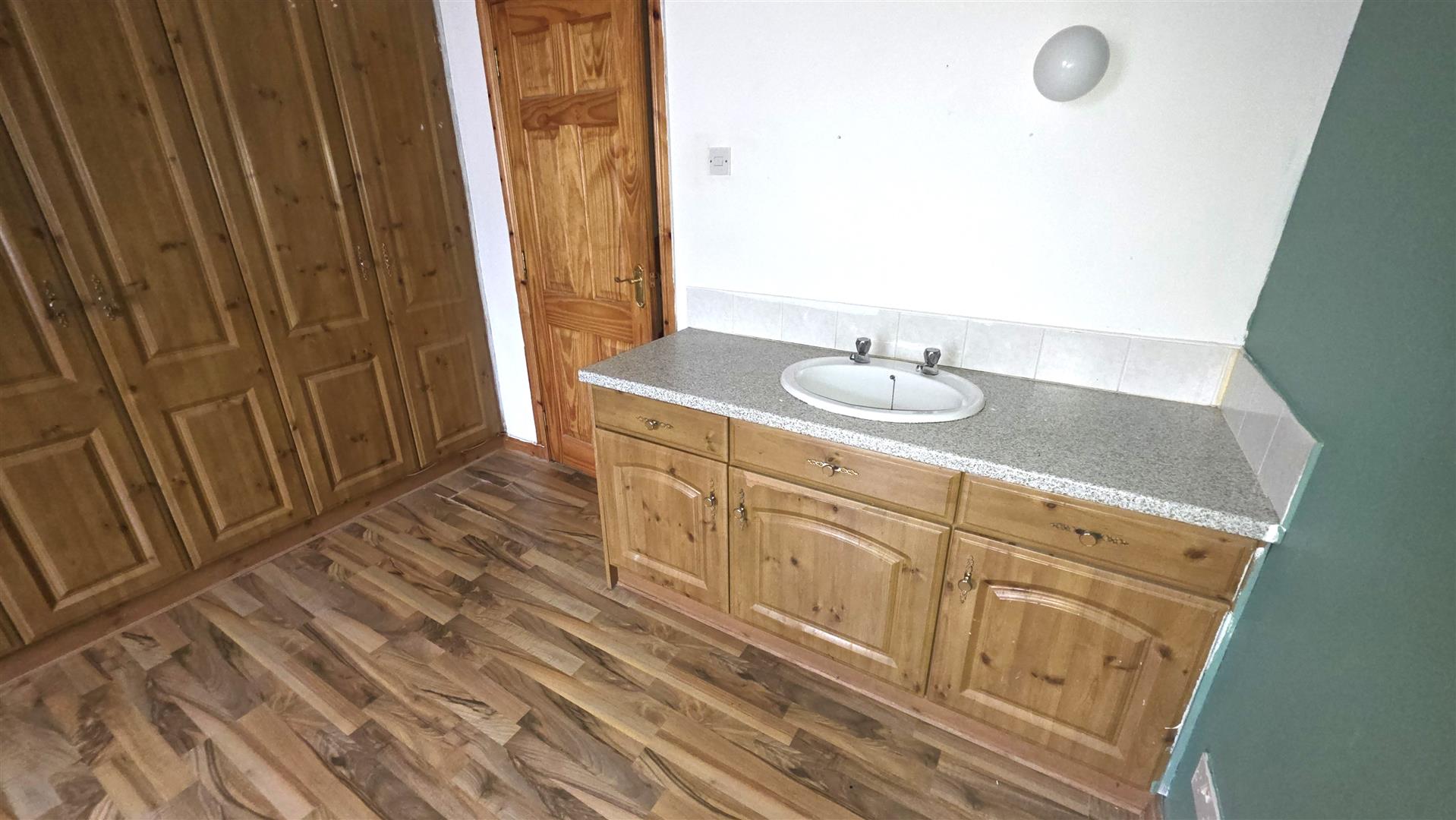 Wood laminate flooring. Integrated bedroom storage. Wash hand basin with storage unit below. Complimentary work surface and tiled splashback. Double radiator.