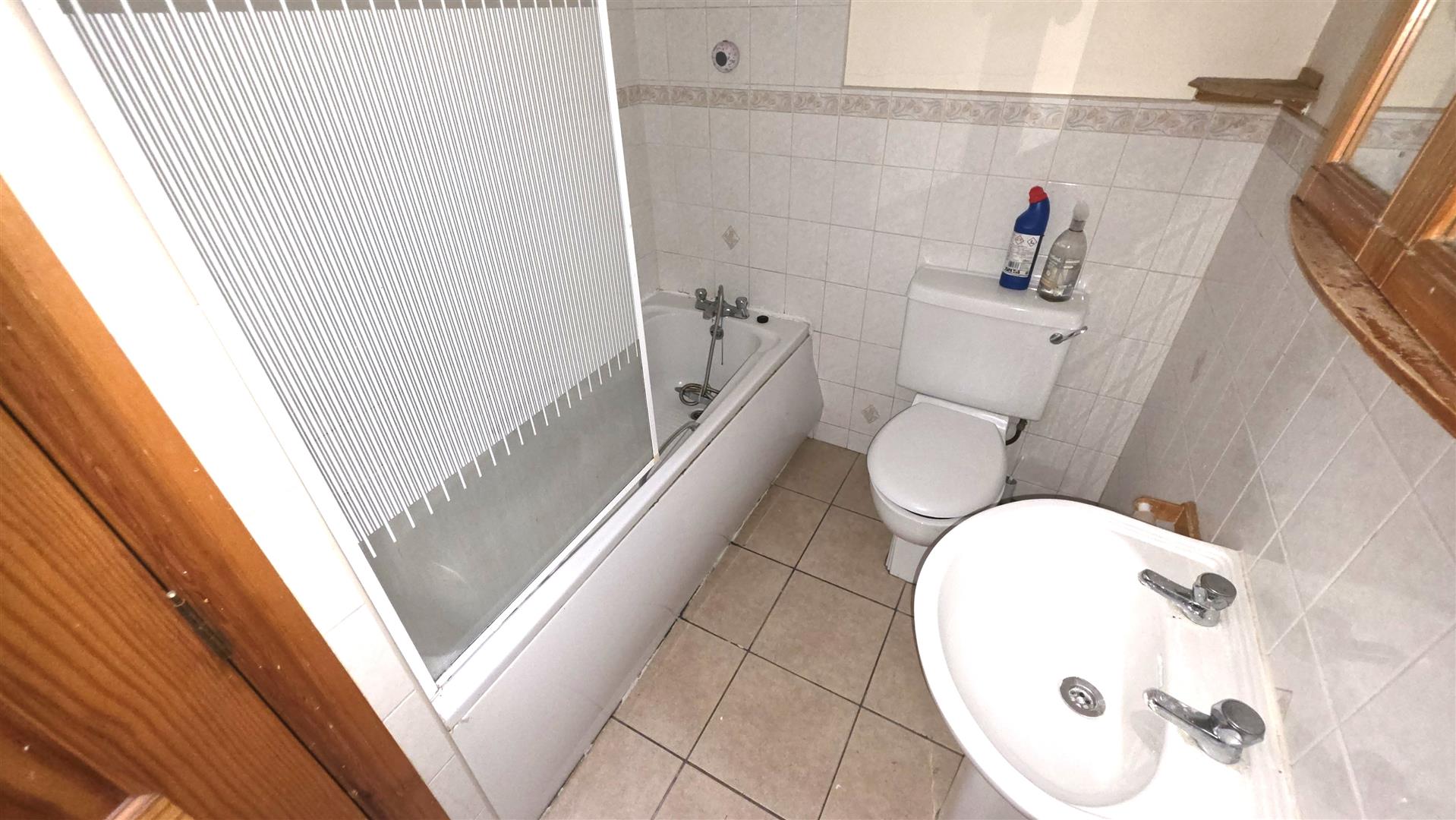 White suite comprising a panel bath with chrome mixer tap and 'Mira Jump' electric shower with partially glazed screen and fully tiled splashback. Pedestal wash hand basin with stainless steel hot and cold taps. Low flush WC. Tunnel skylight. Fully tiled floor and partially tiled walls. Hot press with insulated copper cylinder and shelving. Single radiator.