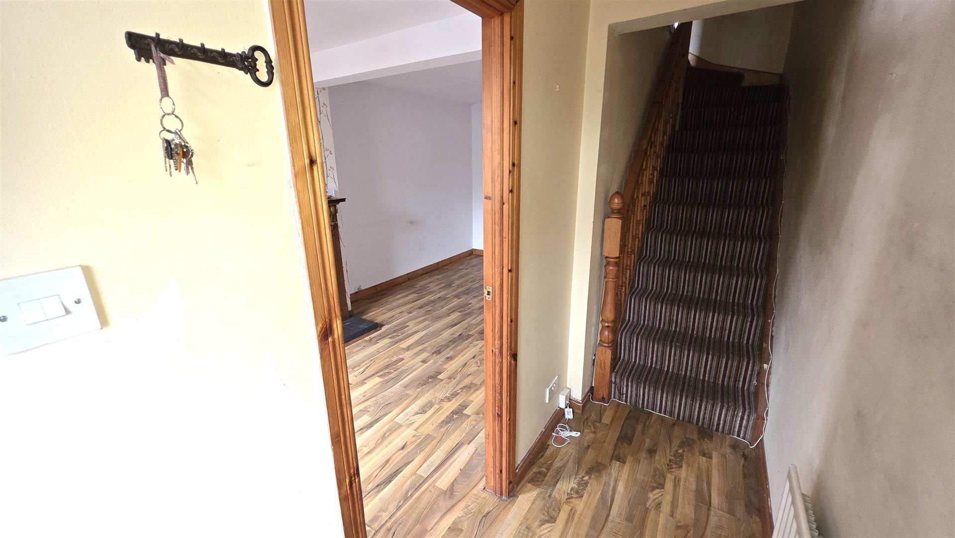 PVC double glazed door to entrance with wood laminate flooring. Staircase to first floor with moulded, handrail and turned balustrading. Single radiator.