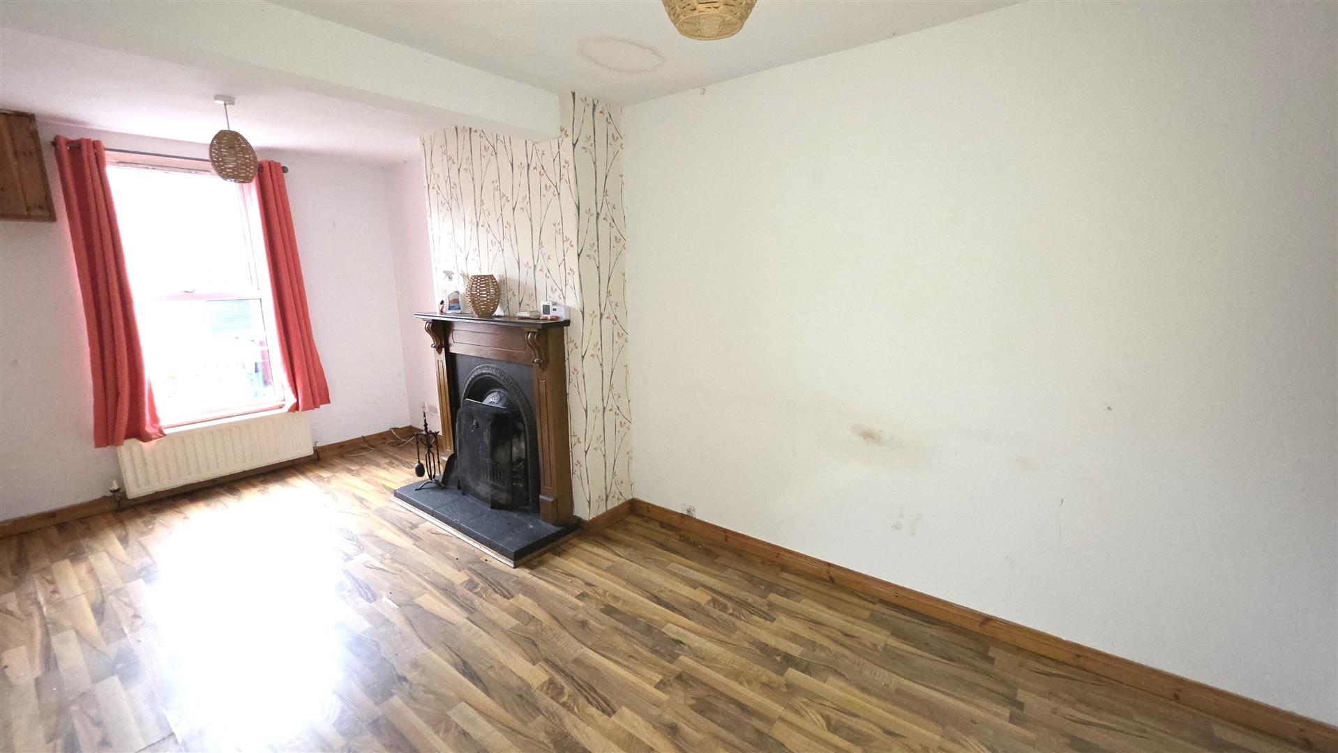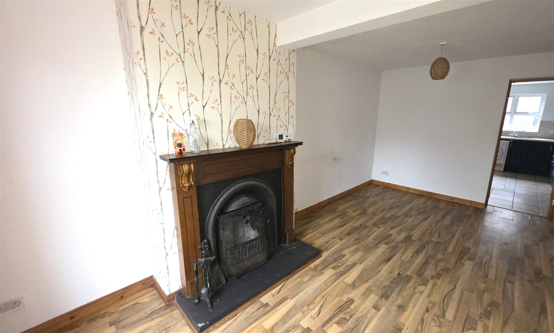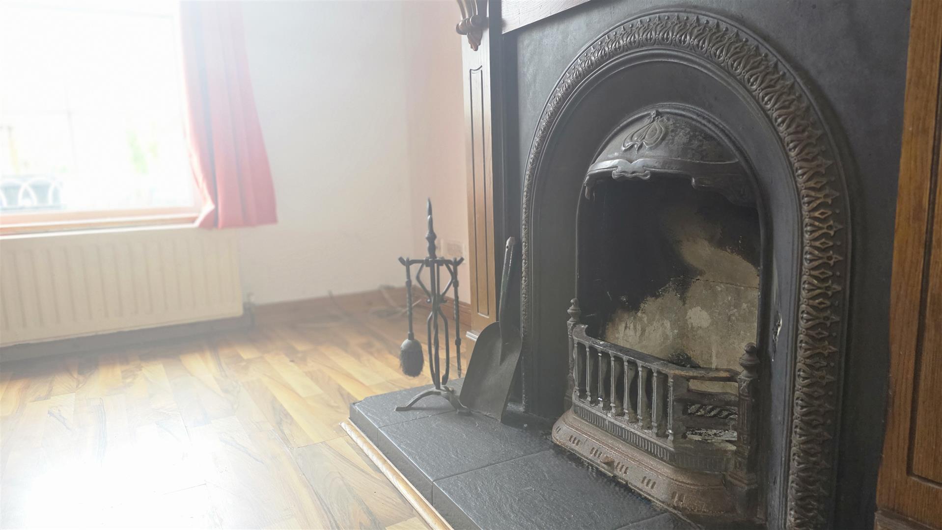 Feature open fire with cast iron inset, decorative iron and decorative wooden surround and slate effect tiled hearth. Wood laminate flooring. Understairs storage. Single radiator.