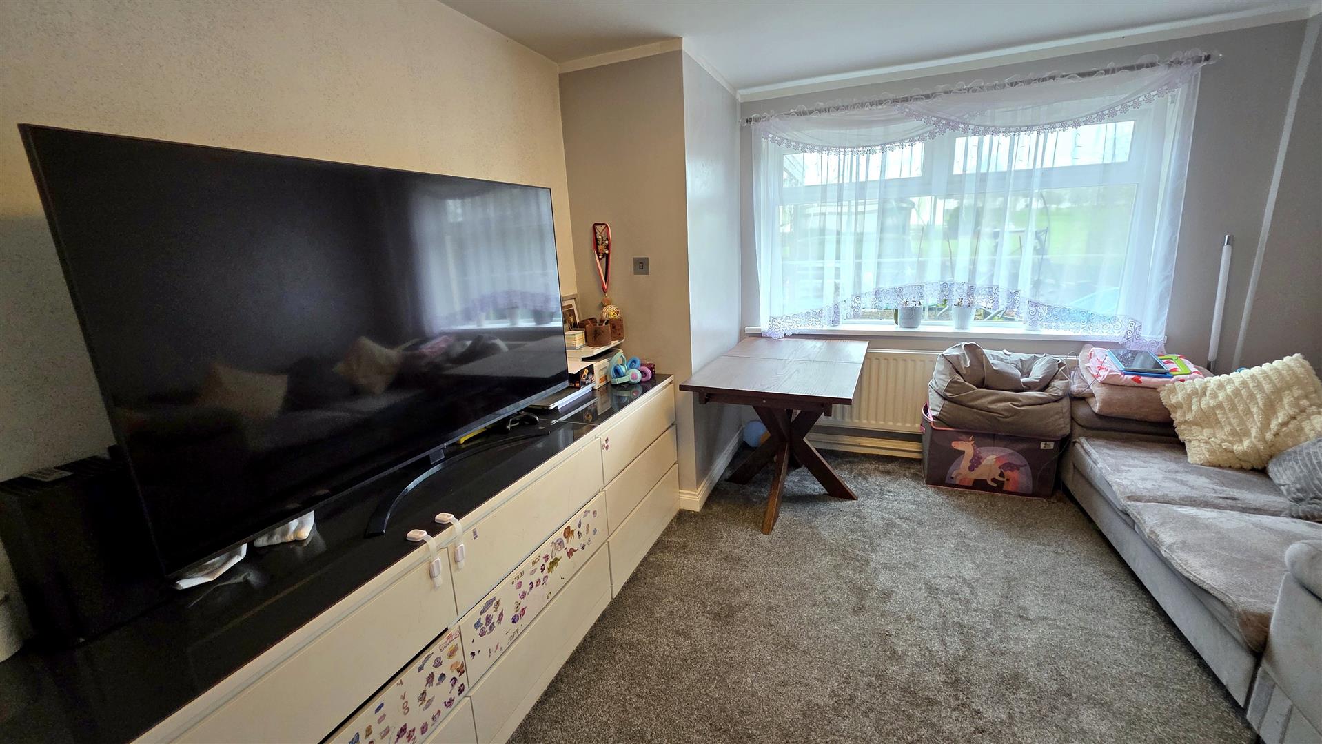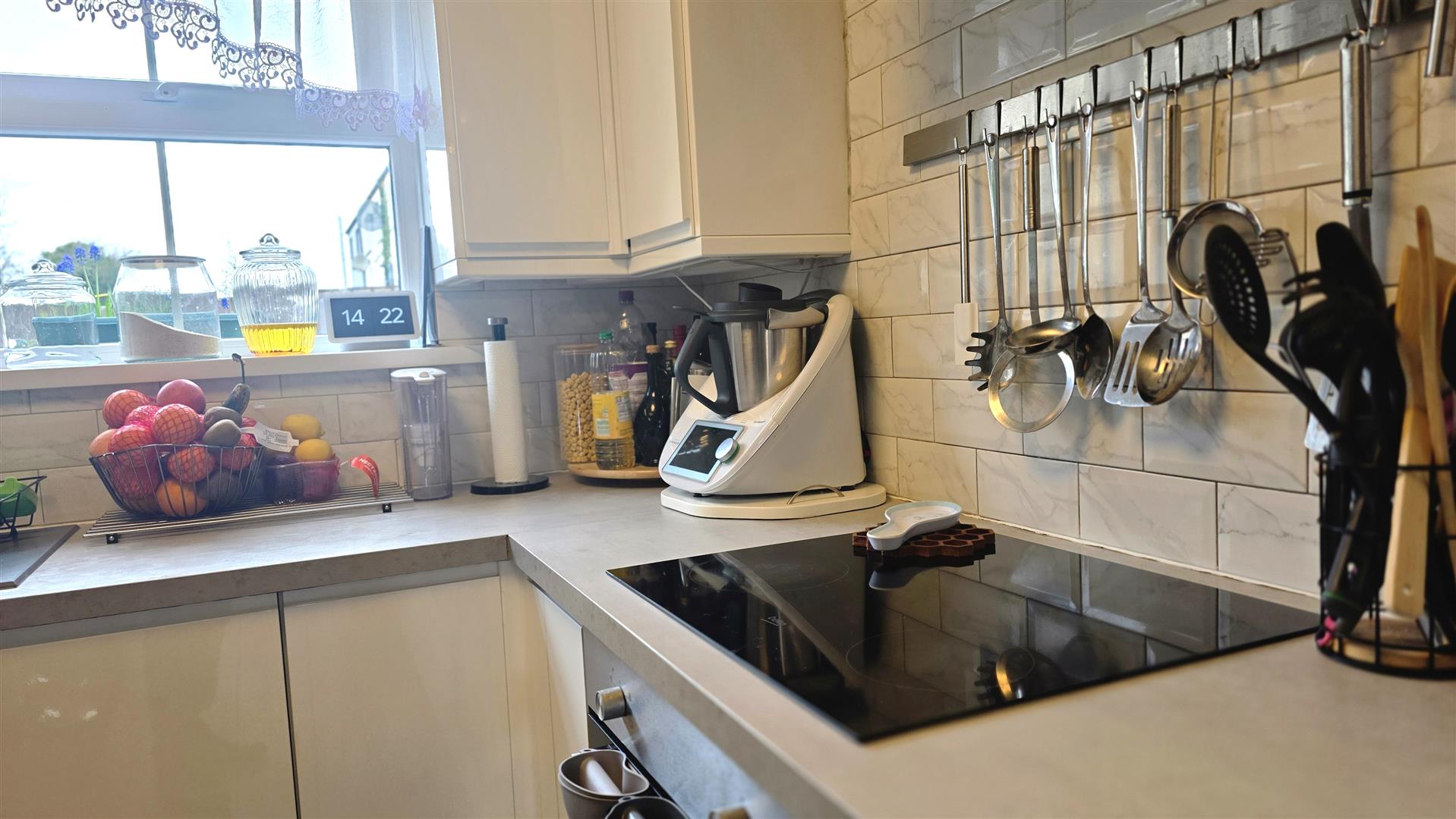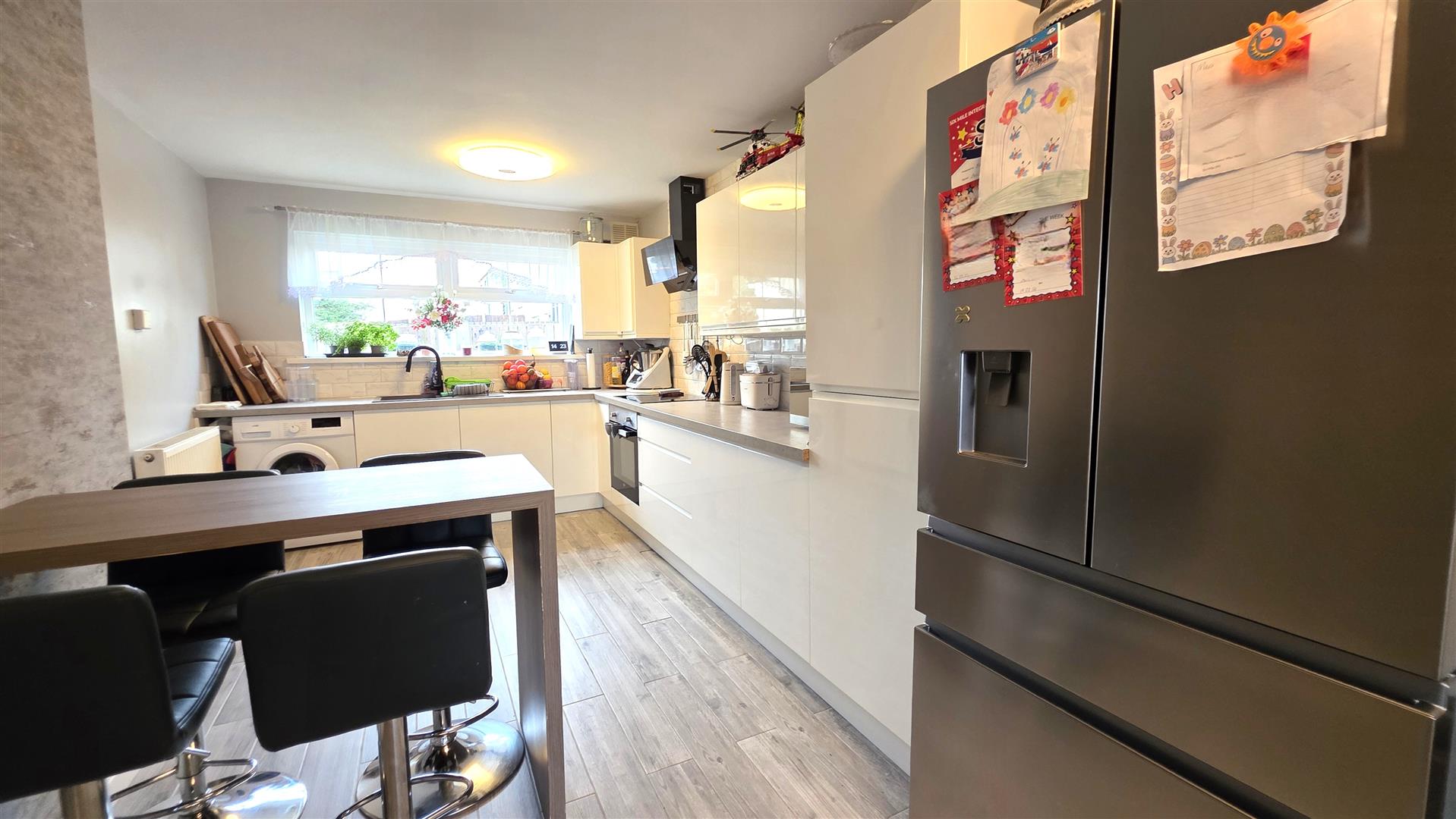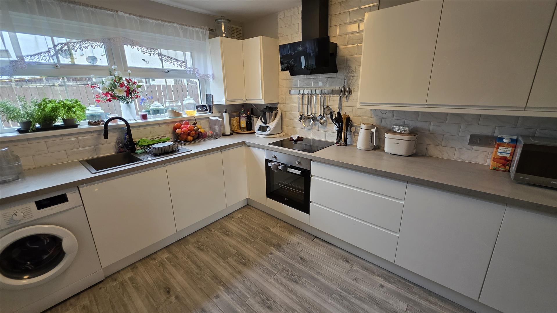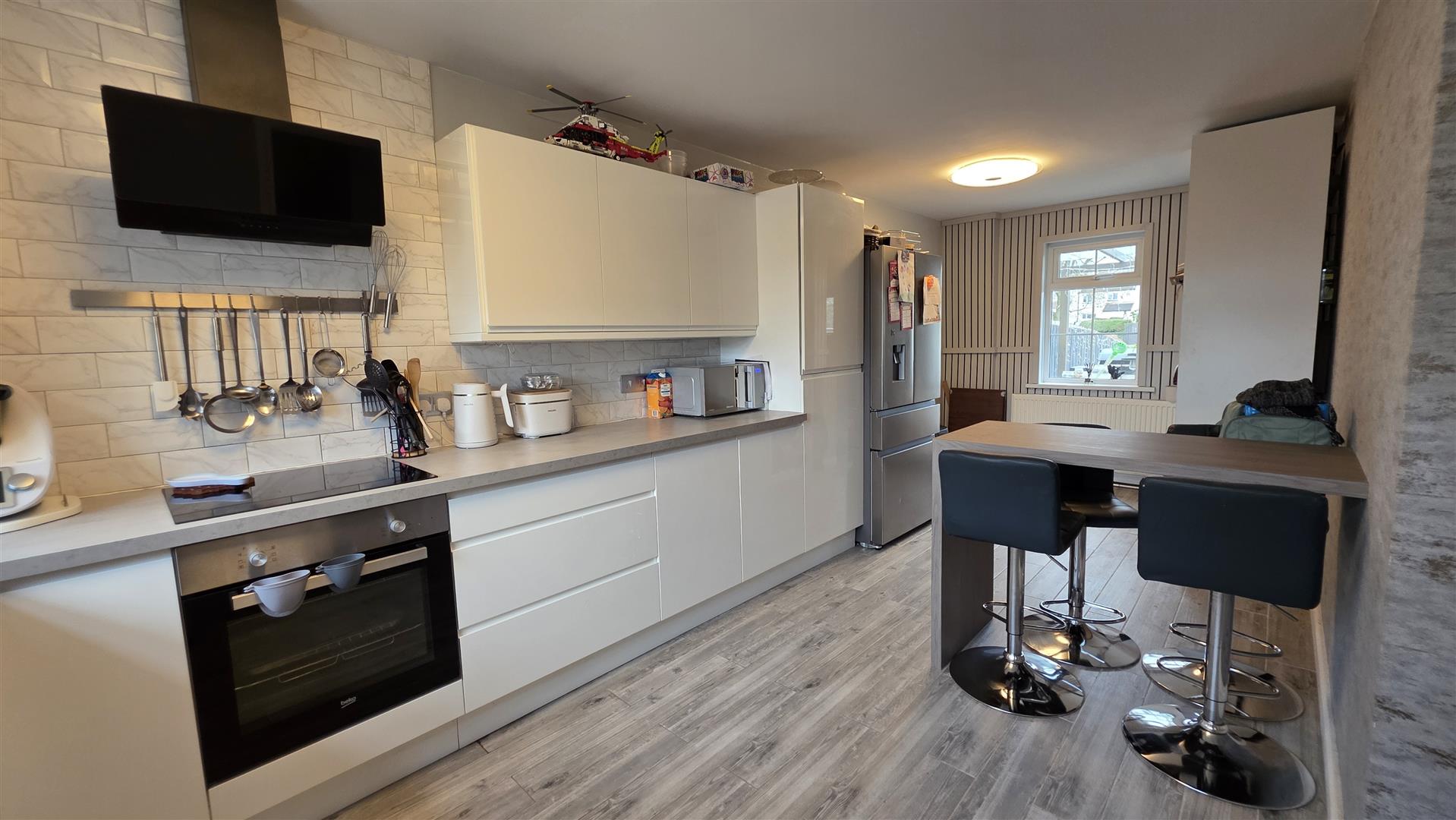 Full range of white contemporary style, high and low level handle less kitchen units with complimentary work surfaces and bevelled subway style splashback tiling. Over counter lighting. Single drainer ceramic sync unit with black mixer shower tap. Integrated appliances to include a four ring halogen hub with black glass angled overhead extractor fan. A low level combination of oven and grill, space for washing machine and space for an 'American' style fridge freezer. Broad board wood effect floor tiling. Peninsula with breakfast bar style seating. 2 x double radiators.