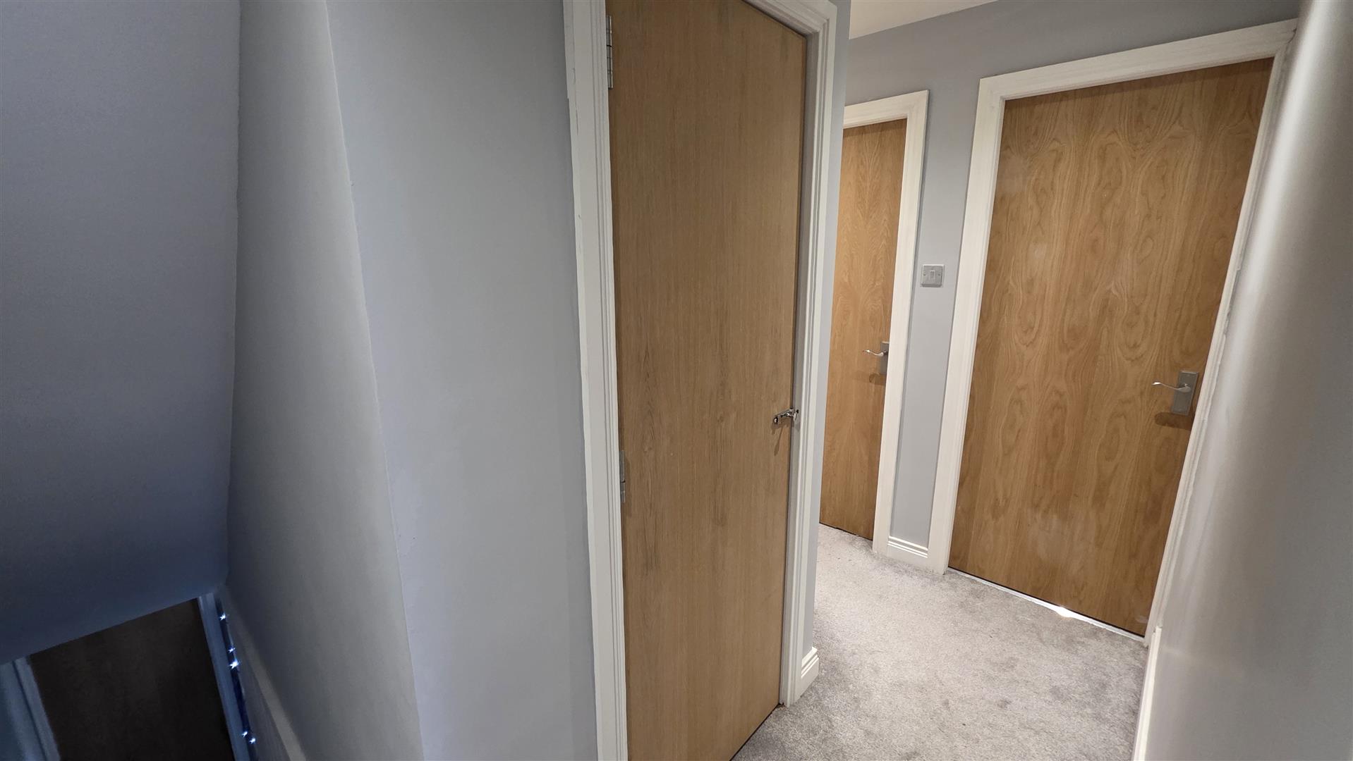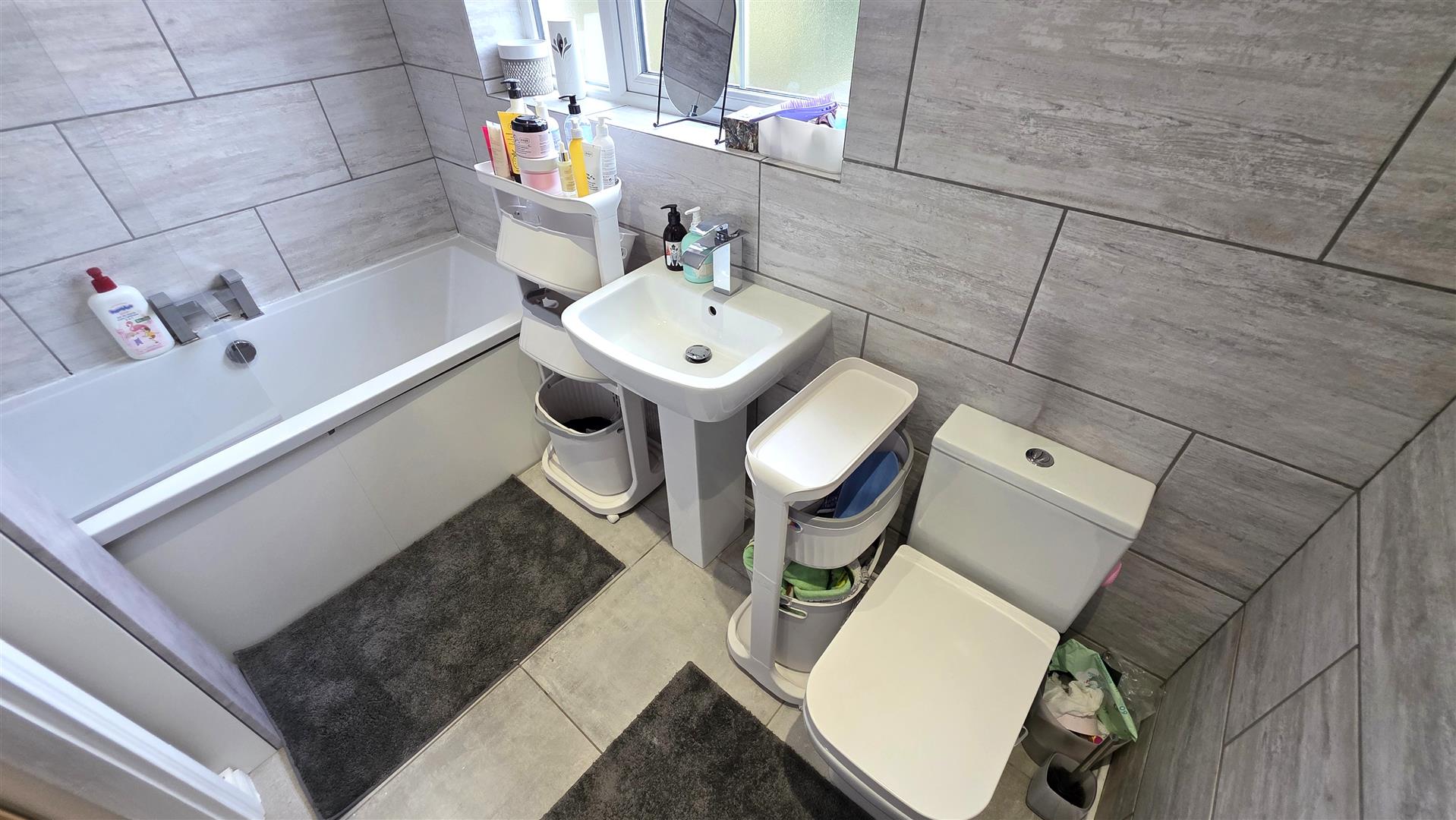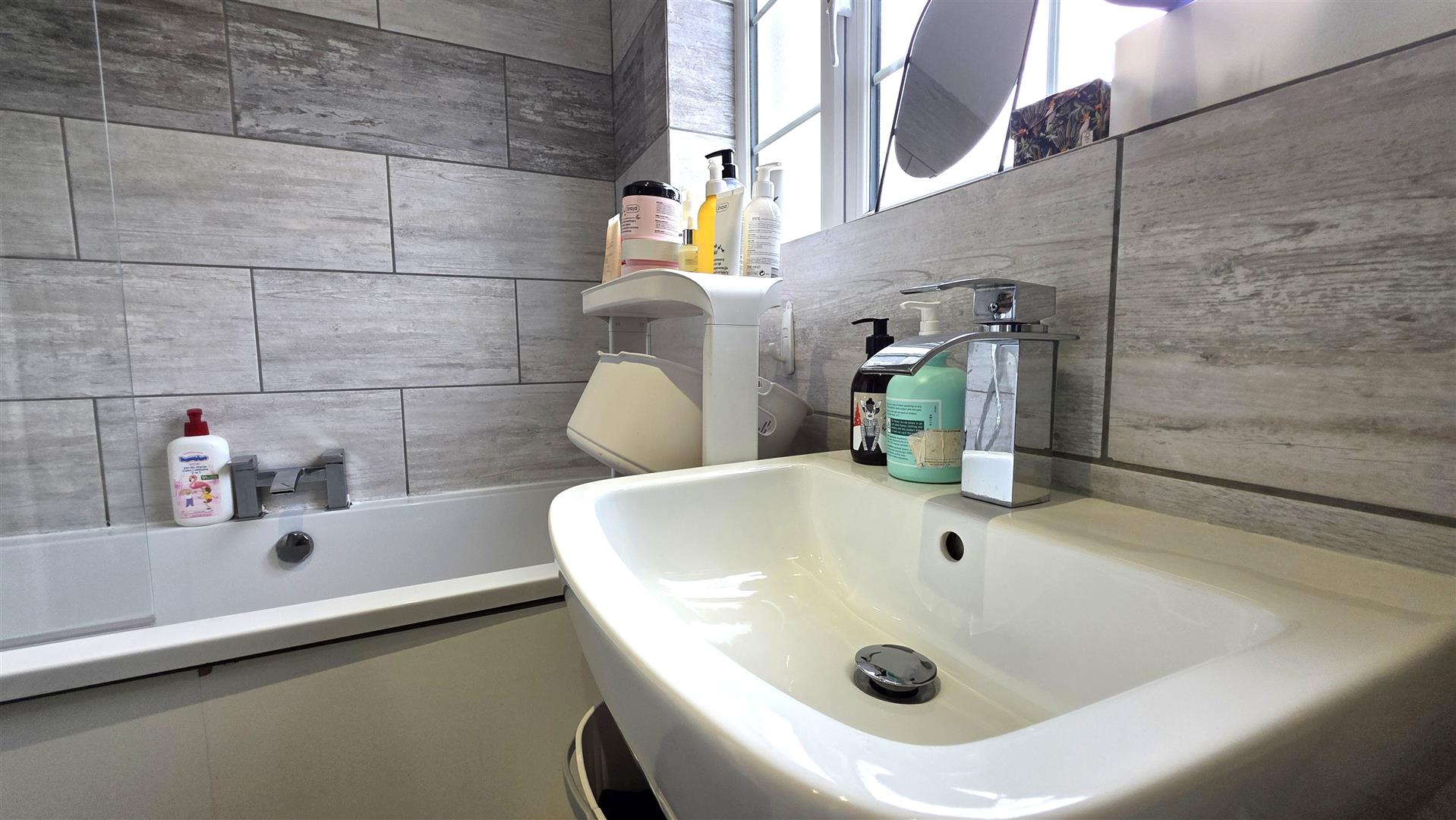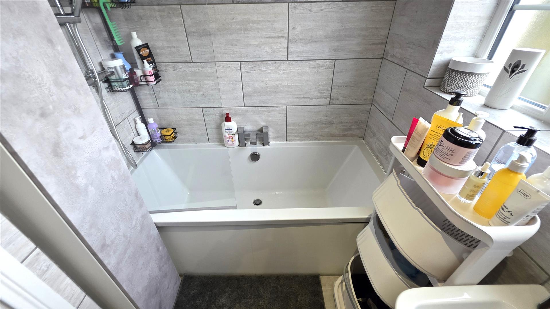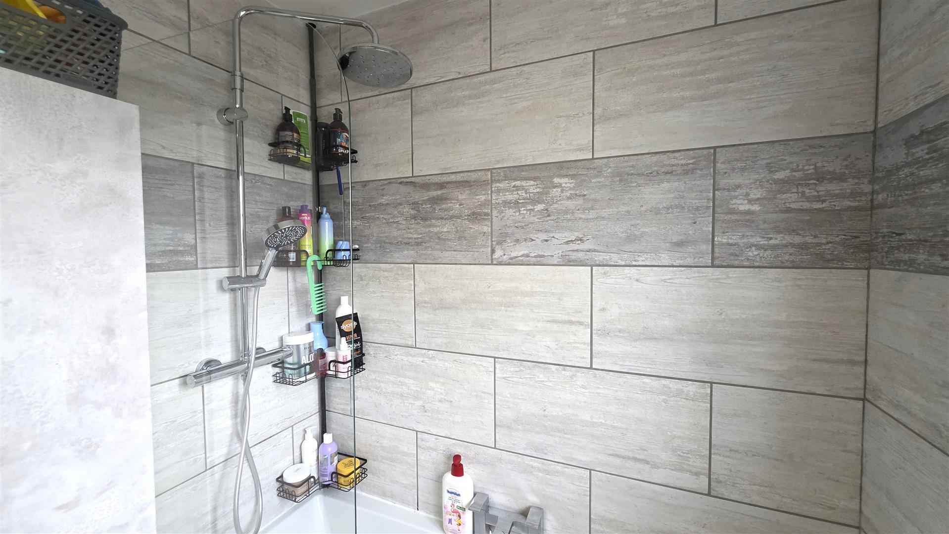 Modern white suite comprising a double ended panel bath with feature chrome mixer tap and mains shower over with 'Drench' shower head. A pedestal wash hand the basin with feature chrome 'Monobloc' mixer tap. A low flush push button WC. Fully tiled walls and fully tiled floors. Low voltage down lighting. Extractor fan. Chrome towel radiator.